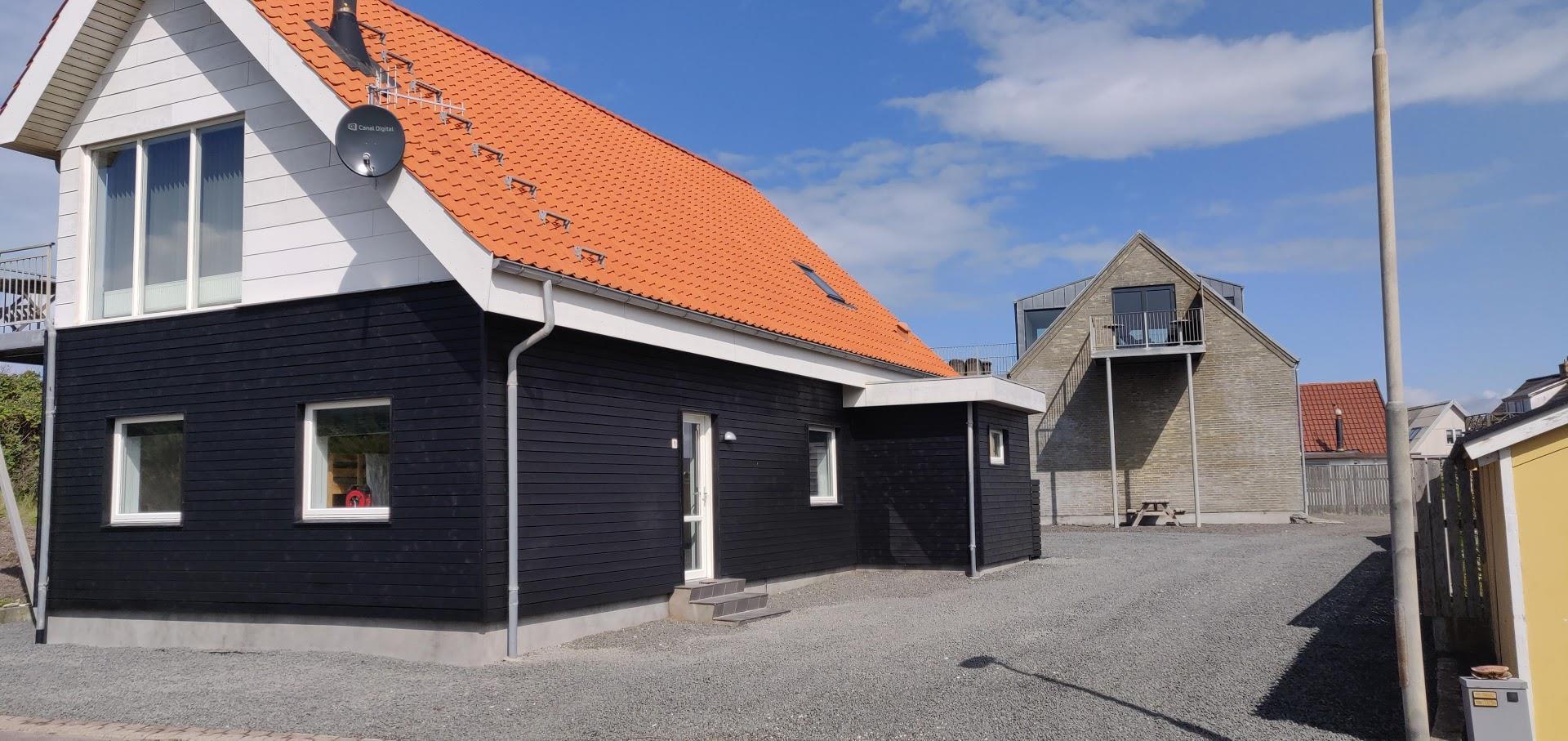 Husets grund ligger for enden af en blind vej tæt på stranden og der er muligt at parkere direkte ved huset. Balkonen er sikret via indhegning og her er naturligvis havemøbler til alle beboere i huset.