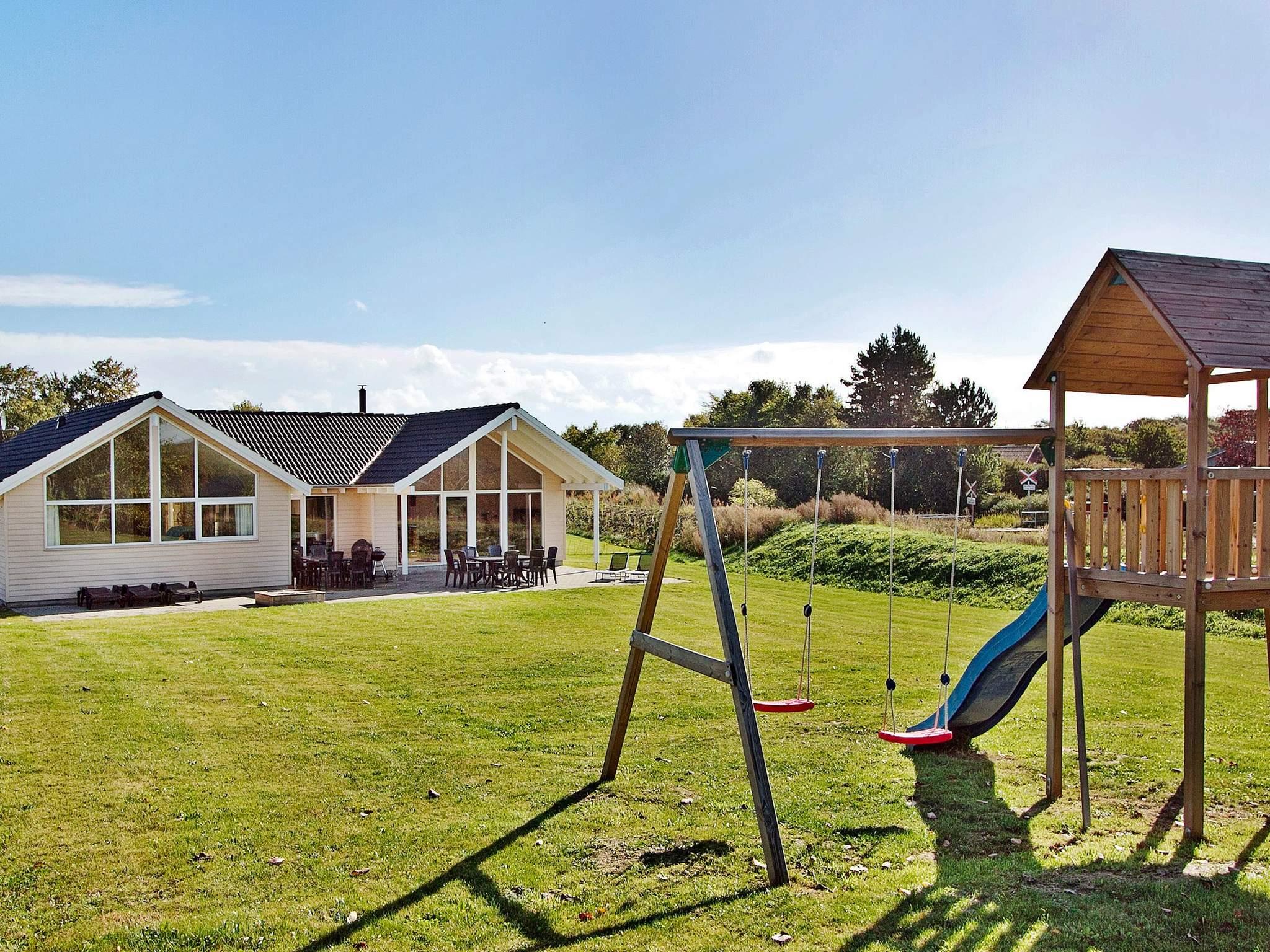 På den store grund, der omkranser huset, er der også tænkt på de mindste gæster med sandkasse og gynger. De voksne kan slænge sig på en solvogn på terrassen.