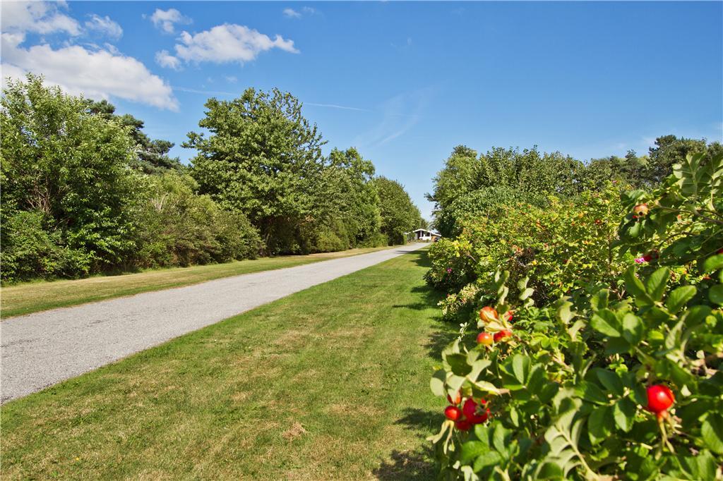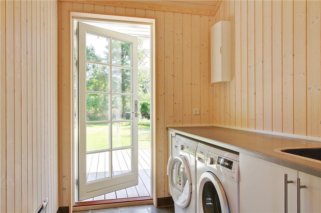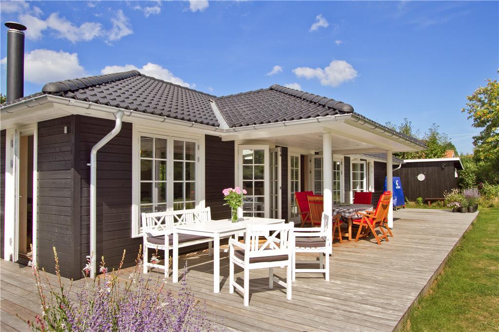 Udenfor venter en stor, delvist overdækket træterrasse på husets bagside, hvor du kan nyde solen fra en komfortabel liggestol eller slappe af i skyggen under træerne. Den velholdte græsplæne er omkranset af en tæt hæk, hvilket skaber en uforstyrret oase for både leg og afslapning. Terrassen er perfekt til hyggelige grillmiddage, lange sommeraftener under åben himmel eller blot en stille stund med en kop kaffe i hånden. Huset har desuden en bred indkørsel med plads til to biler, så du nemt kan parkere ved ankomst.