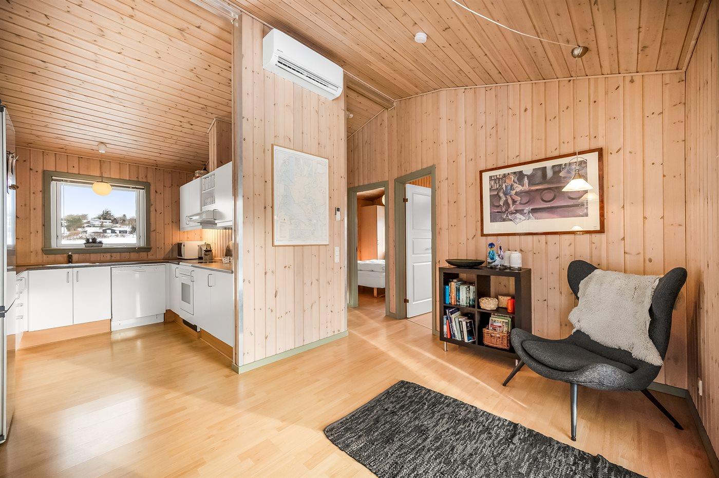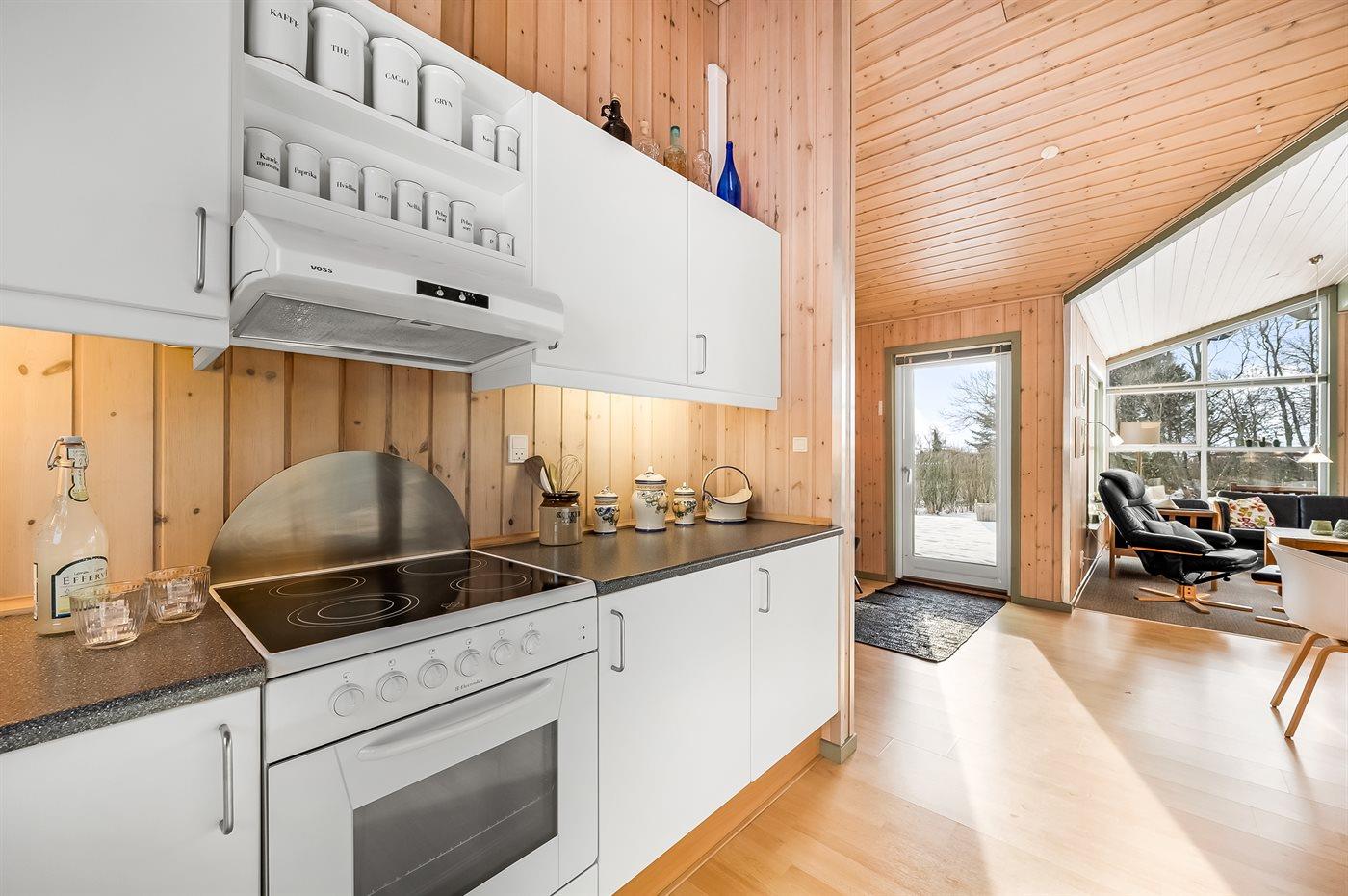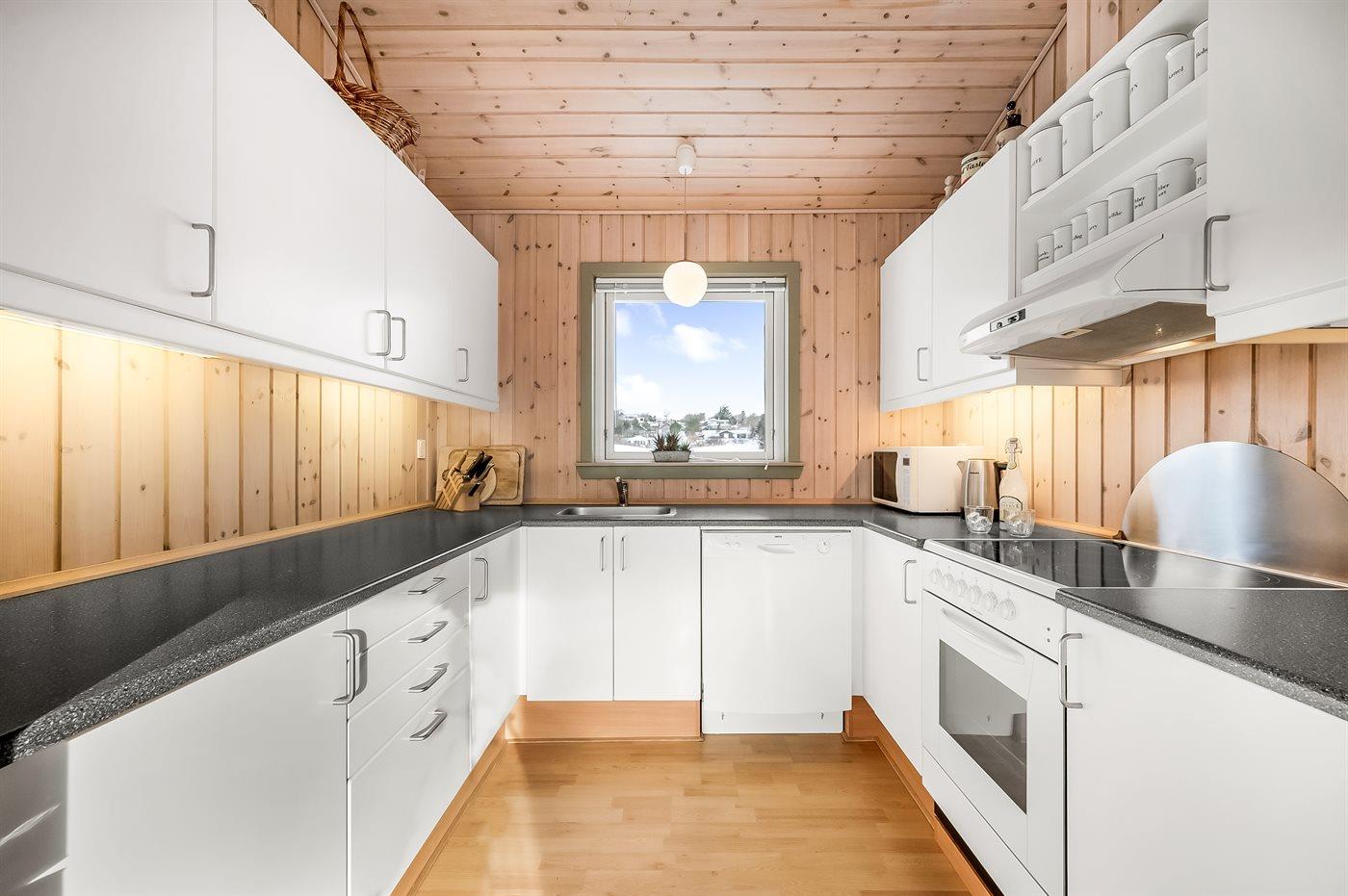 Køkkenet er udstyret med 1 køleskab. Der er 4 keramiske kogeplader, varmluftovn, mikrobølgeovn samt opvaskemaskine.