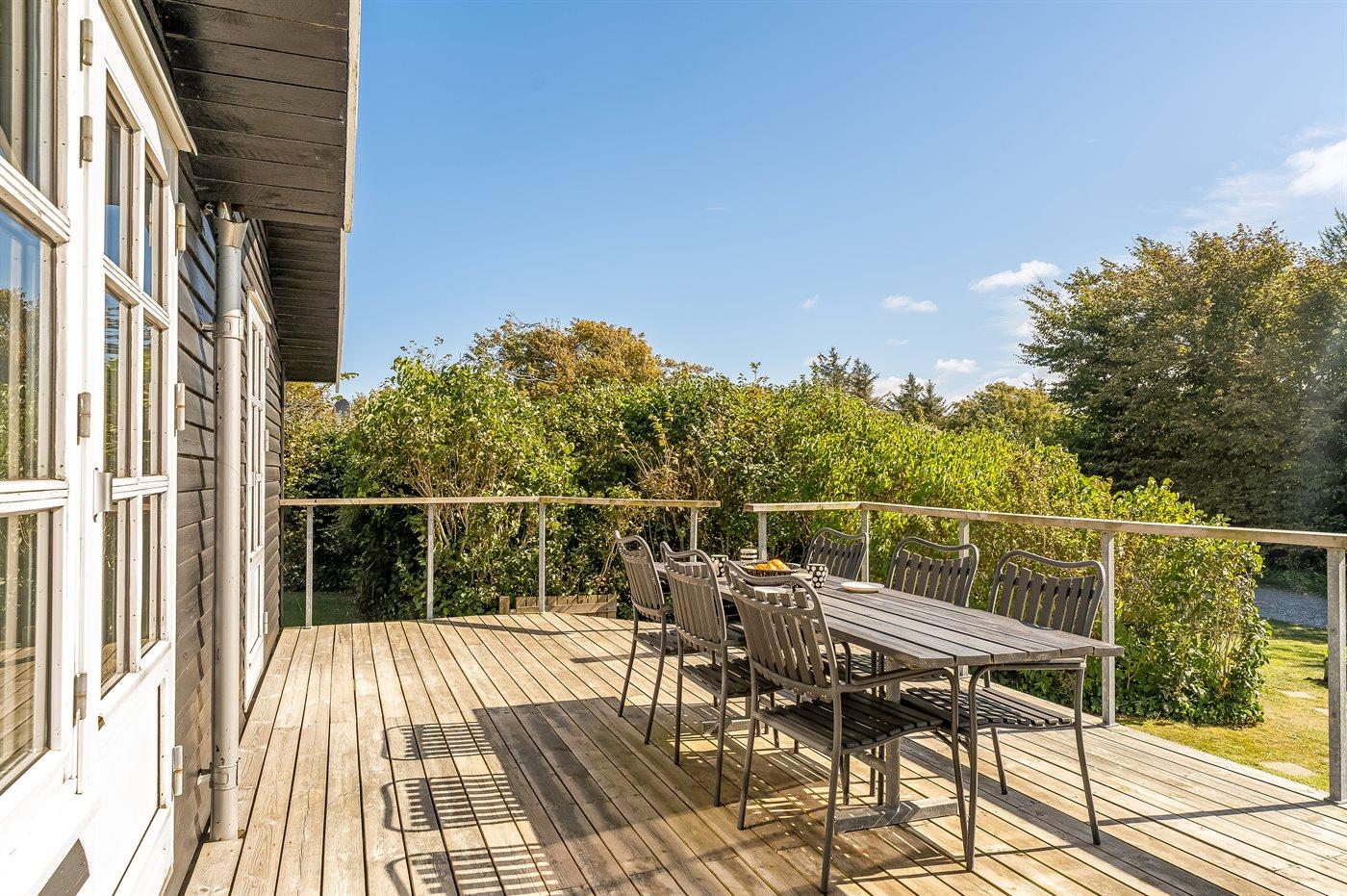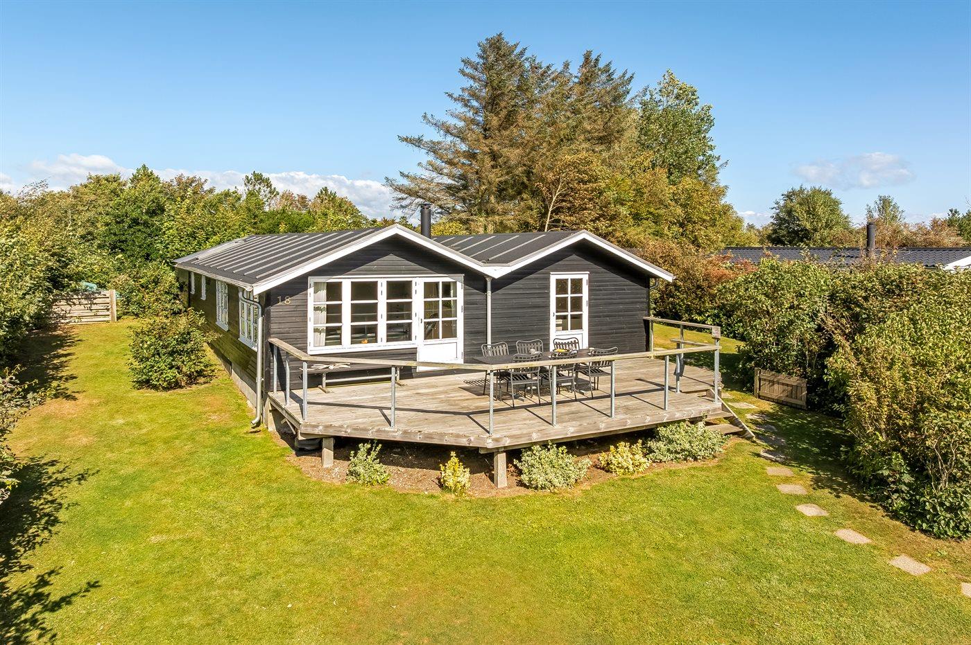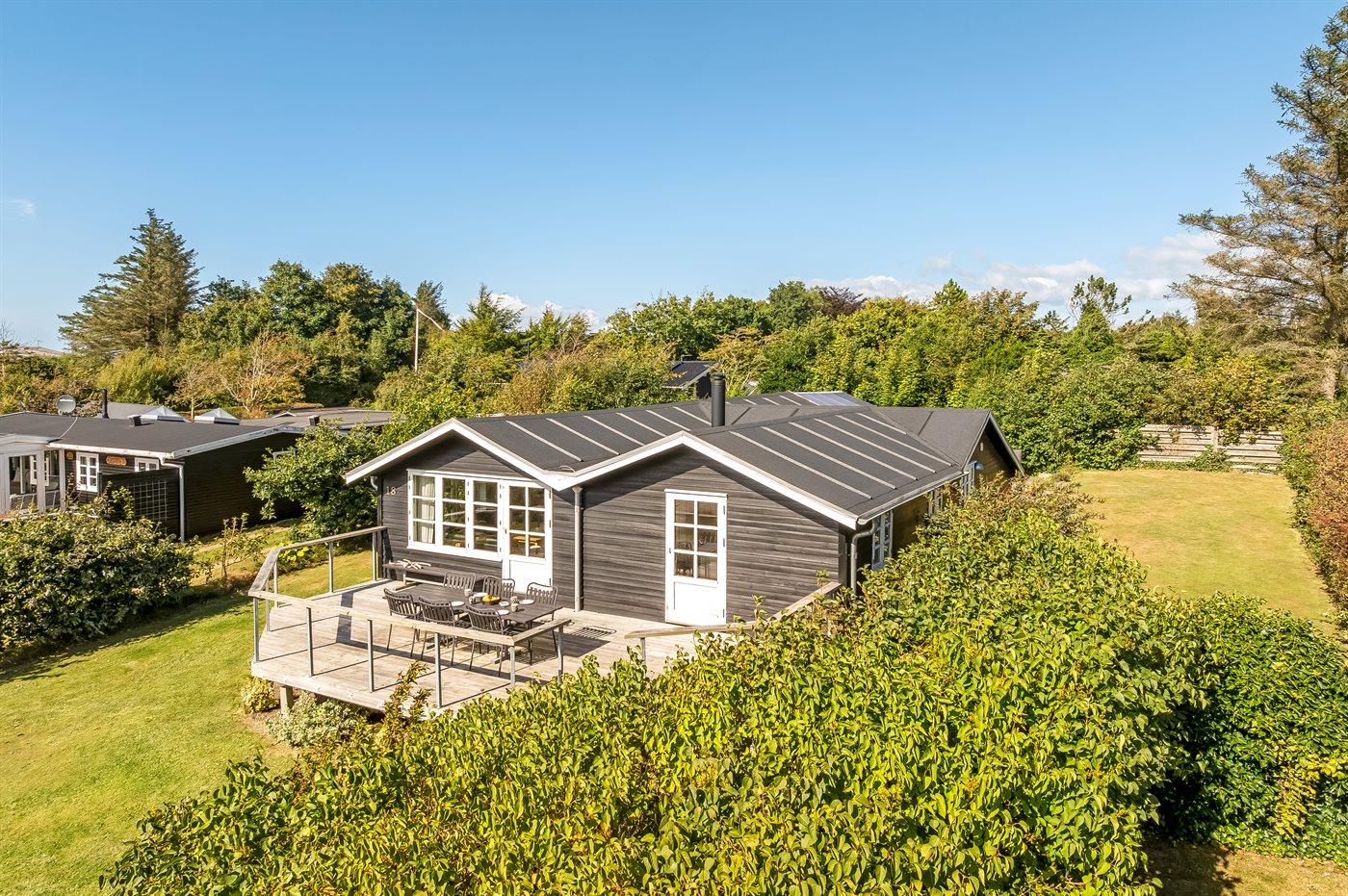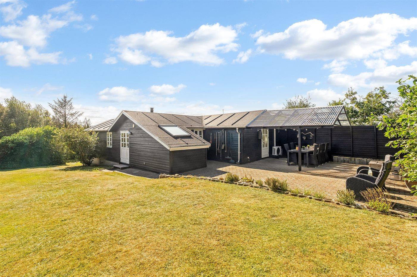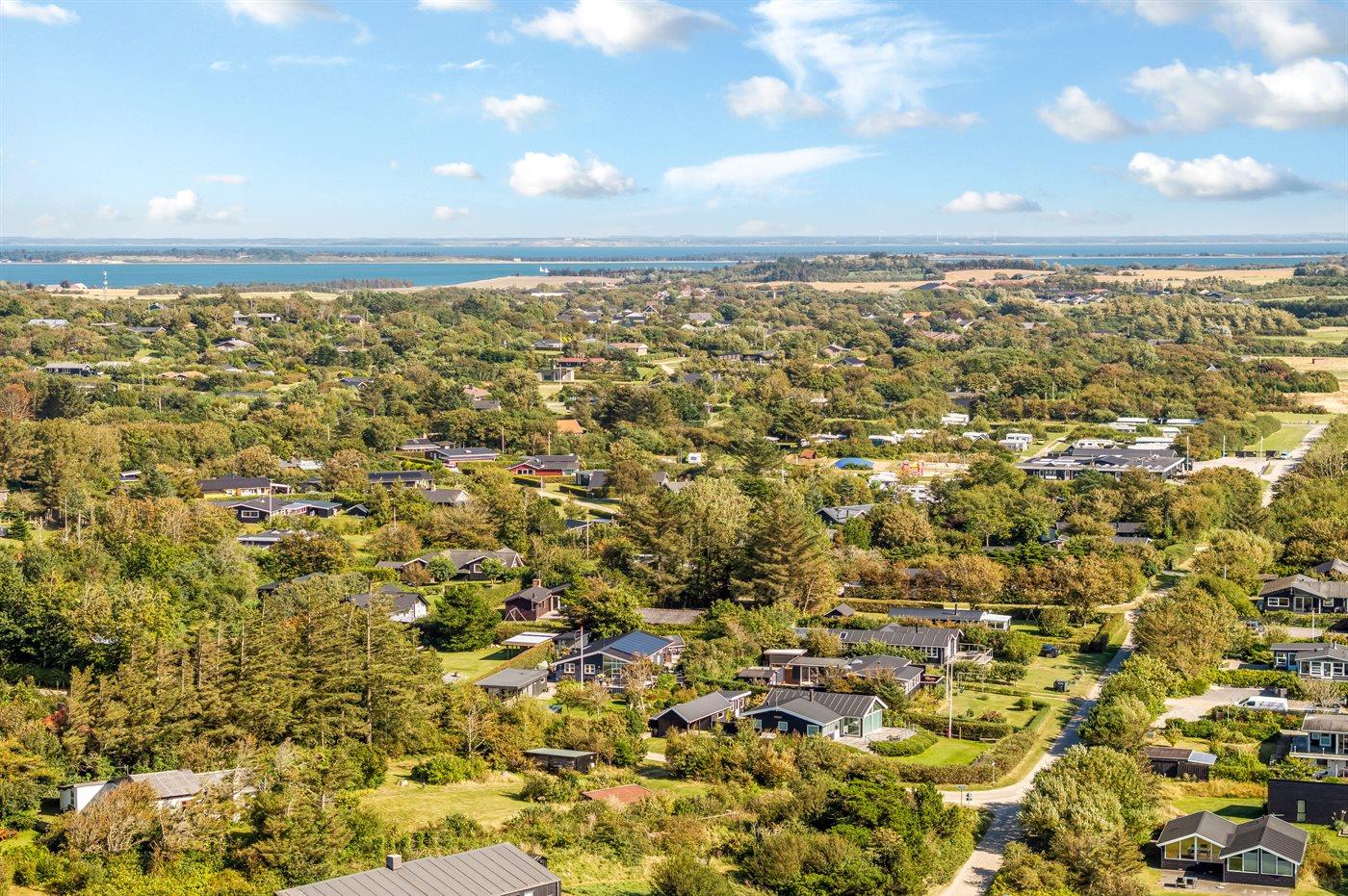 Højt beliggende på 702 m2 kuperet grund i Toftum Bjerge ligger dette charmerende fritidshus. Med skøn udsigt til Limfjorden fremstår huset i bedste fritidshusstil. Udsigten er særlig smuk fra den hævede sydvendte træterrasse, og bag huset kan man sidde fuldstændig ugeneret på en skøn delvis overdækket fliseterrasse. Der er overvejende anlagt græsplæne i den kuperede have med omkransende tæt beplantning.