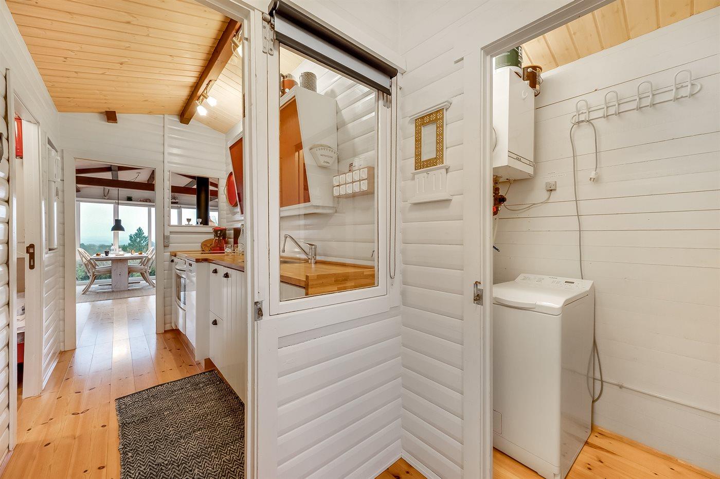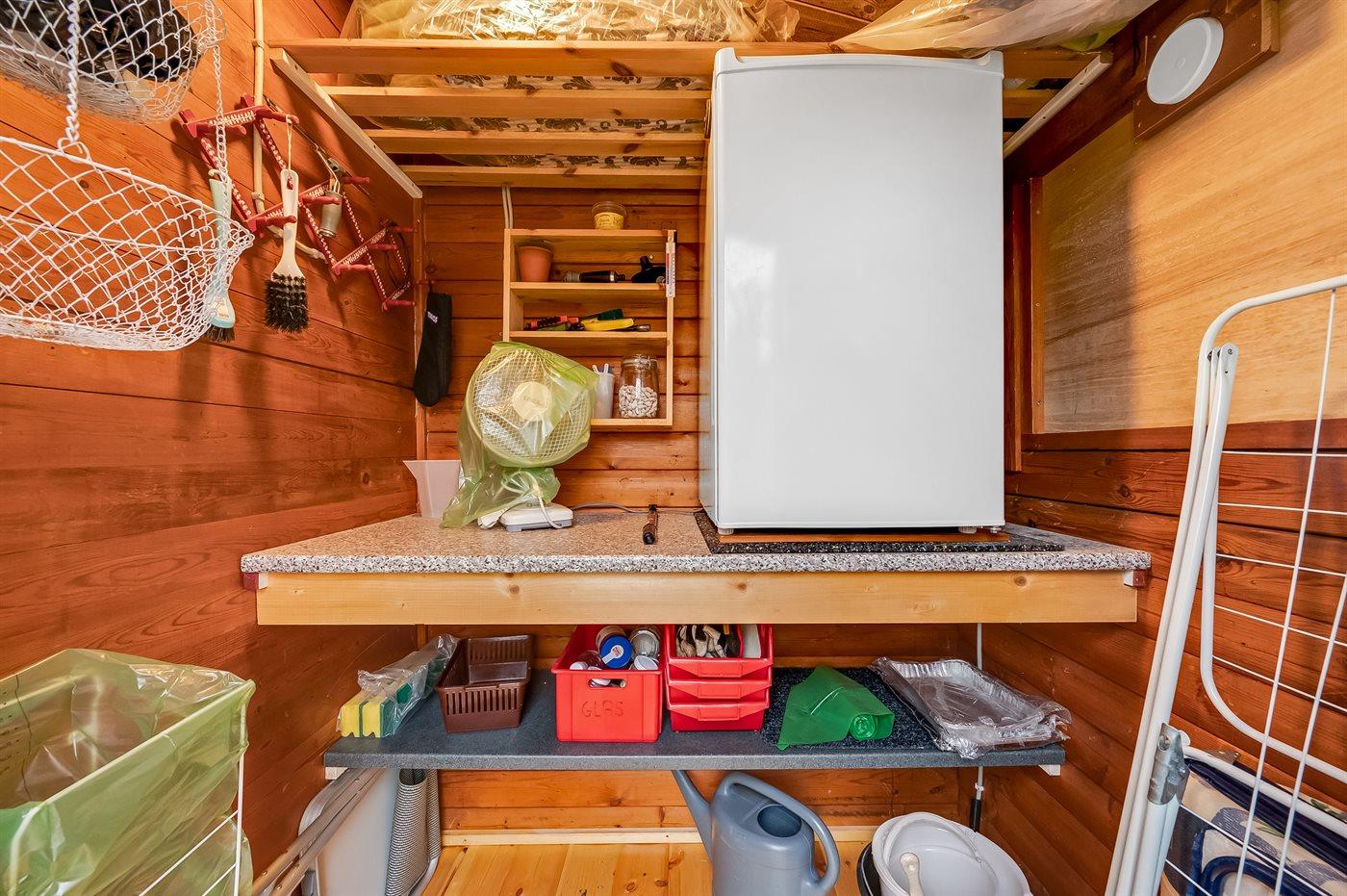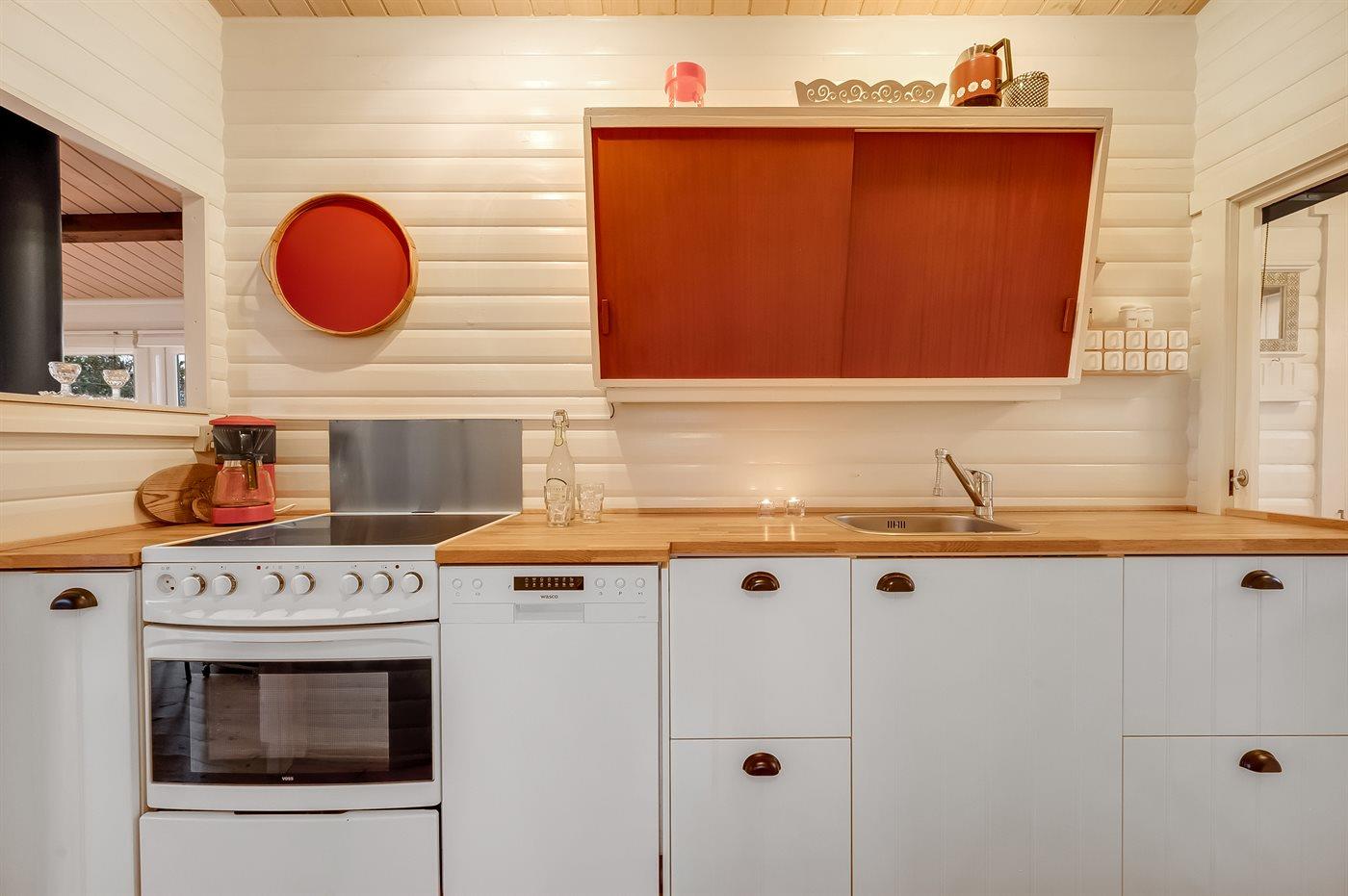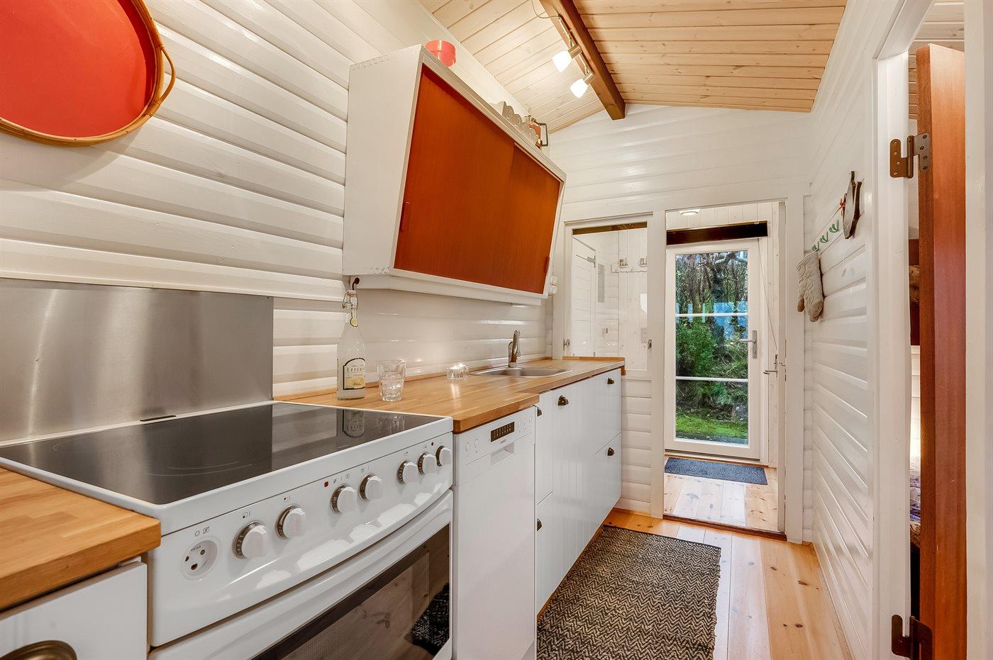 Køkkenet er udstyret med 1 køleskab. Der er 4 keramiske kogeplader, varmluftovn, mikrobølgeovn samt opvaskemaskine.