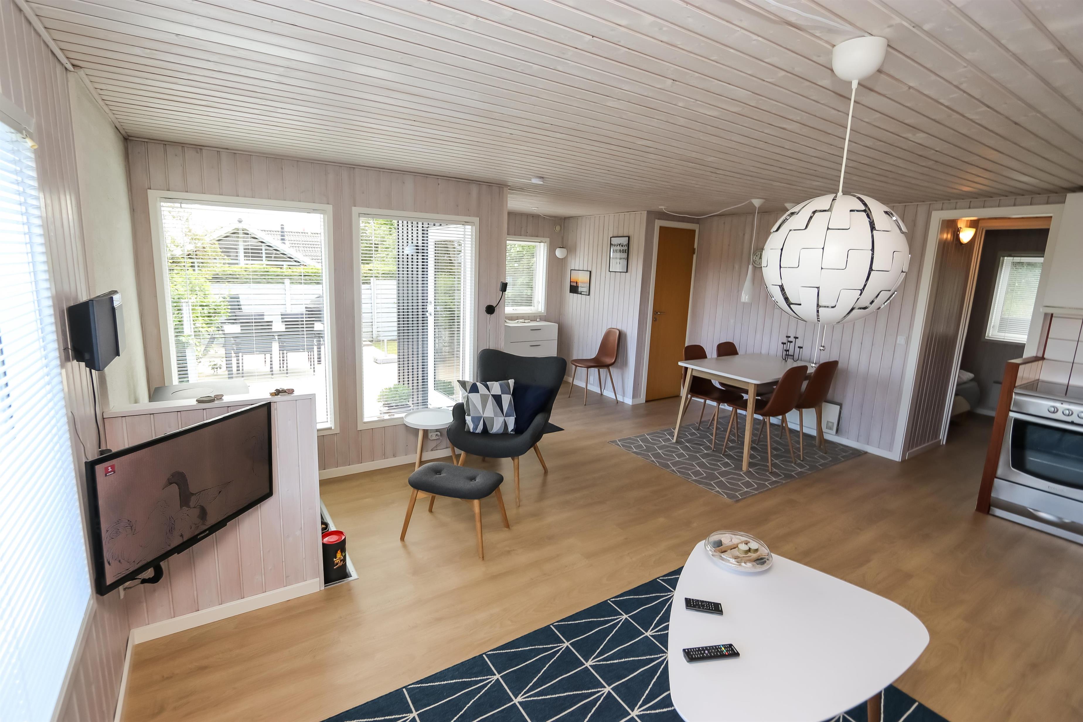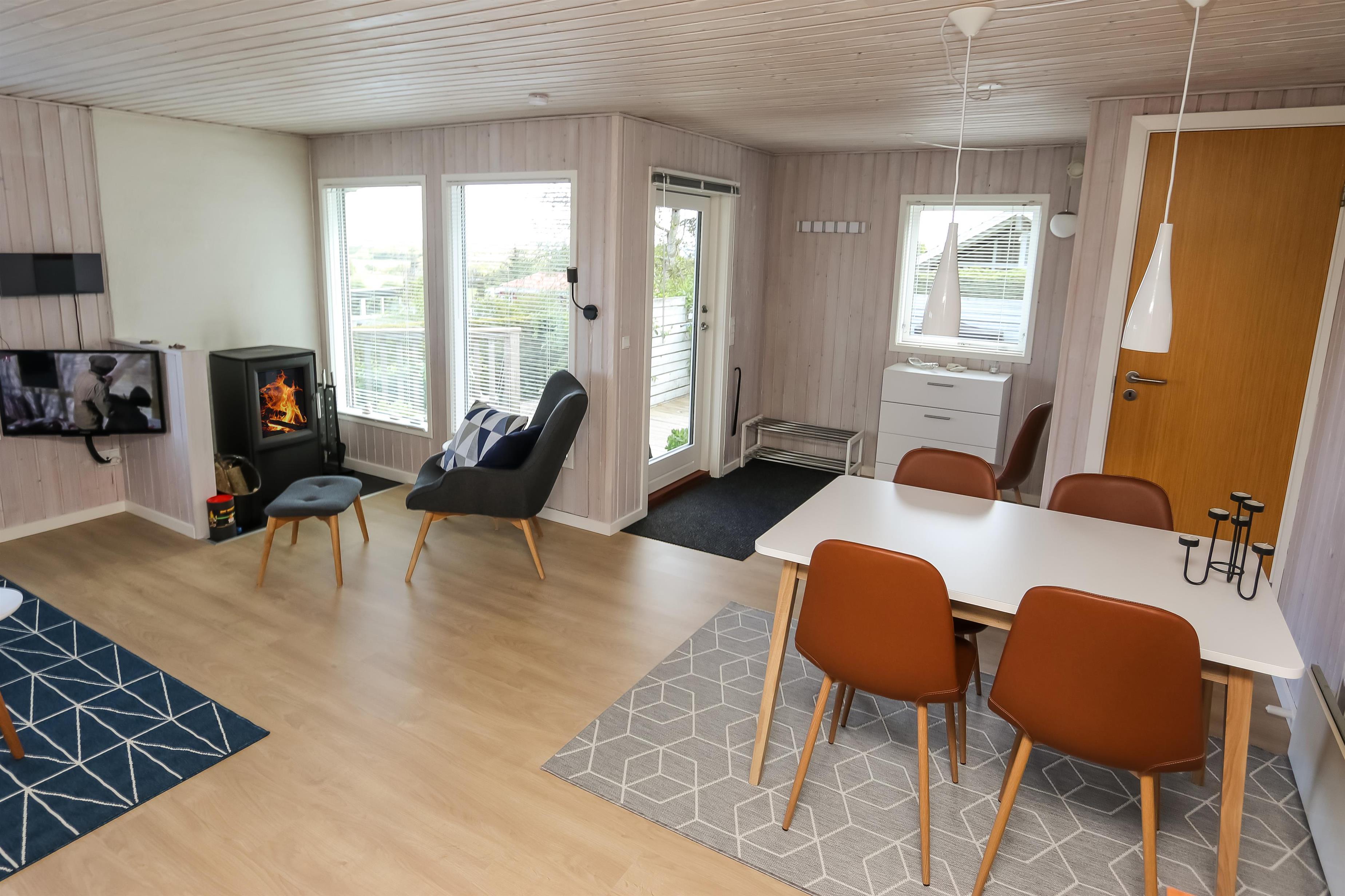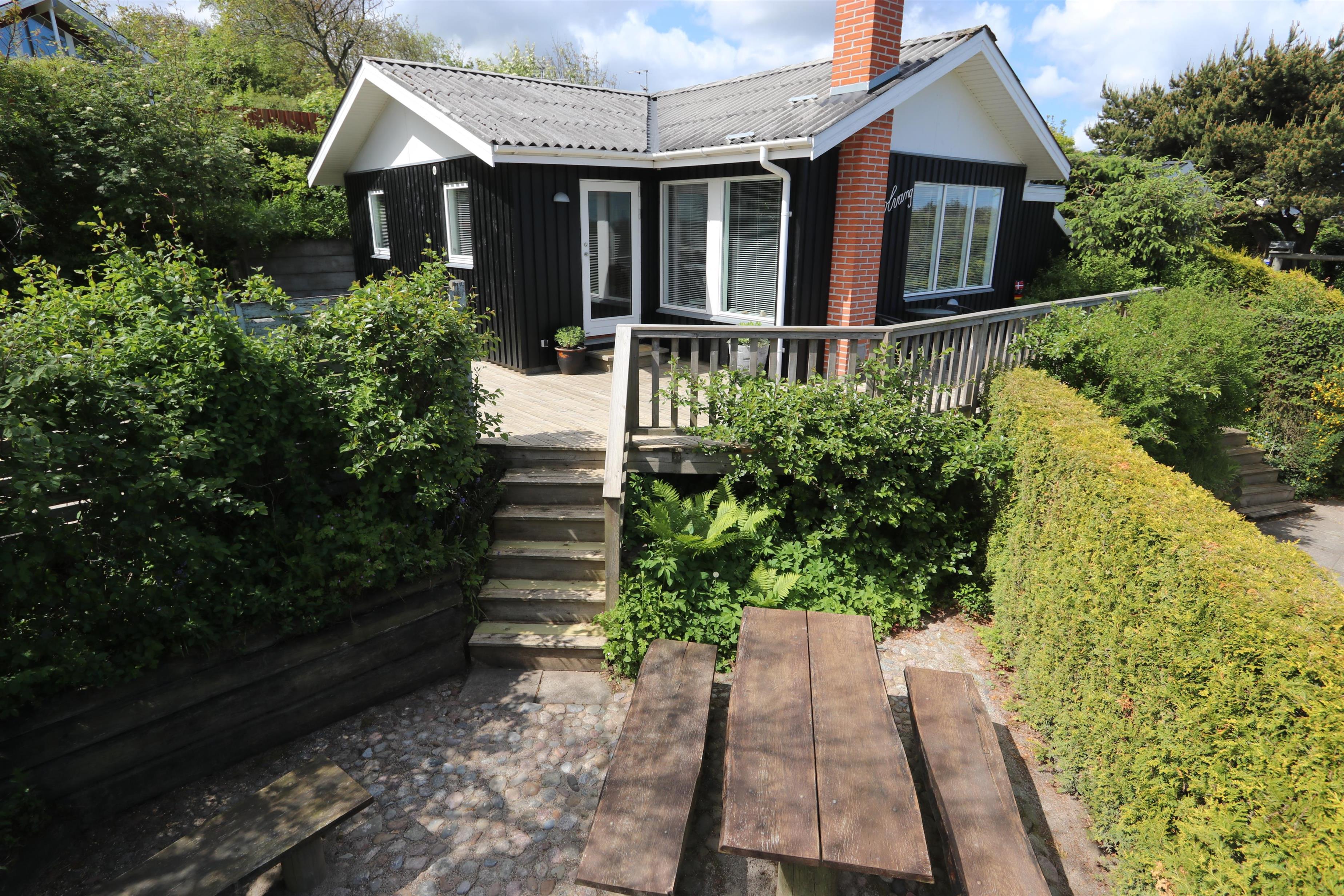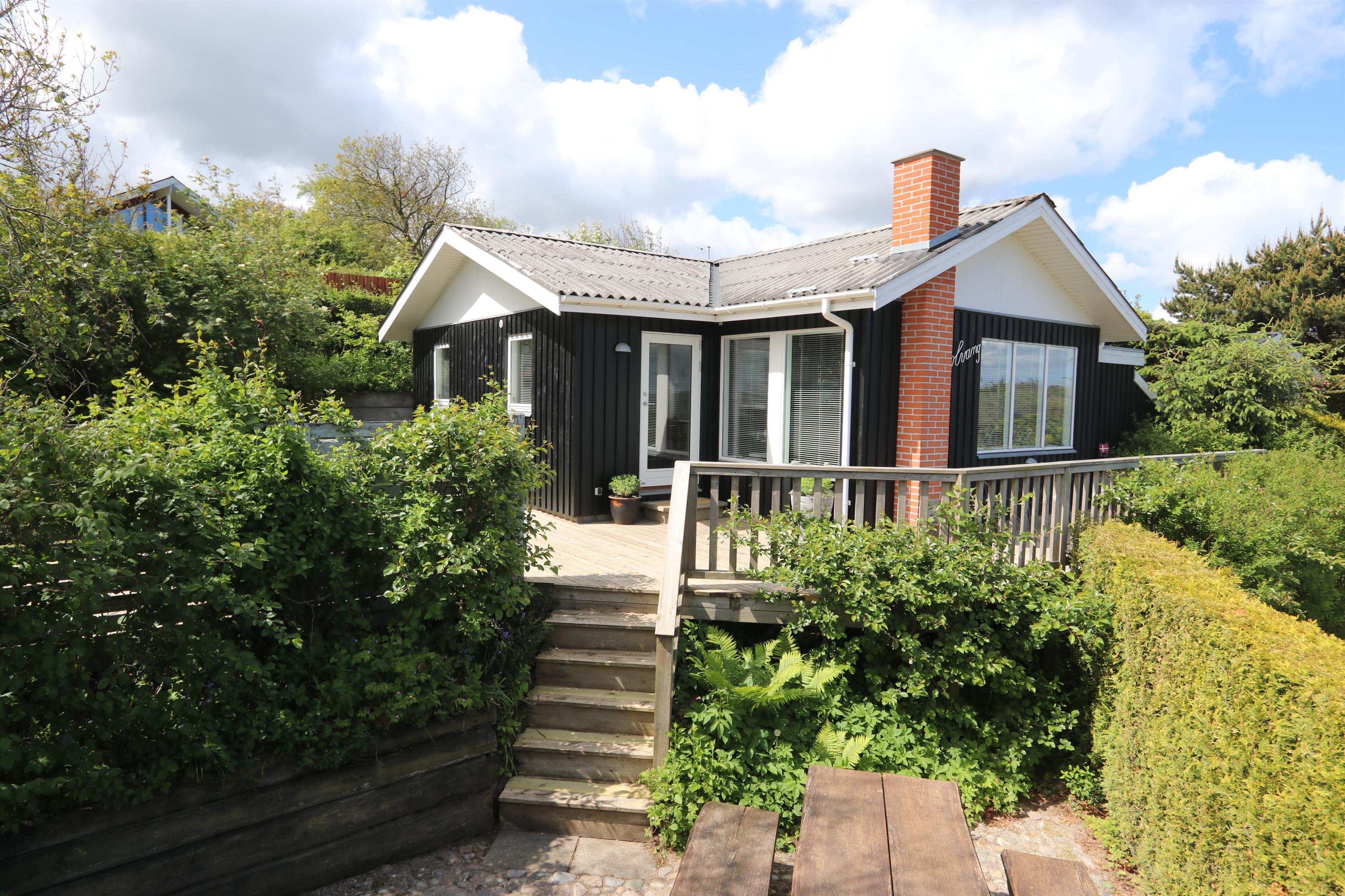 Lyst og pænt sommerhus, højt beliggende i roligt ferieområde ved Toftum Bjerge. Der er trappe op til huset. Sommerhuset er indrettet med kombineret køkken og stue. Køkkenet er pænt og indrettet med keramiskkomfur, emhætte, mikrobølgeovn, køleskab med frostboks. Stuen er lyst og pænt indrettet med trægulve og pæne komfortable møbler. Der TV med enkelte danske programmer og tilsluttet parabol med tyske og enkelte engelske kanaler. Der DVD-afspiller, stereoanlæg med CD-afspiller, Bluetooth højtaler og gratis trådløst internet til gæsterne rådighed. Til en kølig sommeraften eller en efterårsaften med regn og rusk er der brændeovn til at sprede hygge og varme. Der er desuden energivenlig varmepumpe i huset som også kan afkøle på varme sommerdage. Der er pænt badeværelse som er indrettet med toilet, håndvask, bruseniece, praktisk håndklædetørrer og behageligt gulvvarme. Huset er indrettet til fire personer, fordelt på to gode soveværelser. Et er indrettet med dobbeltseng og et med to enkeltsenge. Fra stuen er der adgang til husets store terrasser hvor i næsten altid kan finde læ. Der kan i tilberede og nyde aftensmaden på husets grill. På den lille terrasse er der indrettet hyggelig bålplads. Et dejligt sommerhus velegnet til familier som ønsker en rolig og afslappet ferie.