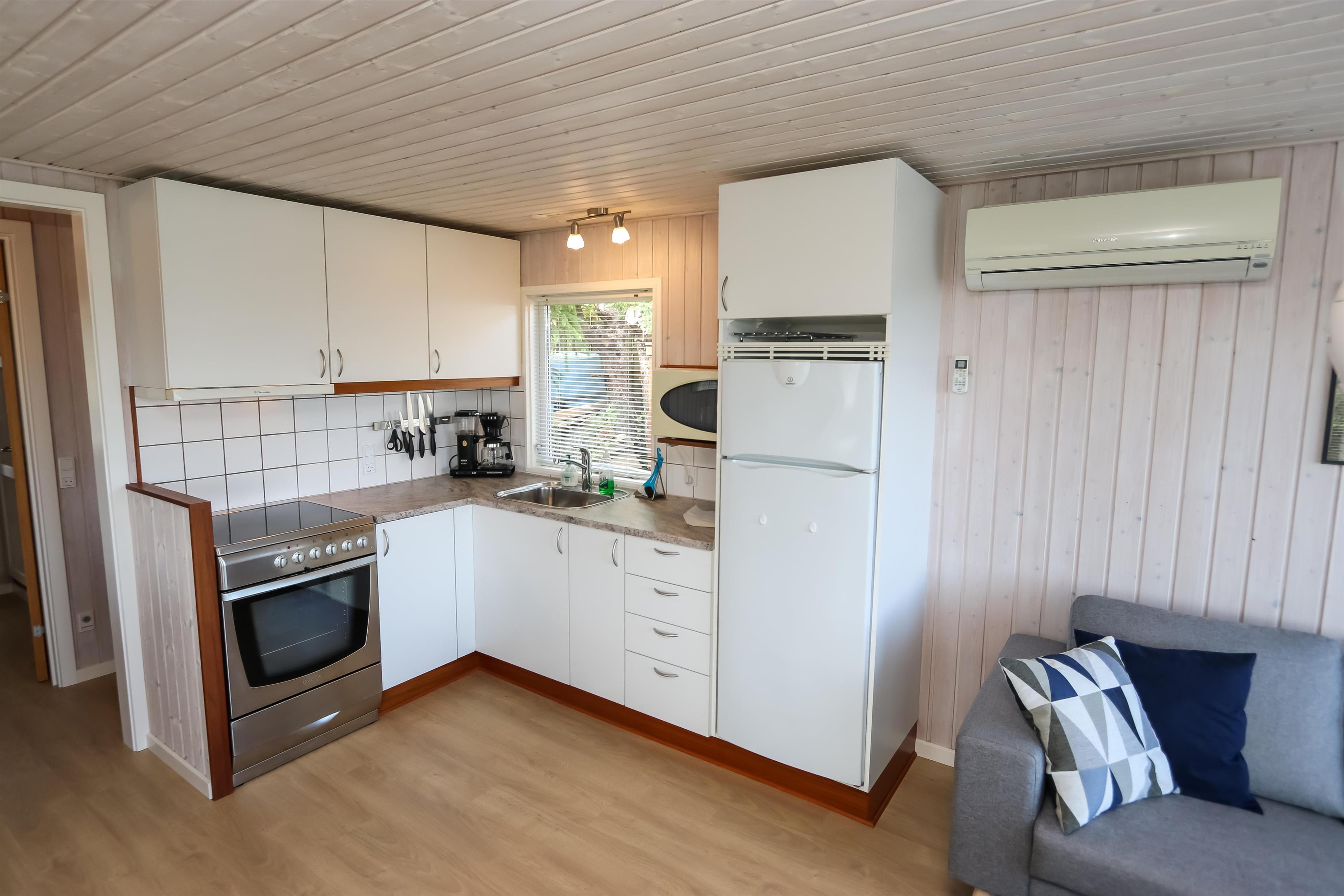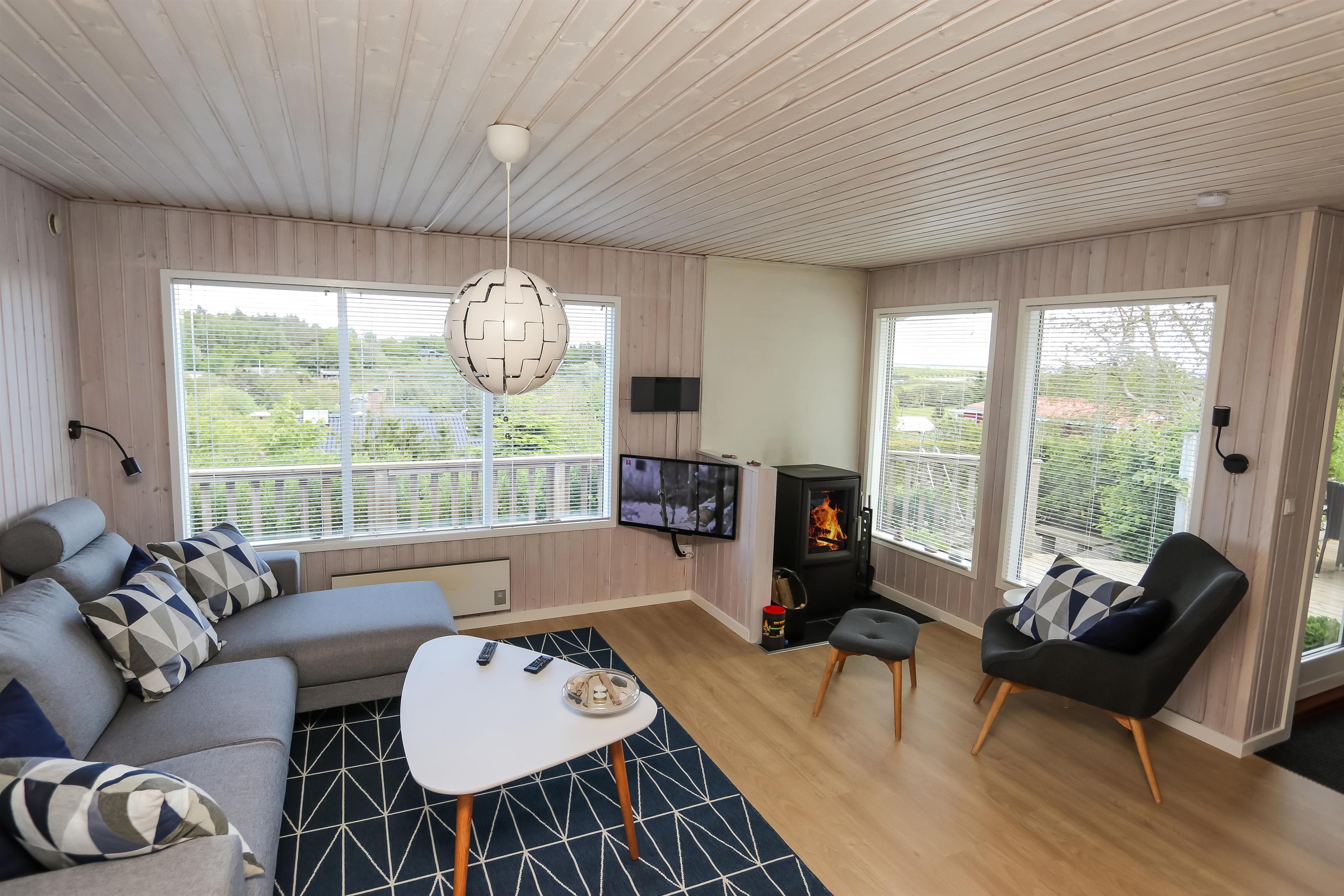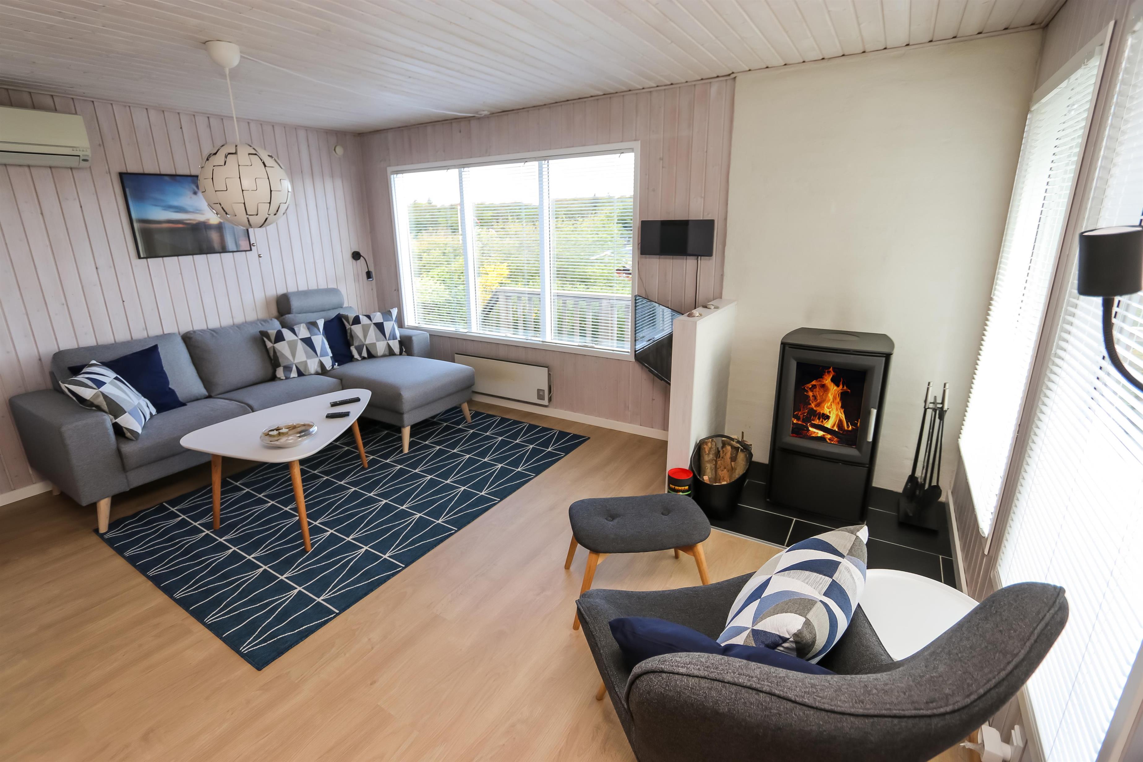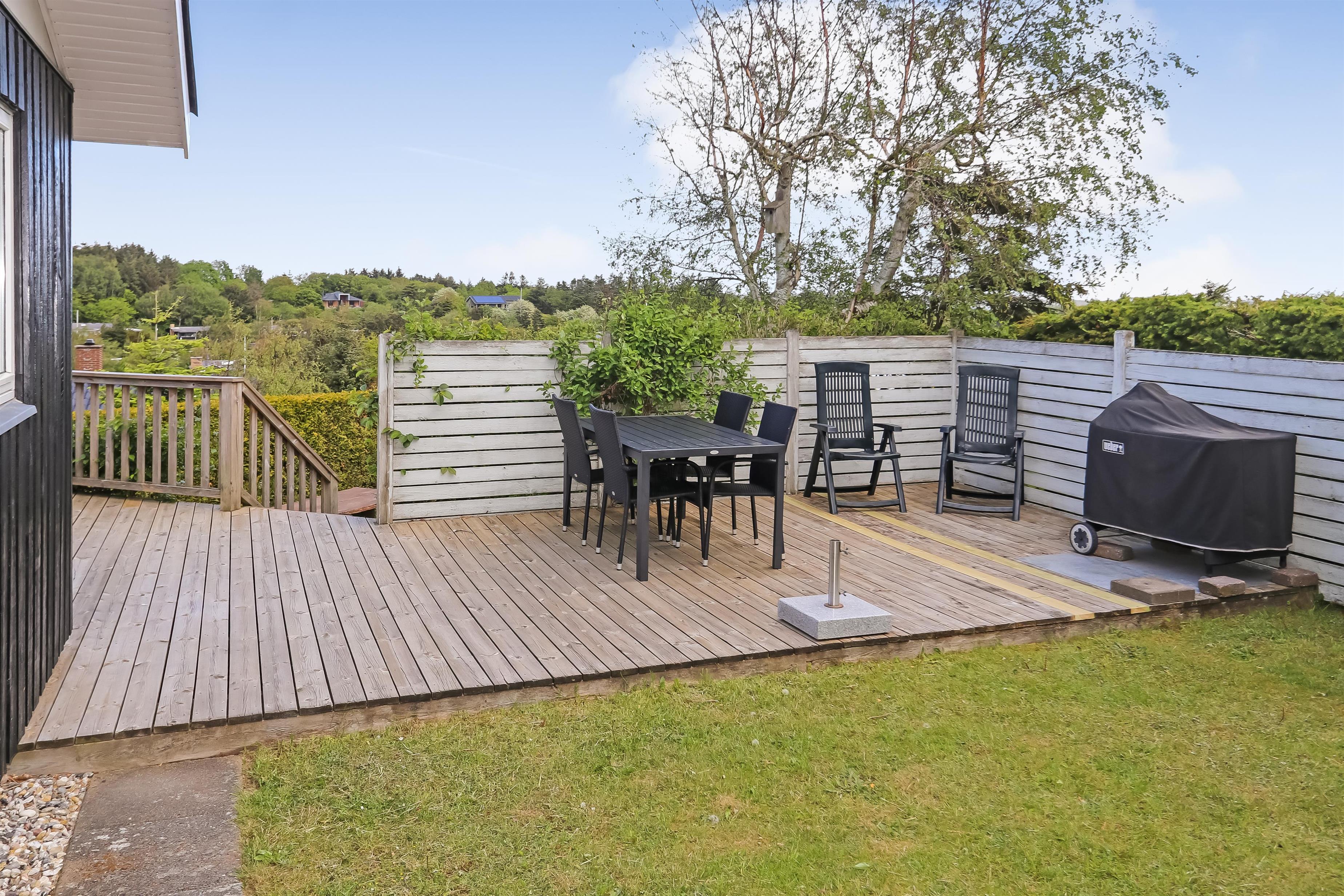 Lyst og pænt sommerhus, højt beliggende i roligt ferieområde ved Toftum Bjerge. Der er trappe op til huset. Sommerhuset er indrettet med kombineret køkken og stue. Køkkenet er pænt og indrettet med keramiskkomfur, emhætte, mikrobølgeovn, køleskab med frostboks. Stuen er lyst og pænt indrettet med trægulve og pæne komfortable møbler. Der TV med enkelte danske programmer og tilsluttet parabol med tyske og enkelte engelske kanaler. Der DVD-afspiller, stereoanlæg med CD-afspiller, Bluetooth højtaler og gratis trådløst internet til gæsterne rådighed. Til en kølig sommeraften eller en efterårsaften med regn og rusk er der brændeovn til at sprede hygge og varme. Der er desuden energivenlig varmepumpe i huset som også kan afkøle på varme sommerdage. Der er pænt badeværelse som er indrettet med toilet, håndvask, bruseniece, praktisk håndklædetørrer og behageligt gulvvarme. Huset er indrettet til fire personer, fordelt på to gode soveværelser. Et er indrettet med dobbeltseng og et med to enkeltsenge. Fra stuen er der adgang til husets store terrasser hvor i næsten altid kan finde læ. Der kan i tilberede og nyde aftensmaden på husets grill. På den lille terrasse er der indrettet hyggelig bålplads. Et dejligt sommerhus velegnet til familier som ønsker en rolig og afslappet ferie.