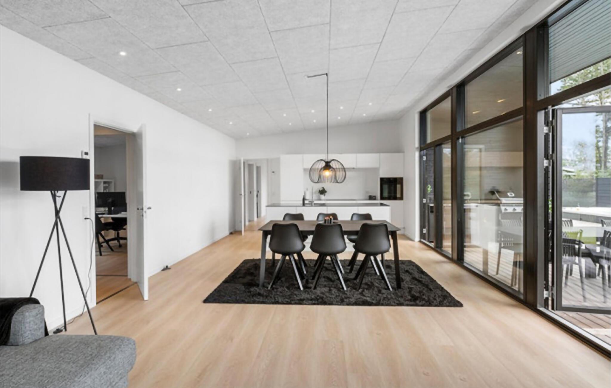 Velkommen til en ferie ved Torndrup Strand. Her kan I se frem til en feriebolig med moderne arkitektur og store lysindfald, som er placeret tæt ved den nordjyske østkyst. Den åbne opholdsstue har gulv til loft-vinduer og en flot udsigt til de grønne omgivelser. Sæt jer til rette i den store hjørnesofa, når I er i humør til en filmaften eller en lille læsestund med en god bog. Spiseområdet med et langbord giver jer gode rammer til hyggelige sammenkomster. Tilbered jeres måltider i det moderne køkken med kogeø. I får gode forhold til de kulinariske udfoldelser i form af store arbejdsflader, integrerede apparater og et elegant design.