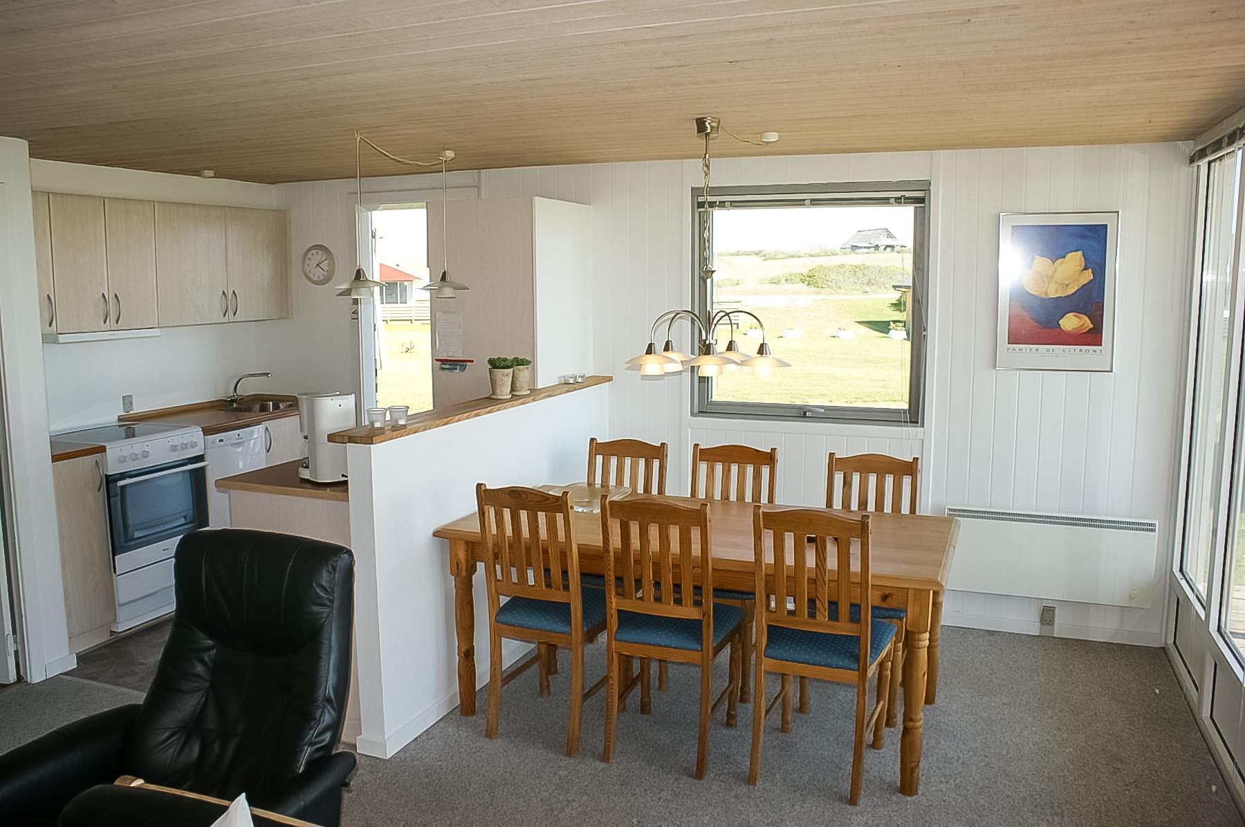 56 m2 træferiehus som er bygget i 1971 og renoveret i 2003. 3 soveværelser (1DS, 1DS 1KS). Kombineret opholdsstue og køkkenhjørne. Lige på den anden side af køkkenhjørnet er spisebordet placeret. Opholdsstue med lædermøbler, tv kun med tyske kanaler, radio/CD og en dejlig brændeovn som skaber ekstra hygge og varme. Pænt køkkenhjørne med komfur med glaskeramiske kogeplader, emhætte, opvaskemaskine og køleskab med lille fryseboks. Pænt badeværelse med toilet, bruser og håndvask. Vaskemaskine. Fra stuen er der panoramaudsigt til Vesterhavet. Der er gulvtæppe i opholdsstuen og praktisk linoleum i de andre rum. Max 1 husdyr tilladt.