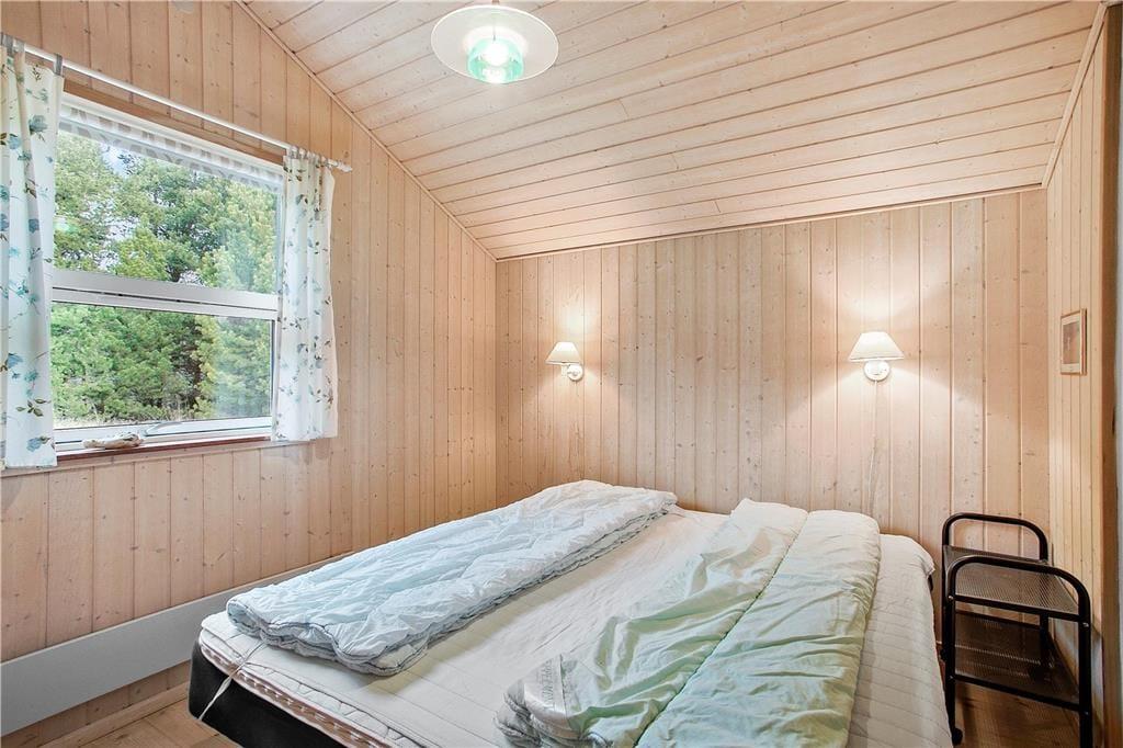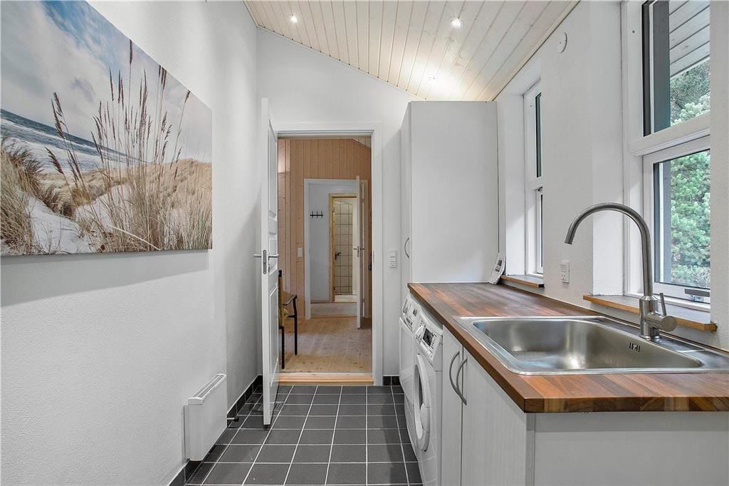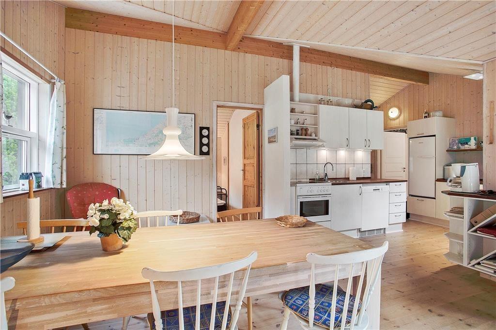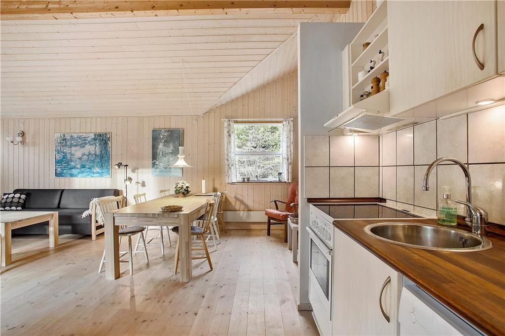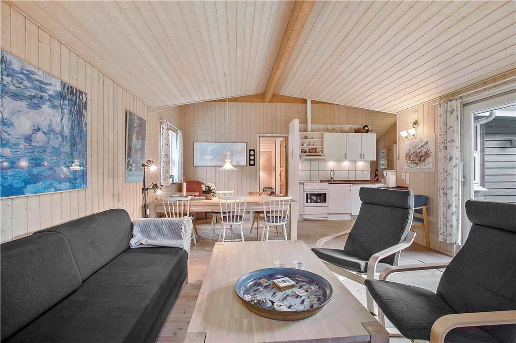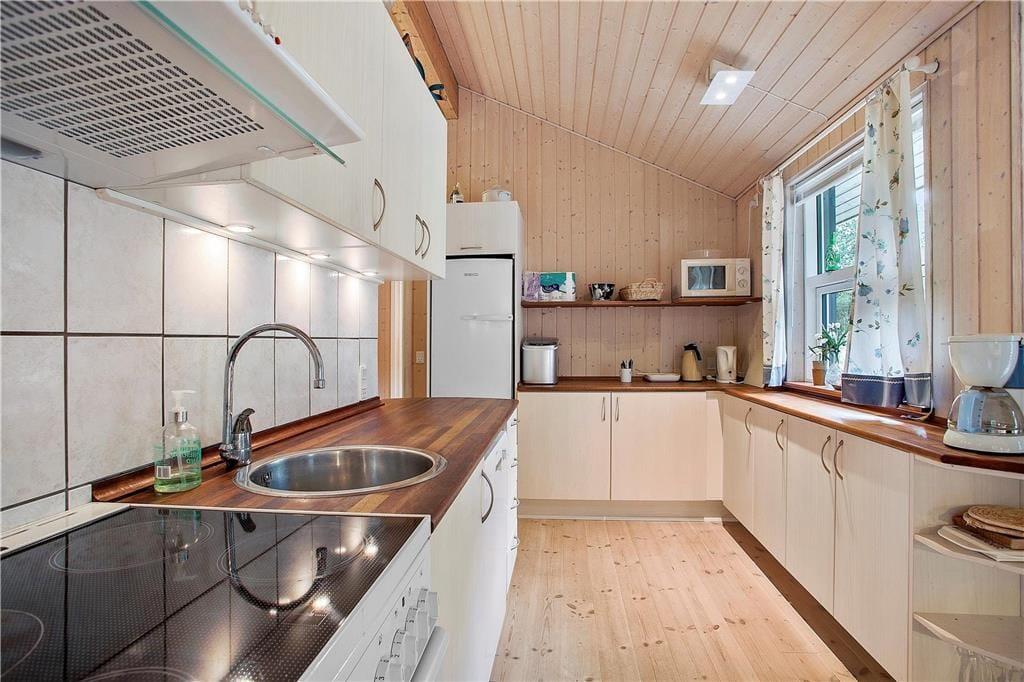 Allerede udefra står det klart, at sommerhuset præsenterer sig på pæn og velholdt vis, og det er også tydeligt inden døre, hvor I kan brede jer på hele 110 lyse og velindrettede kvadratmeter. Ikke mindst bryggerset og det største af de to badeværelser er i top, for begge rum blev nemlig grundigt moderniseret i 2019. Når I vil tilbringe tiden sammen, kan I mødes i opholdsrummet for at spille brætspil ved spisebordet, slappe af i sofaafdelingen nær brændeovnen eller for at hygge jer med madlavningen i det åbne køkken. Med Chromecast i stuen kan I nemt streame jeres yndlingsfilm og -programmer på fladskærmen – og skal børnene have lov til at starte morgenen med at se DVD-film, er der mulighed for det i det ene værelse. I alt er der tre soveværelser; Ét med dobbeltseng og to med enkeltsenge. Bemærk at det ene værelse er et gennemgangsrum til bryggerset.