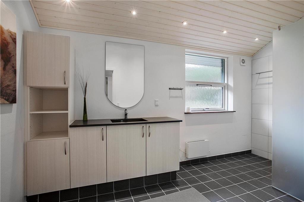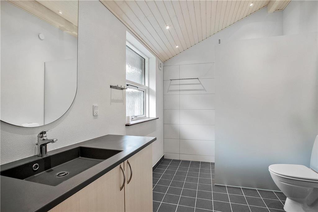 På flere sider af sommerhuset breder en dejlig fliseterrasse sig. Det gør det nemt at finde en skøn opholdsplads uanset solens placering på himlen – og en stor del af terrassen er endda indhegnet, hvilket er en dejlig detalje, hvis I har medbragt hunden. Holder I ferie med små børn, er det rart, at der er gyngestativ på den store og helt ugenerede naturgrund. Bemærk at skuret er privat og derfor aflåst.