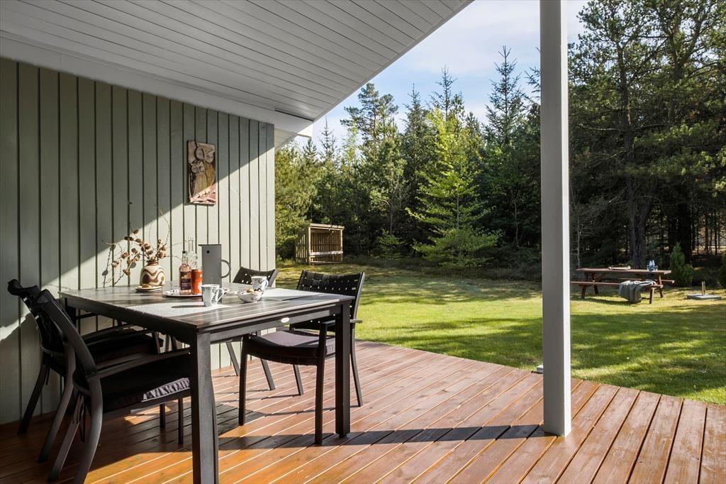 Huset ligger på en stor grund på 2461 m2, som er omkranset af træer og buske, så her får I det helt for jer selv. I kan også se frem til en stor græsplæne med god plads til leg og boldspil. Omkring huset er der desuden to gode terrasser: mod øst en åben terrasse, hvor I kan nyde dagens første kop kaffe, og mod syd en stor og dejlig overdækket terrasse til god mad og hygge. Og er I lidt heldige, kan I faktisk få et rådyr at se mellem træerne i haven tidligt om morgenen eller i skumringen.
