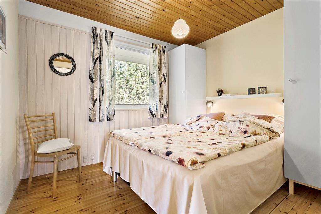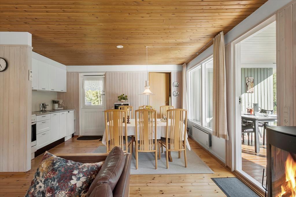 Huset er indrettet i en hyggelig og klassisk sommerhusstil med træ på gulve, vægge og lofter. Det skaber en varm og indbydende atmosfære, og de mange vinduespartier inviterer masser af dagslys indenfor. Indretningen er ideel til ferieturens hyggelige samvær med familie og venner, og hjertet i huset er det sammenhængende opholdsrum, hvor stue og køkken er i åben forbindelse. Her er der både sofagruppe og spisebord, og en brændeovn sørger for ekstra varme på de kølige aftener. Huset er udstyret med et nyere køkken, der byder på gode arbejdsbetingelser for familiens kok. Soverum er der tre af – et med dobbeltseng, et med to enkeltsenge og et med køjeseng. Endelig er der et badeværelse med bruseniche.