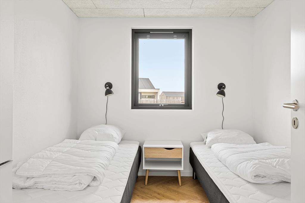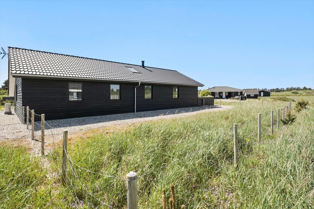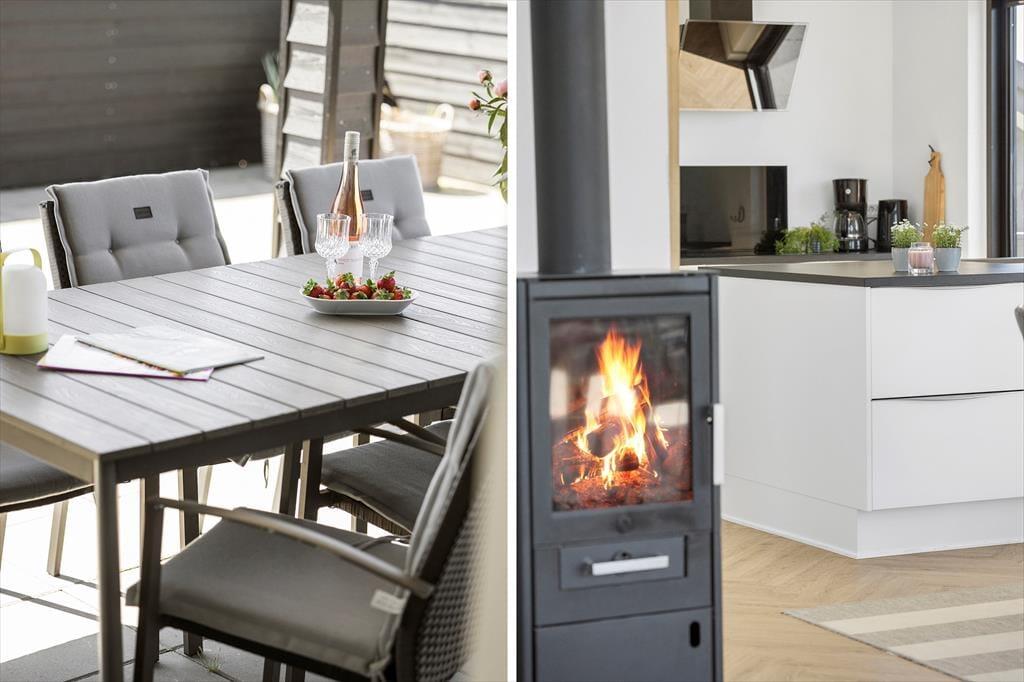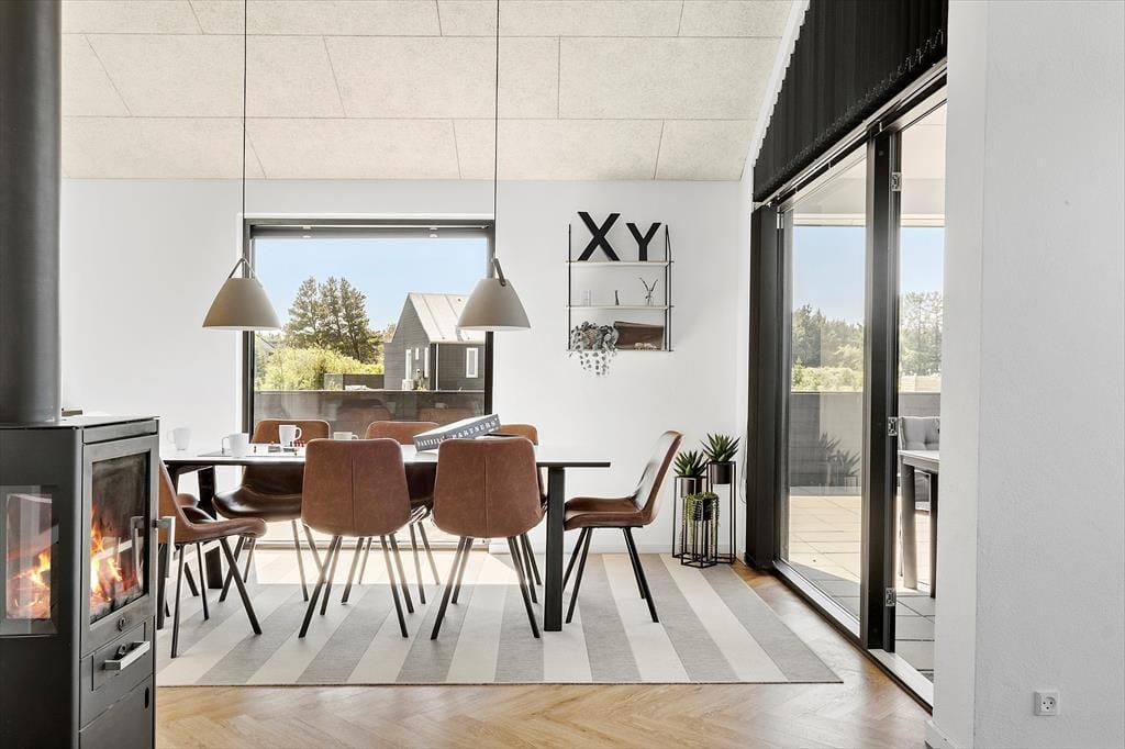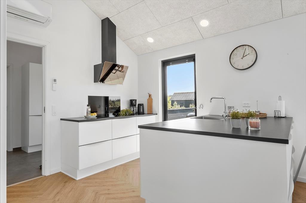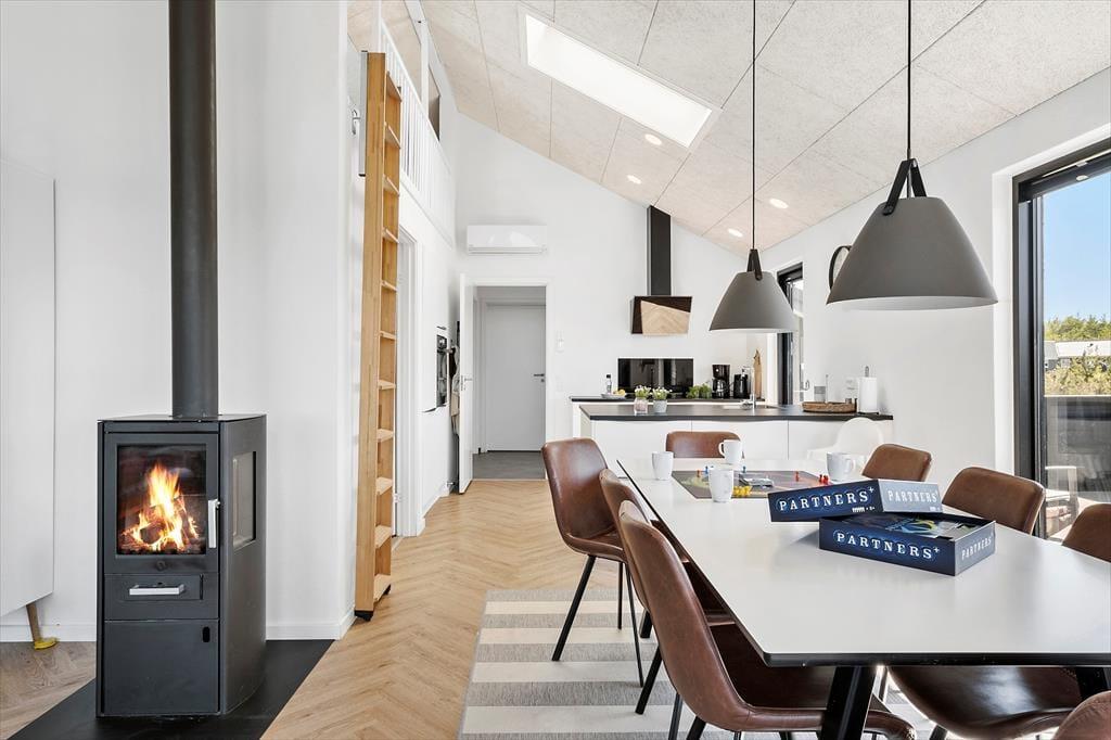 Når I holder ferie her på adressen, kan I være sikre på, at rammerne er helt i top. Det 94 m2 store sommerhus er opført i 2021, og hvert eneste rum præsenterer sig på flot og indbydende vis. Det gælder blandt andet det store badeværelse, som både er udstyret med bruseniche og spabad, og selv entréen er et lyst og lækkert rum med vaskesøjle og god plads til at hænge overtøjet. Sommerhusets tre soveværelser er udstyret med garderobeskabe og ordentlige senge, og derudover fungerer hemsen som en god soveplads. Netop hemsen er godt integreret i det stilfulde opholdsrum, der består af stue og køkken i åben forbindelse. Her er atmosfæren særligt lys og let, for der er både ovenlysvinduer og store vinduespartier vendt ud mod terrassen – og skulle det være køligt udenfor, kan I skrue op for hyggestemningen og temperaturen ved at tænde op i brændeovnen.