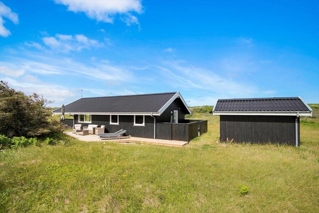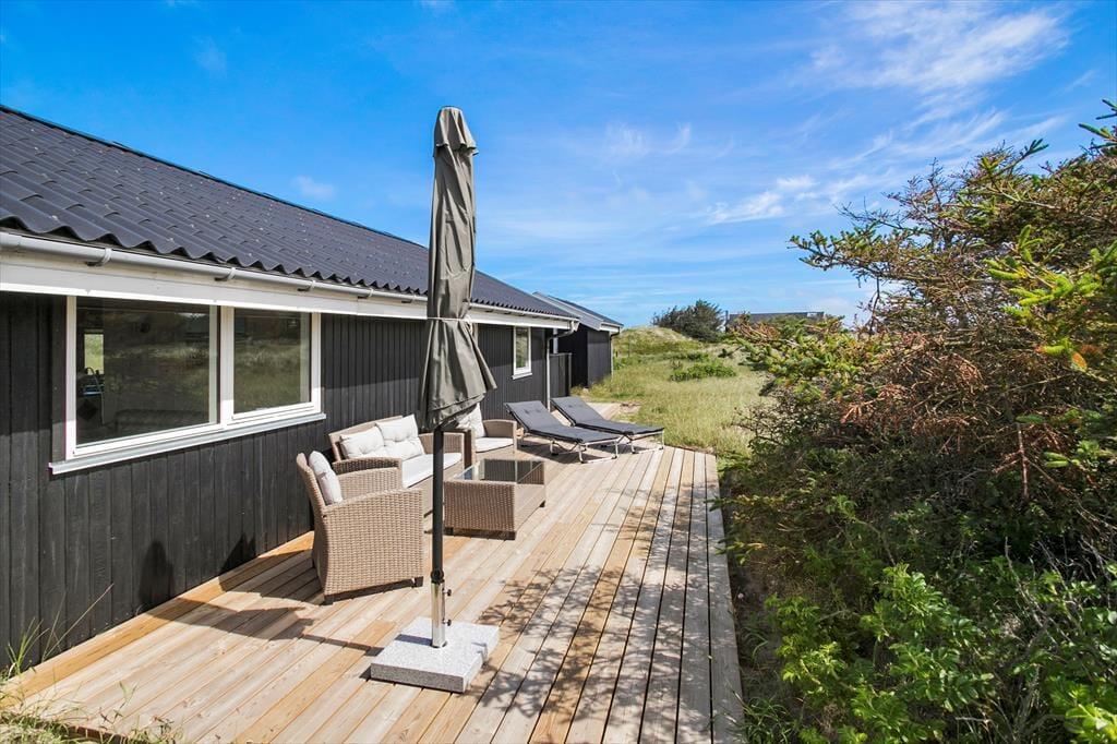 På tre af siderne af sommerhuset har I direkte adgang til en terrasse. Den ene med morgensol er åben, men afskærmet af plankeværk, den anden med aftensol er overdækket og den tredje vender mod syd og giver ofte god læ. Så der er noget at vælge imellem alt efter humøret og vejrforholdene. Naturgrunden er stor og smelter sammen med klitlandskabet, så omgivelserne kunne ikke være meget skønnere eller mere fredfyldte. Der er desuden tilknyttet et lille anneks på grunden, som primært benyttes til opbevaring