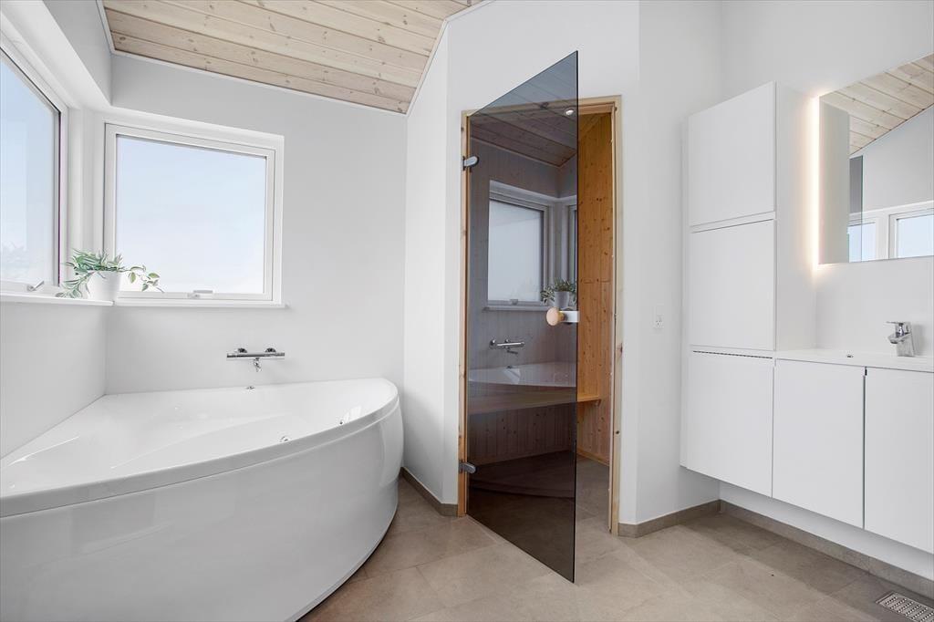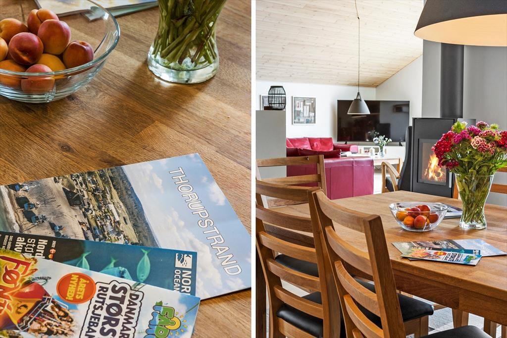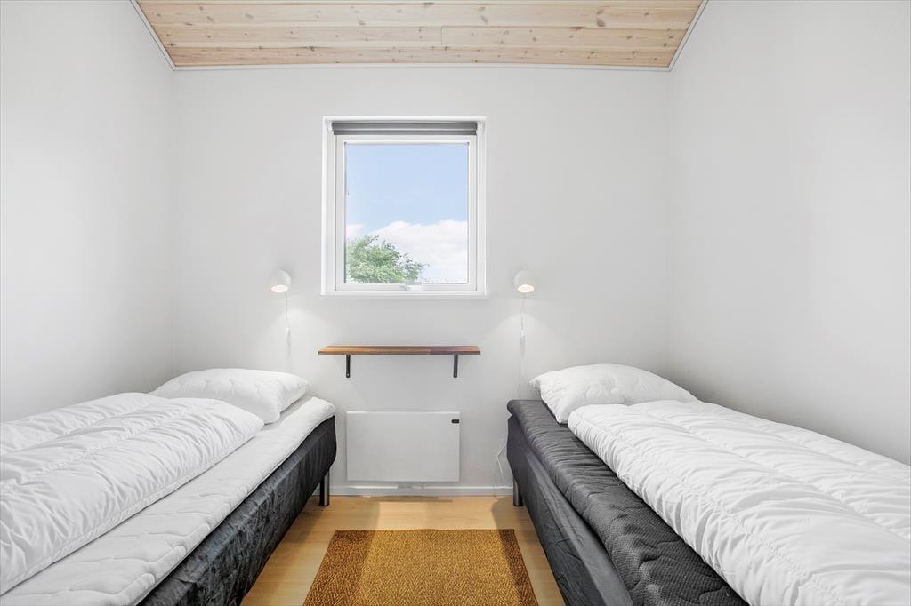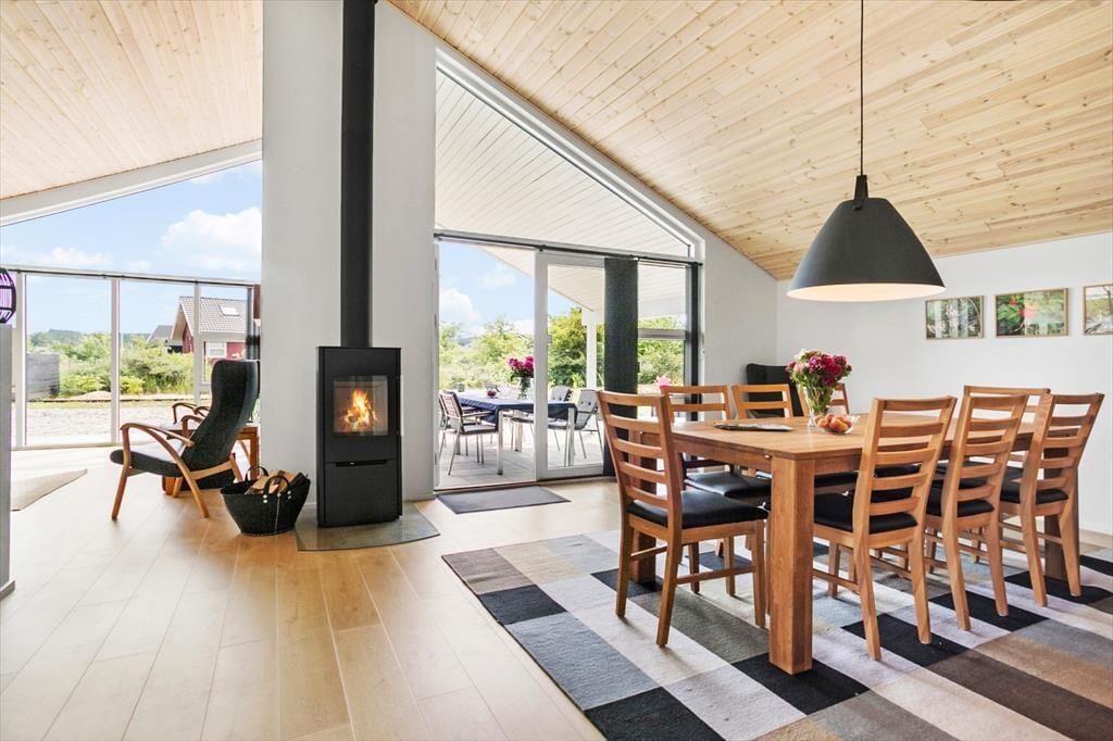 Inden døre i det nybyggede sommerhus er der lagt op til hygge og afslapning i de skønneste rammer. Hvis I vil samles otte personer, kan det sagtens lade sig gøre, for I har 118 m2 at brede jer på fordelt på tre soveværelser, to badeværelser og en stor stue med integreret køkken. To af husets sovepladser findes på hemsen, og den kan selvfølgelig også bruges i løbet af dagen, hvis børnene vil lege eller bygge hule. De fælles hyggestunder kan oplagt udspille sig i stuen, der byder på en yderst komfortabel sofaafdeling med stor fladskærm med tv-abonnement og Chromecast til streaming. Spisebordet, der står nær det veludstyrede køkken, lægger op til lækre middage og brætspil til langt ud på aftenen – med mindre I hellere vil bruge den sidste del af dagen i spabad og sauna, som I finder på det største badeværelse.