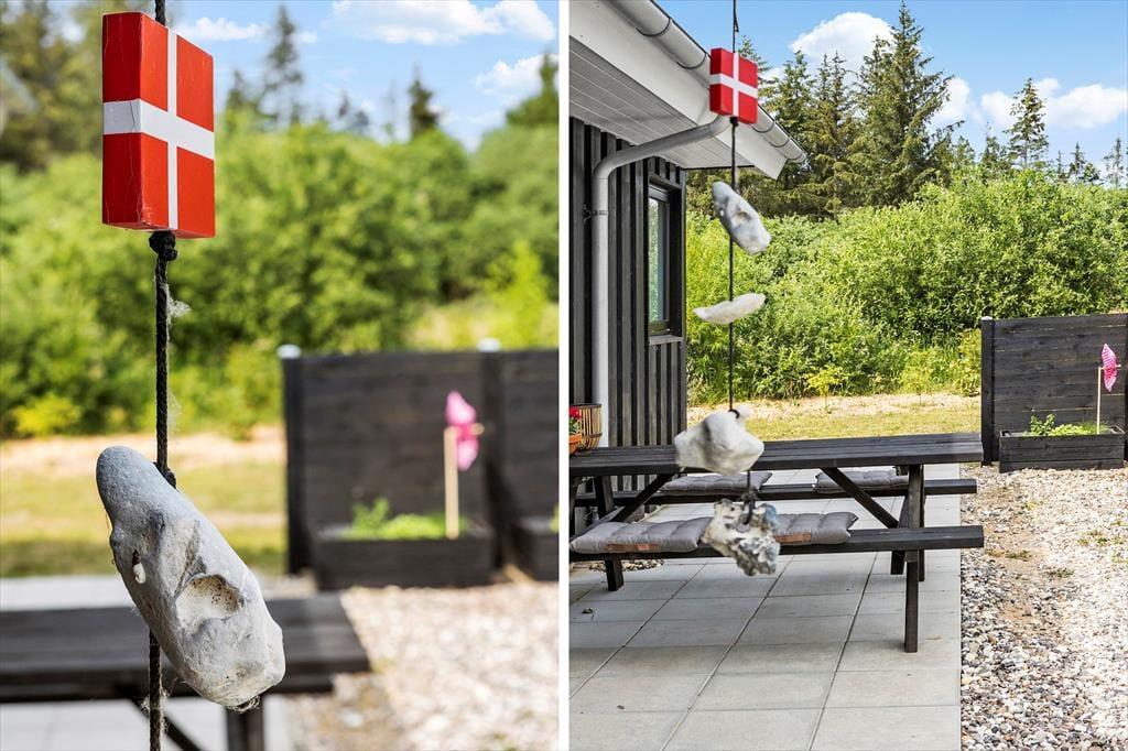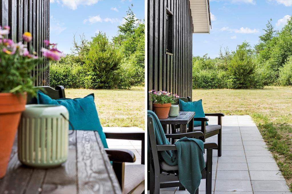 Et stort fliseareal breder sig rundt om sommerhuset, så I har flere gode opholdspladser at vælge imellem – heriblandt en overdækket terrasse, hvor I kan finde skygge fra solen, hvis det bliver nødvendigt. Grunden er stor og enkelt anlagt med græsplæne og randbeplantning, og I kan sagtens blive her for at lege og spille havespil. Det kan nu også bestemt anbefales at smutte ned for enden af vejen, hvor Tranum Feriebys kæmpestore fællesareal byder på mange sjove aktiviteter for hele familien.