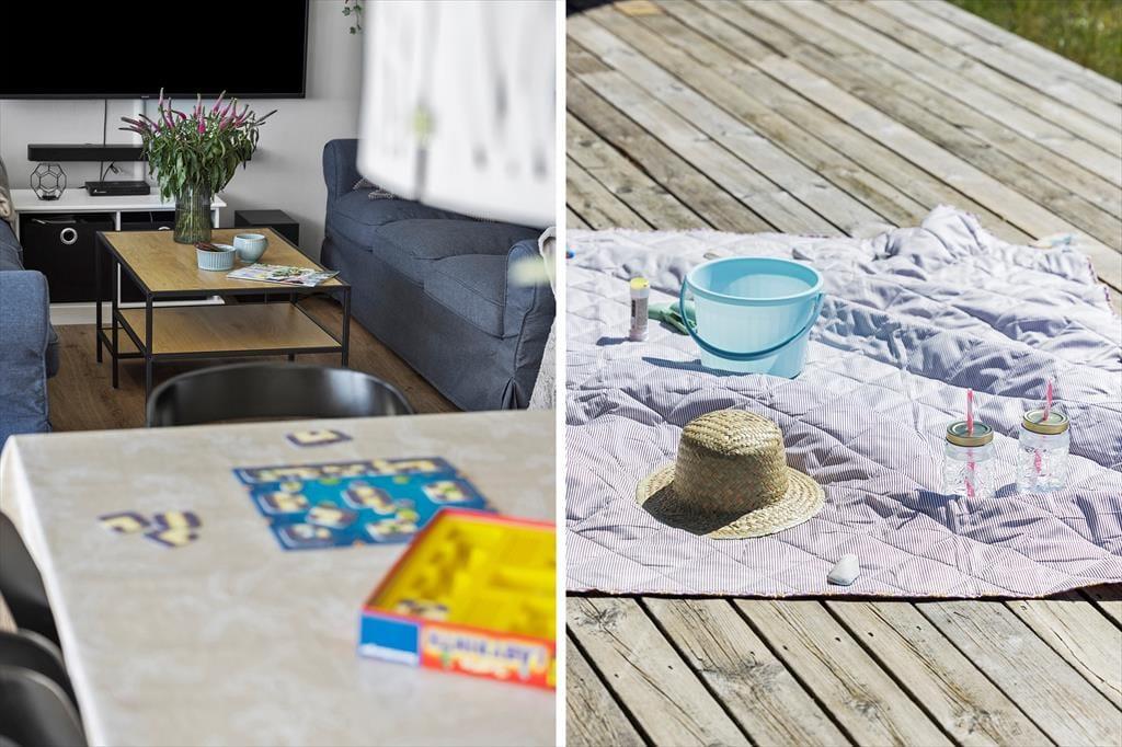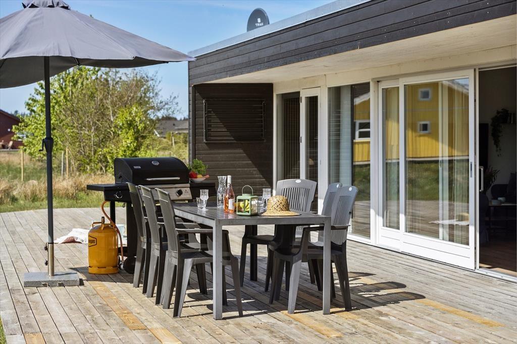 Fra stuen og alle soveværelser har I direkte adgang til den store træterrasse, der breder sig rundt om sommerhuset og annekset. Det gør det nemt at tage udearealerne i brug, uanset om I vil flytte morgenmaden ud i solen, have en middagslur i skyggen eller hygge jer med grill og havespil om aftenen. Børnene kan lege på den 1.998 m2 store grund, men der er endnu mere plads til store armbevægelser og fysiske udfoldelser på det kæmpestore fællesareal, der breder sig på den anden side af vejen.