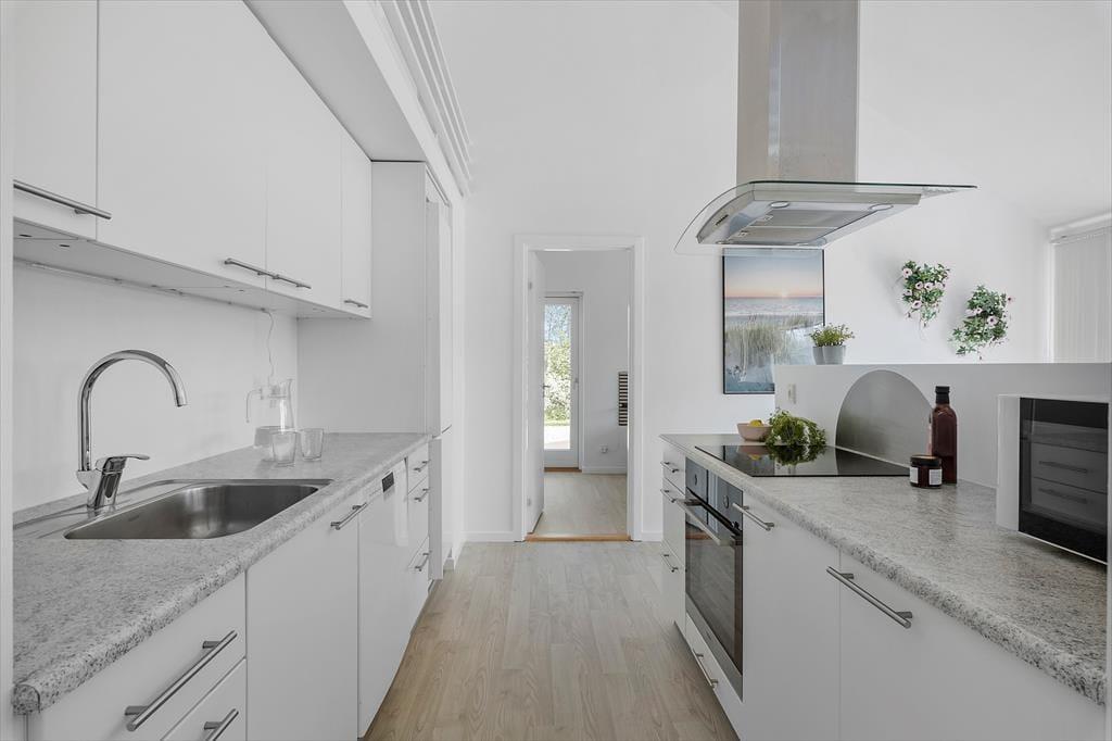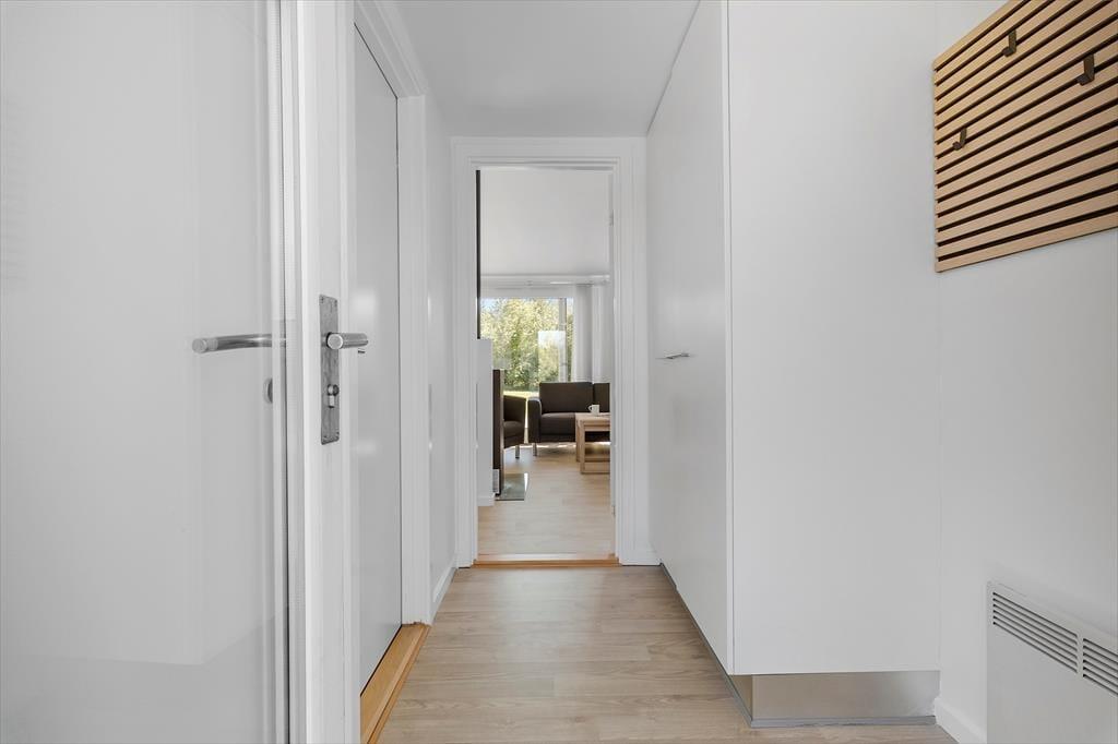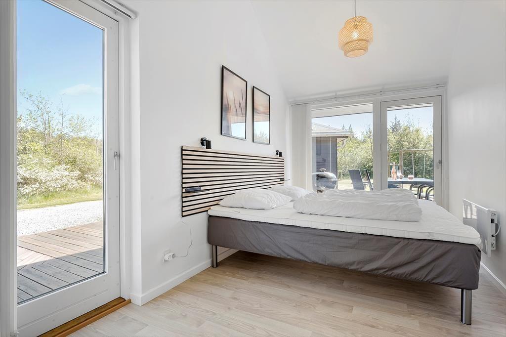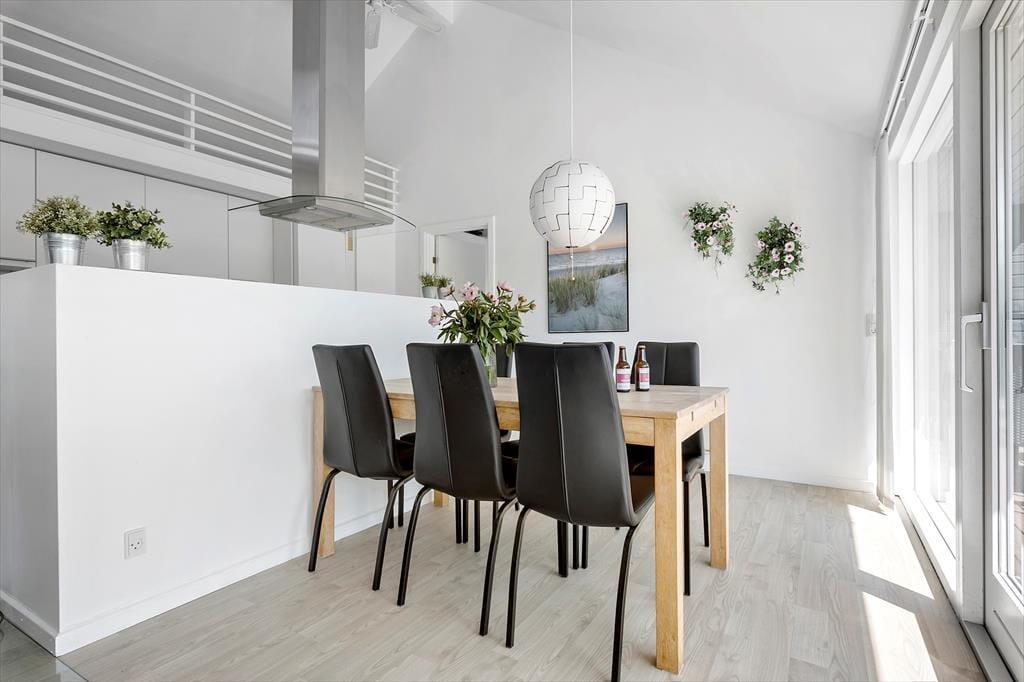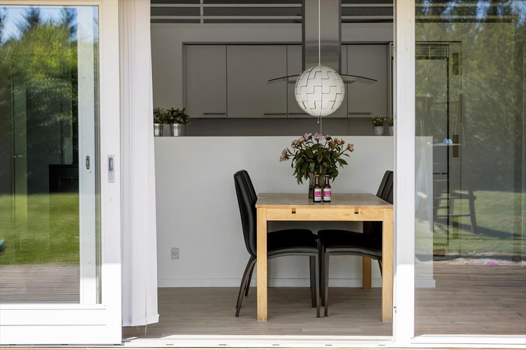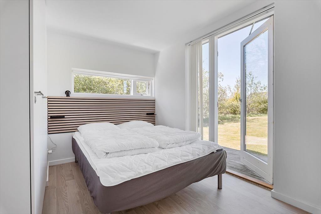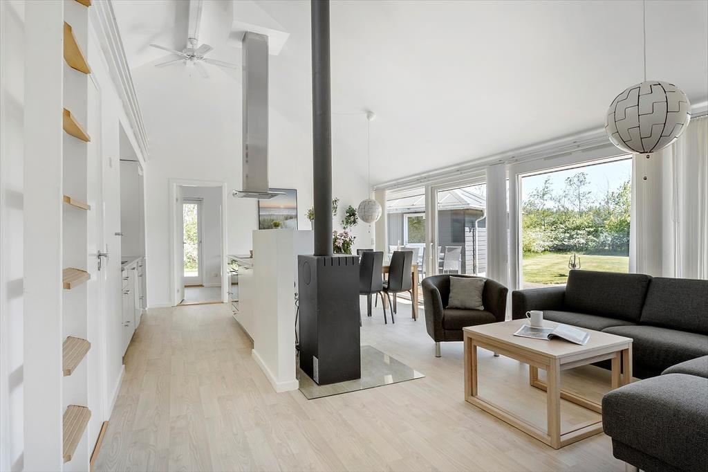Det 90 m2 store sommerhus har en lys og moderne indretning, og stuen er det perfekte sted at hygge igennem med brætspil, gode bøger eller en film på fladskærms-tv’et. Familiesamværet kan foregå i sofaafdelingen såvel som omkring spisebordet, der begge står i nærheden af brændeovnen, og I kan også gøre madlavningen til et fællesprojekt i den åbne køkkenafdeling. Får børnene lov til at holde fri, kan de kravle op på hemsen for at lege, mens de voksne hyggesnakker over gryderne – og hvis der virkelig skal slappes af efter måltidet, er det skønt at have både spabad og sauna på det største af husets to badeværelser. Planløsningen byder for øvrigt på tre gode soveværelser, og de er alle udstyret med dobbeltseng, garderobeskabe og terrassedør ud mod terrassen.