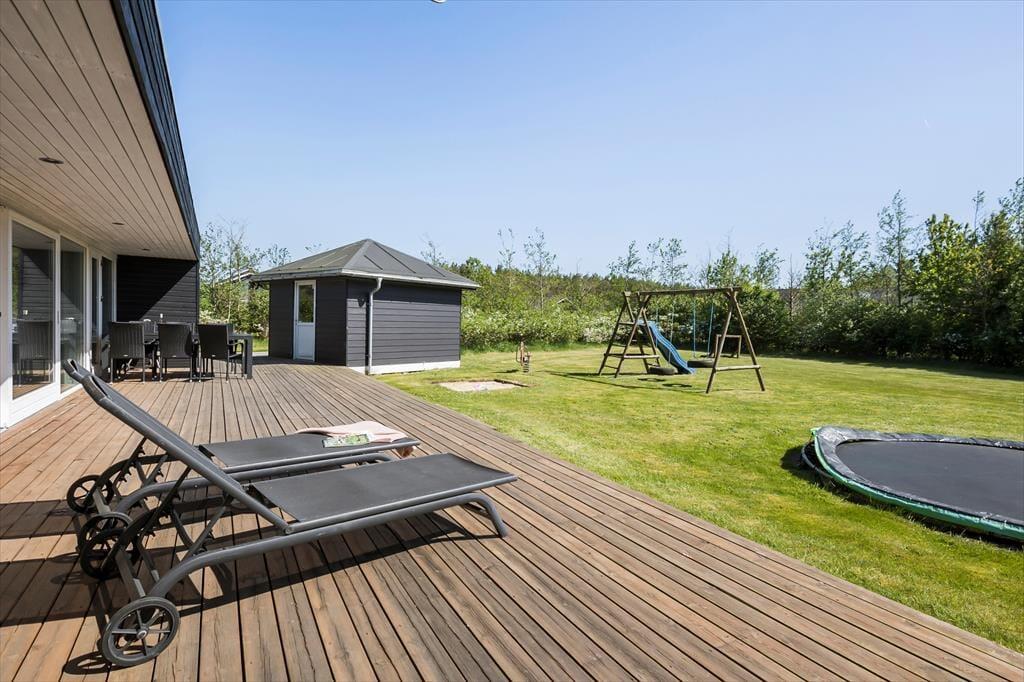 Terrassedækket breder sig rundt om sommerhuset, så I behøver ikke træde ud på det dugvåde græs, selvom I vil ud for at trække frisk luft om aftenen. I løbet af dagen kan I sætte jer lige der, hvor der er mest sol og læ, og uanset hvor I sidder, kan I nyde de ugenerede rammer takket være grundens frodige randbeplantning. De voksne kan derudover glæde sig over, at der er trampolin, gynger, rutsjebane, sandkasse og fodboldmål i haven, så med andre ord er børnene godt underholdt, mens I drikker kaffe i havestolene.