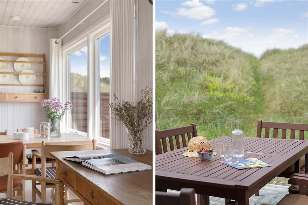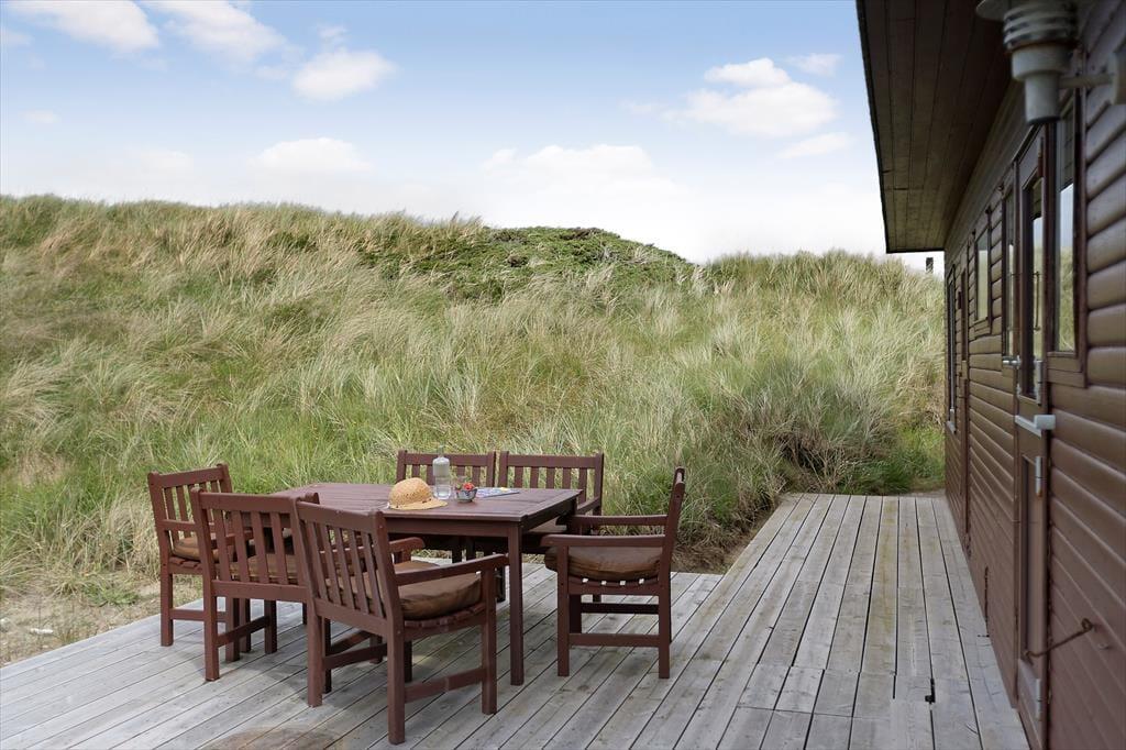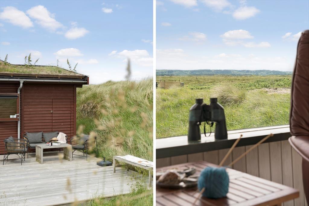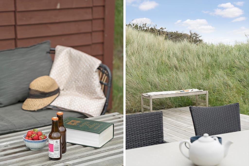 Alle sommerhusets terrasser ligger godt placeret, så uanset om du vil drikke morgenkaffe, have en middagslur eller spise aftensmad i solen, burde det kunne lade sig gøre. Mod øst kan du se længst ud over det naturskønne område, men det er nu også rart at sidde på husets vestside, hvor du er omgivet af klitter og har frit udsyn til aftenhimlen, når den nedadgående sol farver skyerne i lilla og orange nuancer. Vil du se solen synke helt ned i havet, skal du bare gå i få minutter, før du står på toppen af den yderste klitrække og har fuldt overblik over kyststrækningen.
