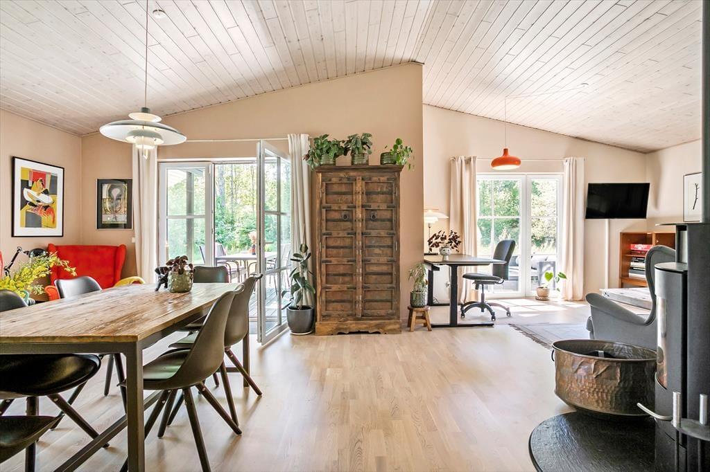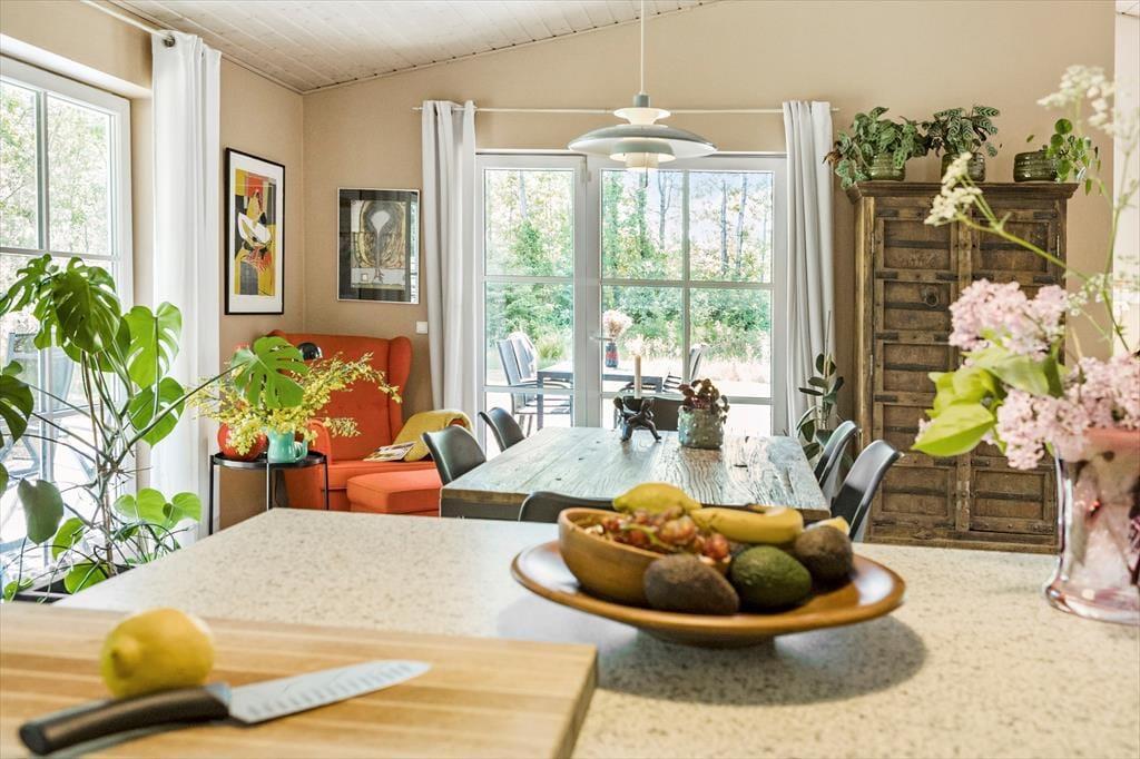 Et stort og lækkert terrassemiljø breder sig rundt om tre af husets sider. Mod øst og syd kan I sidde under åben himmel, og mod vest er terrassen delvist overdækket, så det er muligt at finde ly fra duggen, hvis I vil sidde længe ude om aftenen. Græsplænen indbyder til leg og boldspil, og høje træer rammer udearealerne smukt ind.