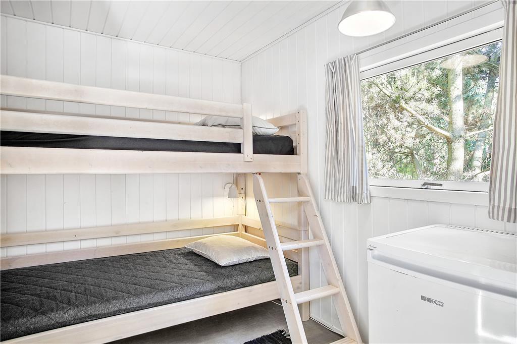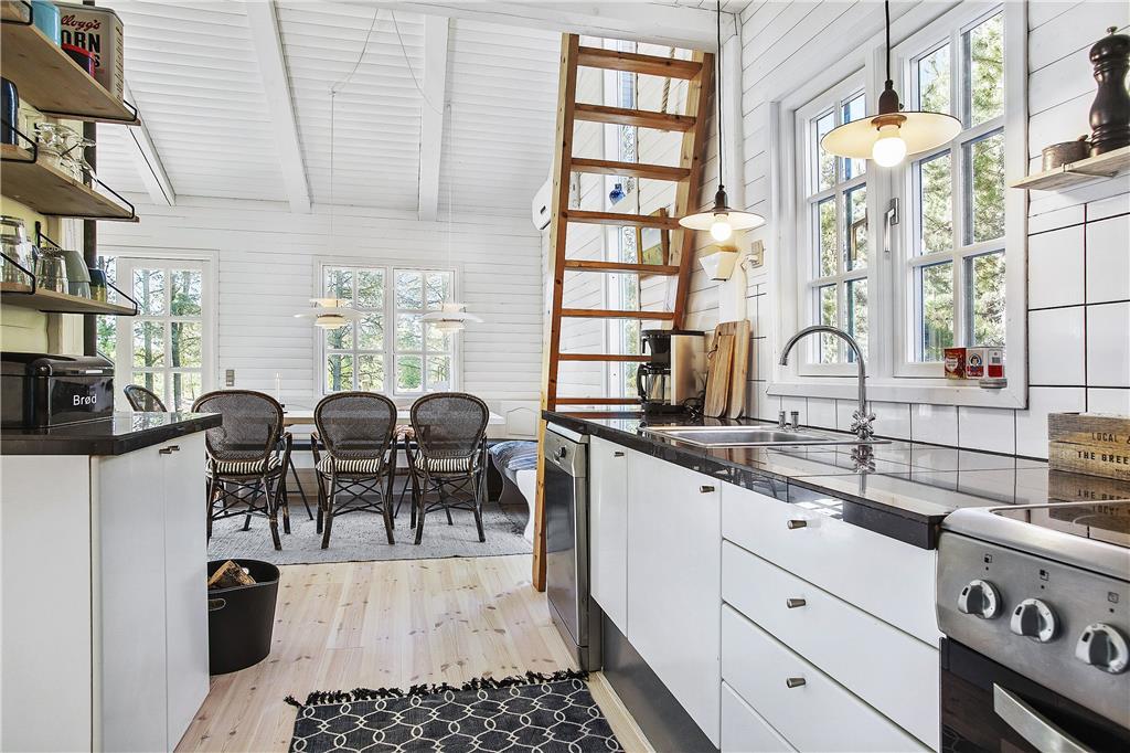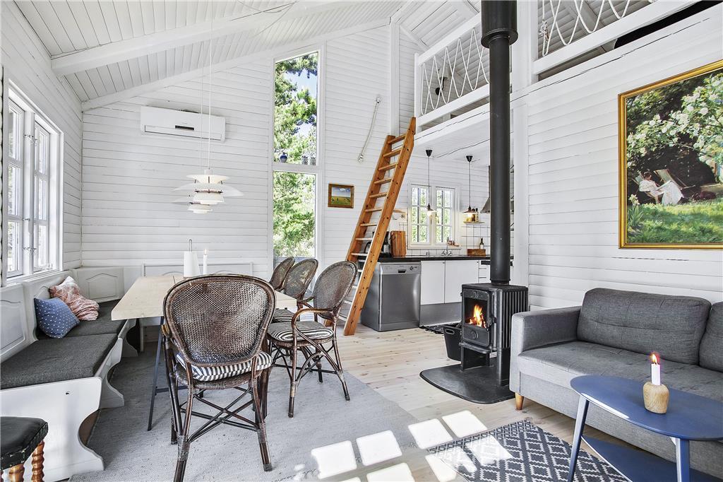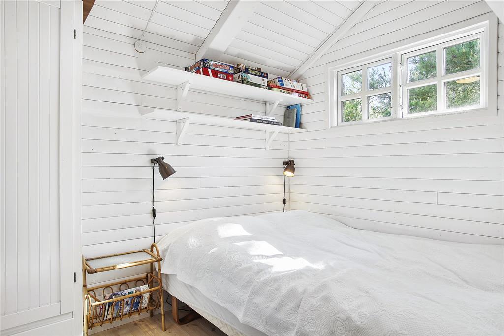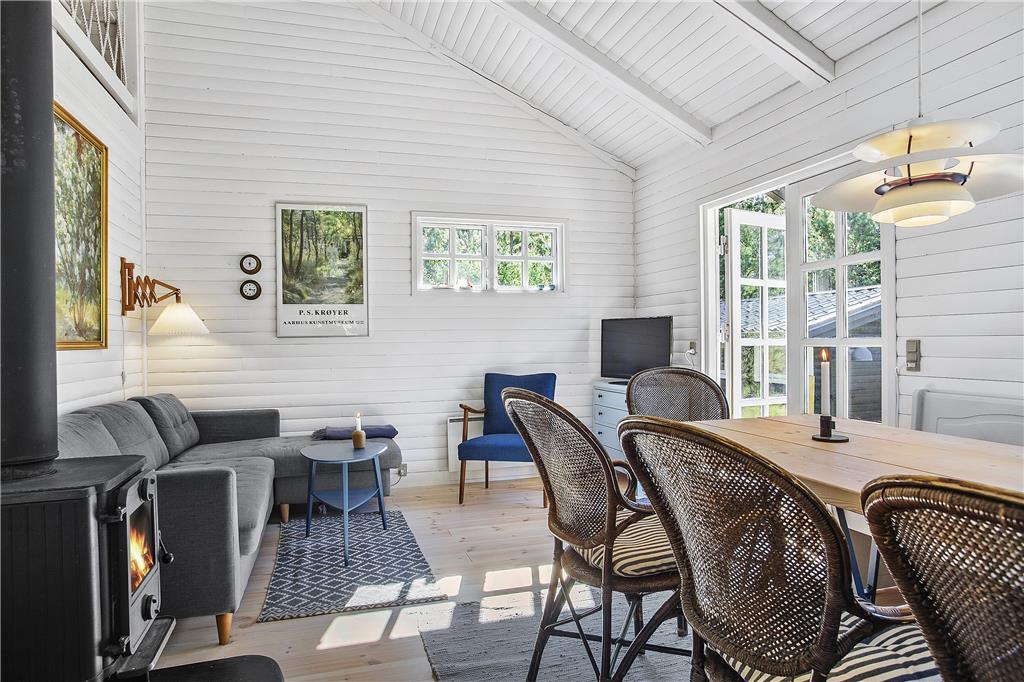Et flot renoveret sommerhus i virkelig hyggelig og charmerende stil. Indretningen leder tankerne hen på god gammeldags ferieidyl med hvidmalede trævægge, sprossede vinduer og en høj, flot brændeovn i midten af huset. Hovedhuset består af et godt udstyret køkken, stue med hems og et badeværelse med bruser og vaskemaskine. Derudover er der tilknyttet to mindre annekser: ét med to soverum og et badeværelse med bruser og ét med et soverum. Huset har på papiret måske ikke så mange m2, men det vejes helt og aldeles op af hjerterum og varme, og det bliver med garanti et hus, som mange vil vende tilbage til år efter år.