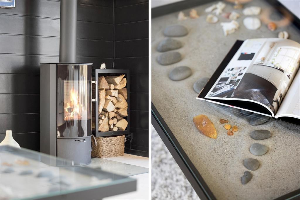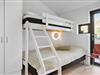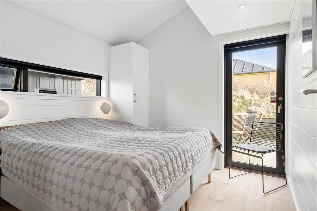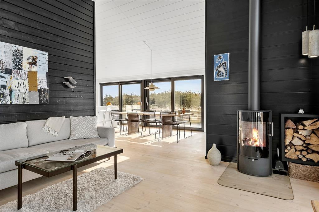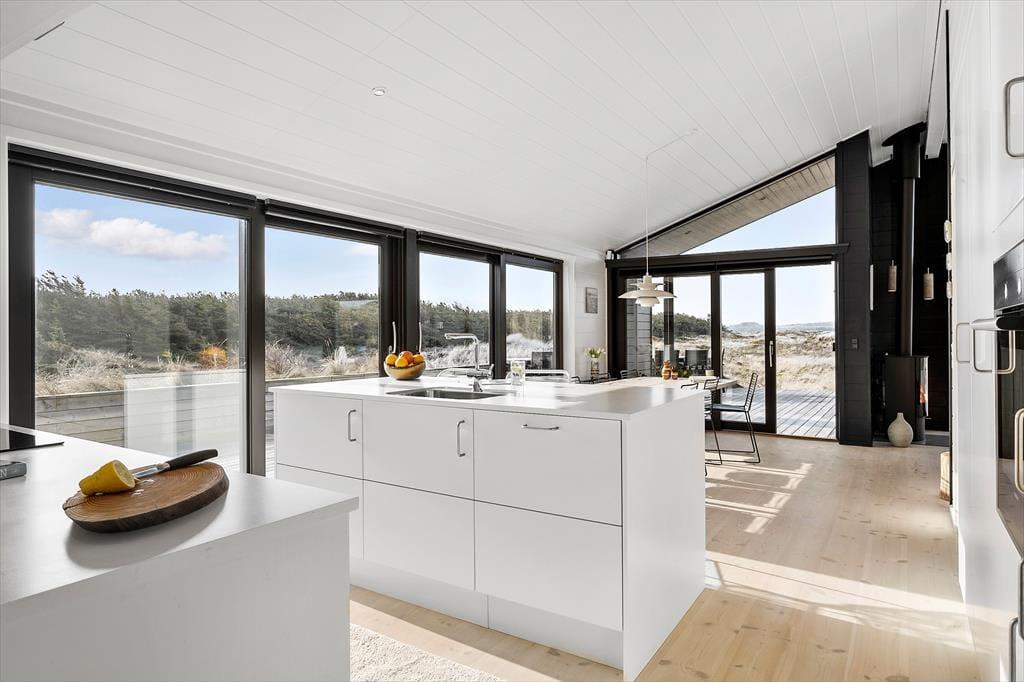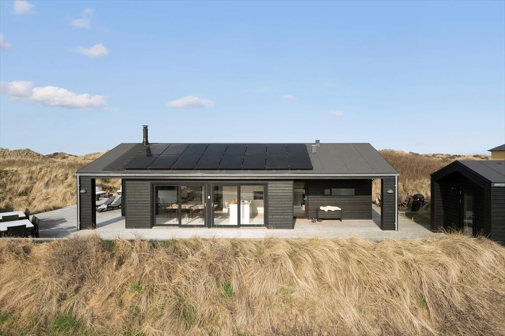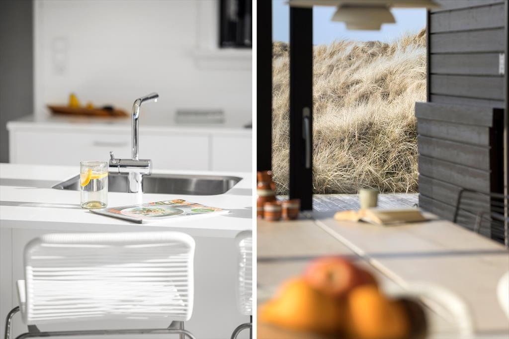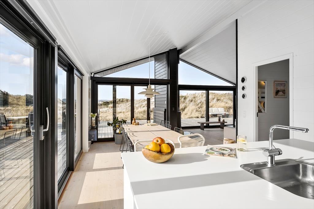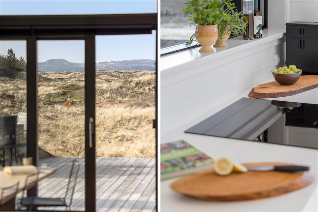 Sommerhusets mørke facade og stringente arkitektur giver en flot kontrast til det bugtende klitlandskab og til havets brusende bølger, der ruller ind på stranden bare 100 meter væk. Særligt i opholdsafdelingen sørger de kæmpestore vinduespartier for, at du kan skue langt ind over land mod Fosdalen i det fjerne – og i klart vejr kan du også se Slettestrand lidt længere nede langs kysten. Ligesom arkitekturen er møblementet moderne, og den gode planløsning gør huset ideelt til både vennepar og børnefamilier: Det er for eksempel rart, at der er både et badeværelse og et gæstetoilet, hvis I er mange mennesker samlet, og på to af værelserne er der en køje over dobbeltsengen, så et barn har mulighed for at sove tæt på forældrene.