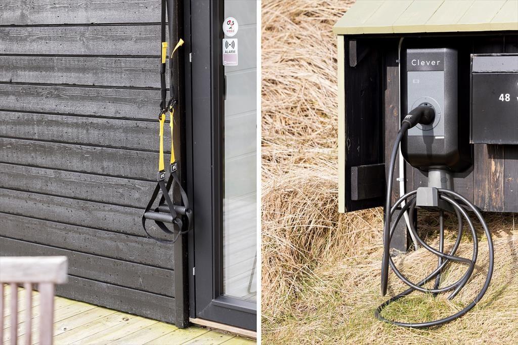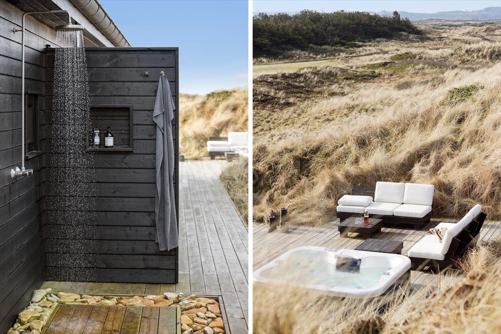 Forholdene er mindst lige så fornemme ude i det fri, hvor en stor træterrasse breder sig hele vejen rundt om huset. Der er masser af plads, så hvis du vil starte dagen med at meditere eller lave yoga, kan det passende foregå her, i morgensol og med udsigt over det åbne landskab. I løbet af dagen kan du slå dig ned med en god bog i havestolene, benytte TRX-krogene til at holde formen ved lige eller samles med dine kære ved havebordet eller i loungemøblerne. Og når solen er på vej ned, kan du overveje, om du vil smutte ned på stranden, eller om du foretrækker at overvære den magiske overgang fra dag til aften godt tilbagelænet i spabadet.