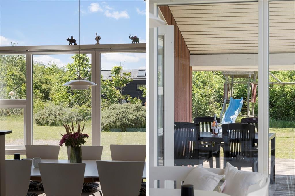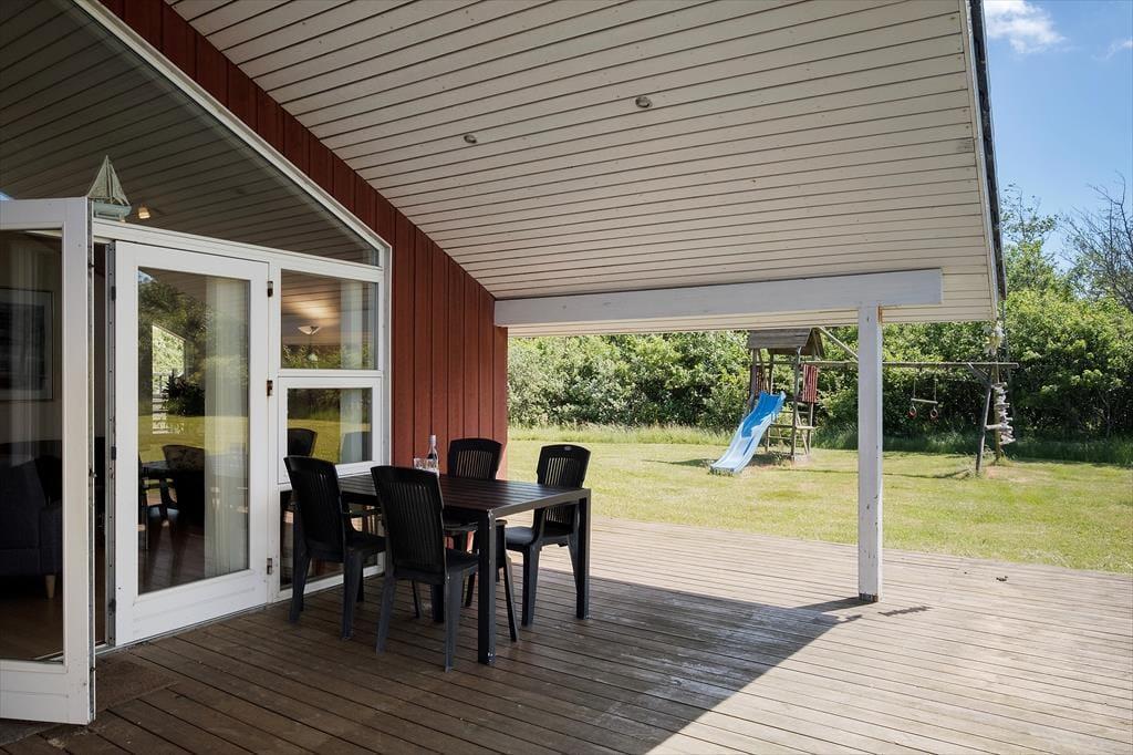 Den åbne naturgrund ligger dejligt uforstyrret for enden af en lukket vej og lige op mod et grønt bælte, så det er et dejligt sted at slappe af og nyde det gode vejr. På græsplænen har I masser af plads til at spille havespil, og børnene kan hygge sig med at bygge slotte i sandkassen, gynge, rutsje og klatre i legetårnet. Trænger du til at sidde helt roligt med en god kop kaffe, mens du lytter til fuglesang og ser på drivende skyer, kan du slå dig ned på en af husets terrasser. Den ene er delvist overdækket, mens den anden er afskærmet med et læhegn – og her står der også en udendørs grillpejs, så du kan lave mad i det fri eller bare nyde synet af flammerne, der lyser op i aftenmørket.