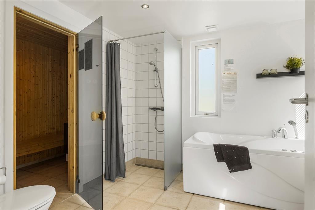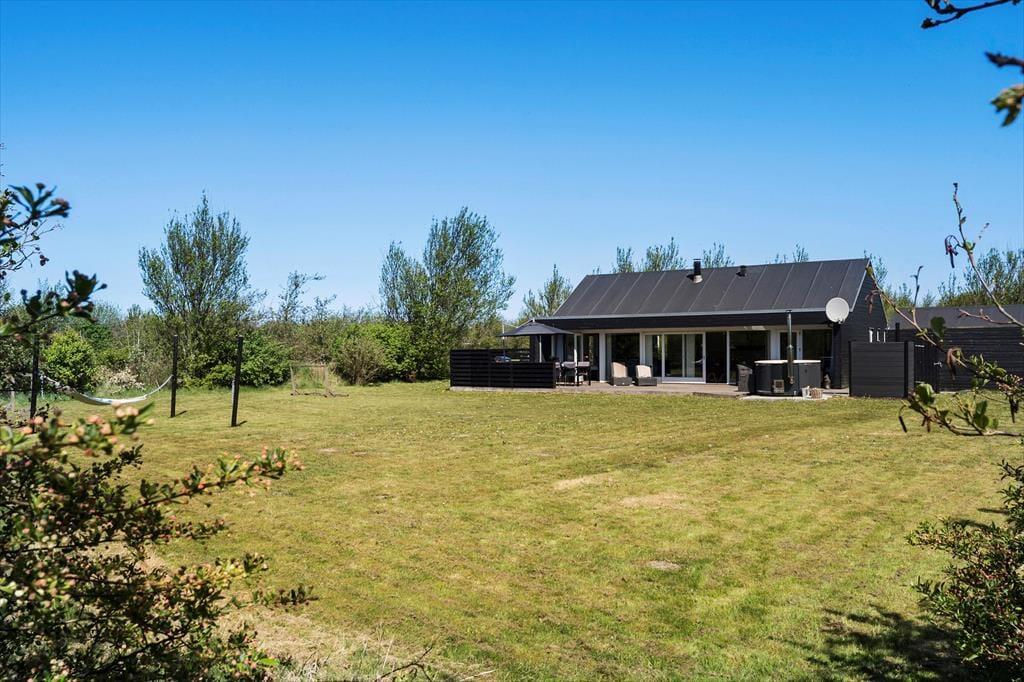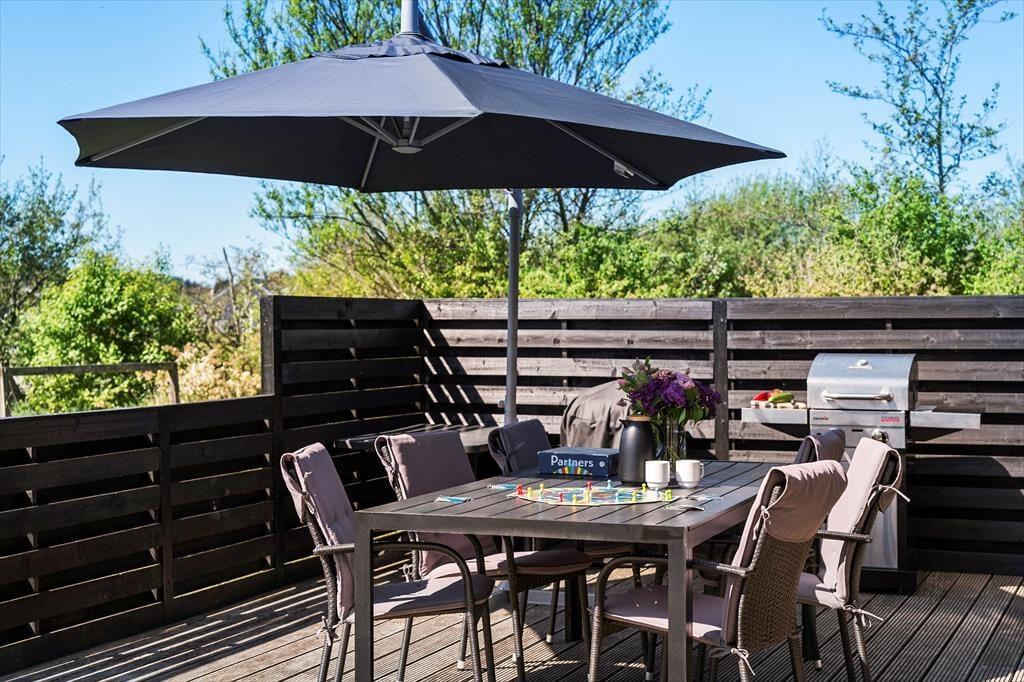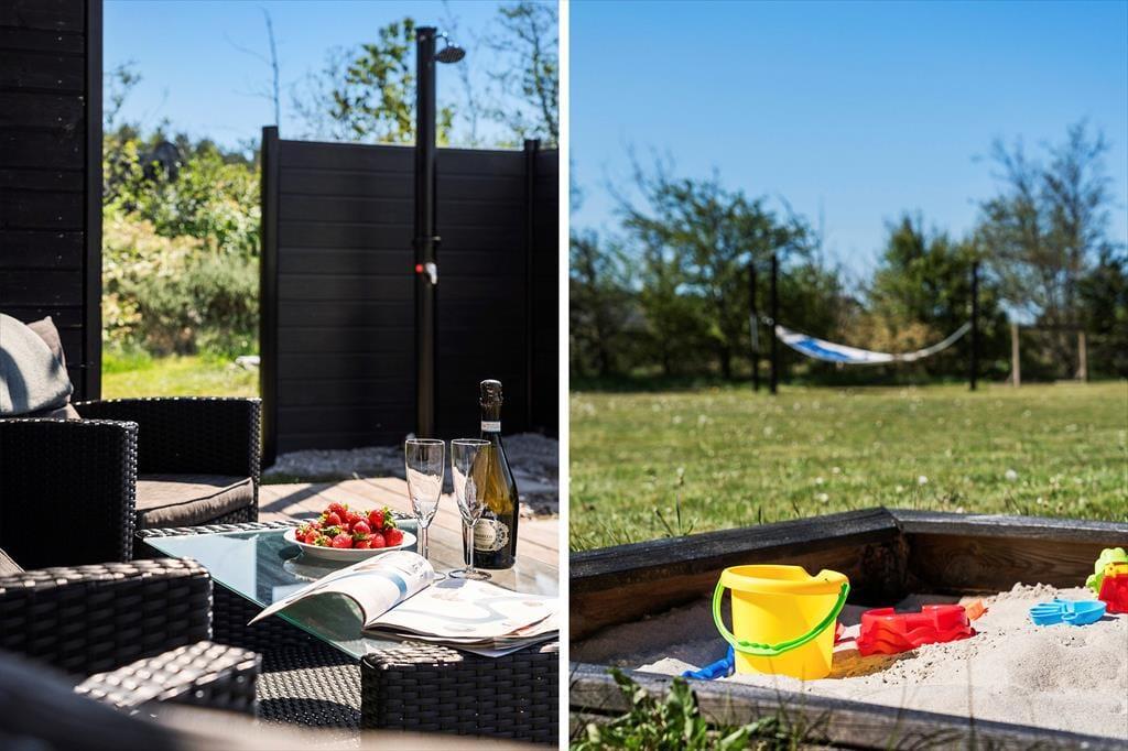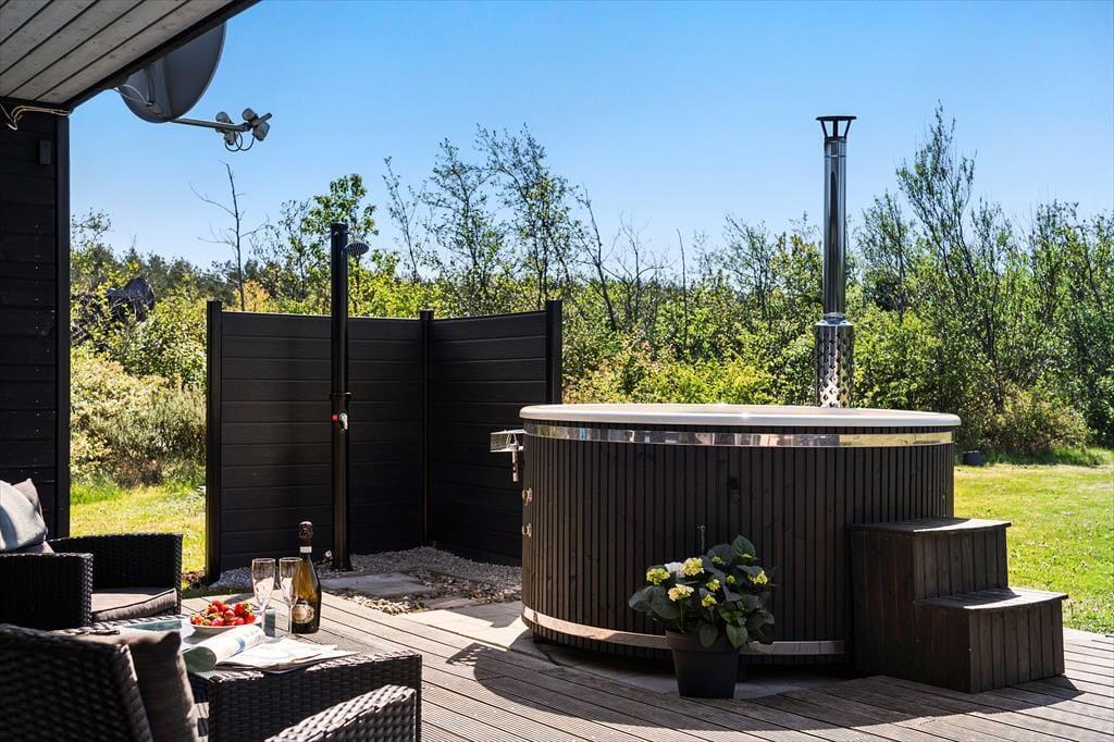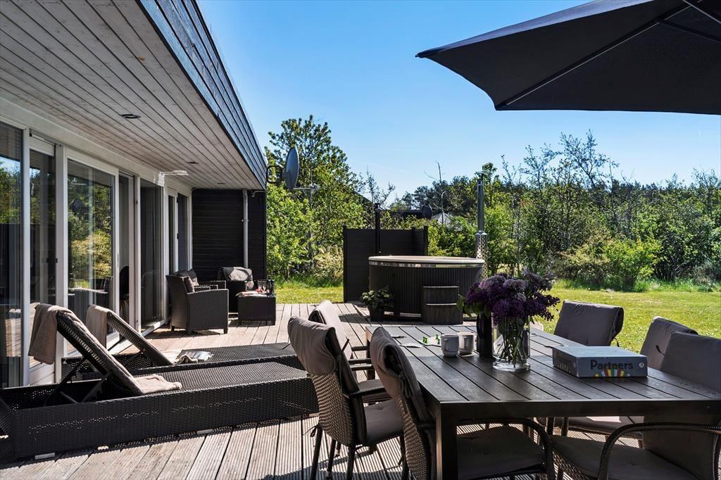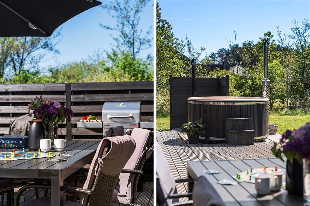 Udenfor venter en stor og skøn terrasse, hvor du kan nyde de lange, lyse sommeraftener. Havemøblerne og liggestolene sikrer optimal komfort, så du kan slappe af og nyde solen i fred og ro. Haven er flot beplantet og giver en følelse af privatliv og hygge. Her kan du også slappe af i det dejlige vildmarksbad og nyde livet med udsigt til haven. For de yngste gæster indbyder den store græsplæne til leg og boldspil. Der er også gode parkeringsforhold ved huset, så du nemt kan parkere bilen og have alt indenfor rækkevidde.