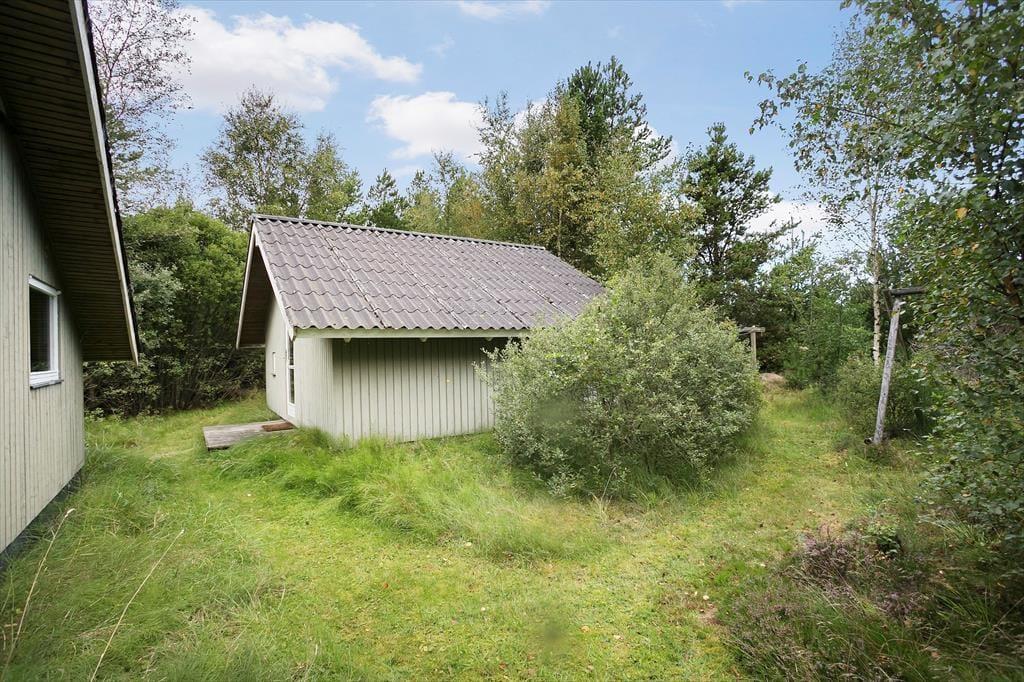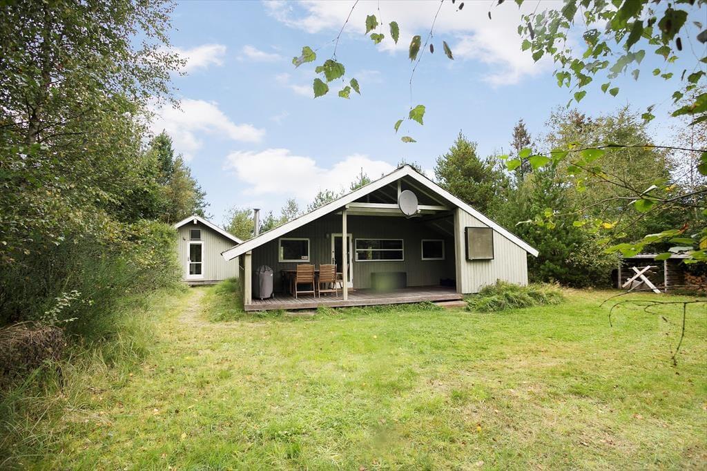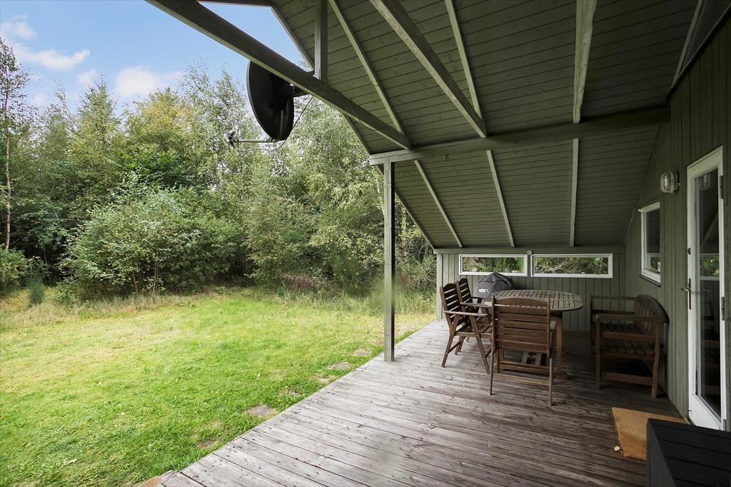 Foran hovedhuset har I en overdækket terrasse, som med sin sydvendte placering er en skøn og solrig opholdsplads. Grunden er med sine 2.852 m2 særdeles stor, og beplantningen sørger for, at I kan sidde helt uforstyrret. Man får virkelig fornemmelsen af være midt i naturen, og det er da heller ikke sjældent, at vilde dyr kommer på visit forbi sommerhuset.