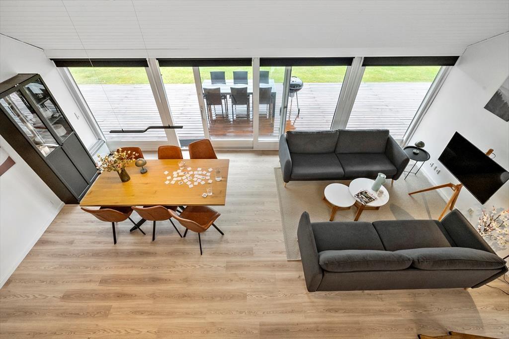 Fra stuen er der direkte udgang til den dejlige terrasse, hvor du kan slå dig ned i havemøblerne og nyde solen dagen lang. Terrassen er delvist overdækket og har gode læforhold, så du kan blive siddende ude, selv når duggen falder. Den grønne grund omkring huset indbyder til både afslapning og leg, og der er god plads til at nyde naturen i fred og ro. Om aftenen kan du tænde op i grillen og nyde et godt måltid under åben himmel, mens dagens sidste solstråler falder over området.