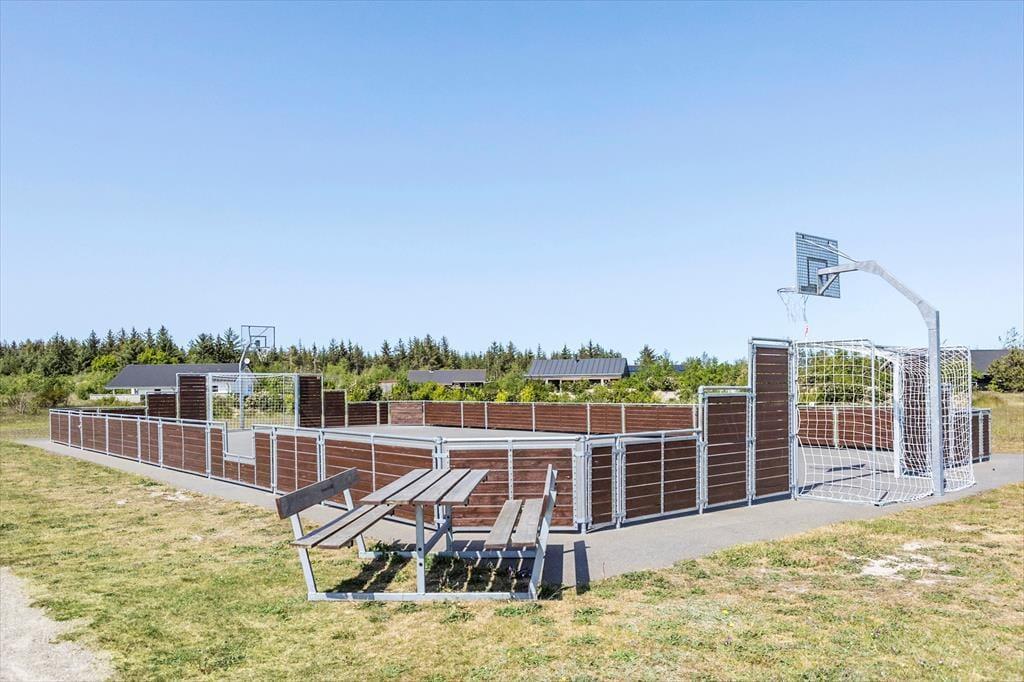 Sommerhuset ligger i et helt unikt område, hvor fællesarealet spiller en stor rolle. Her er der virkelig mulighed for en aktiv ferie for alle generationer og I kan frit og ubegrænset vælge mellem følgende aktiviteter; Fodboldgolf med 9 huller, nyanlagt minigolfbane fra 2022 samt krolfbane med krokethuller og Disc Golf. Der er mange muligheder for fodbold, både på græs og på streetbanen, hvor der også findes basketnet. Har I lyst til beachvolley er dette også en mulighed og skal formen holdes ved lige, er der flere forskellige fitnessstationer. Til de mindste gæster findes der en kæmpe sandkasse, gynger, legetårn, rutsjebane, legehus, svævebane, balancebom, edderkoppenet og vippe. Efter dagens aktiviteter kan I slappe af i grillhytten, hvor I har mulighed for at lave bål, eller I kan nyde en aftentur på områdets vandre- og cykelsti der bringer jer rundt i hele området.