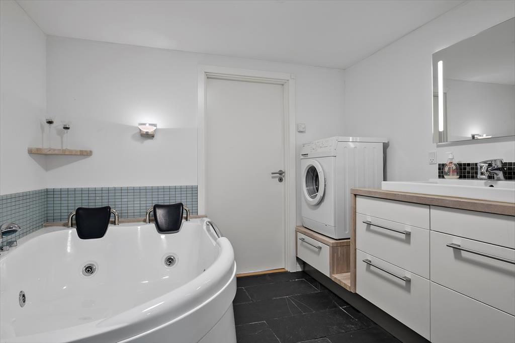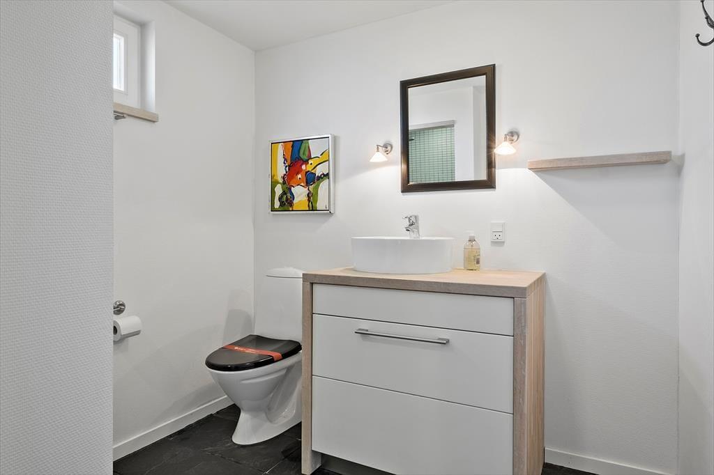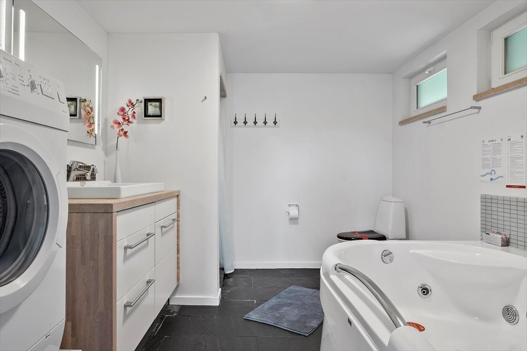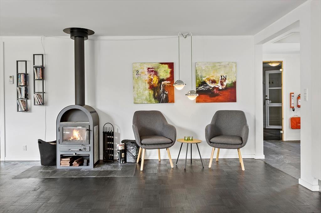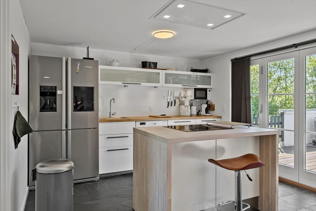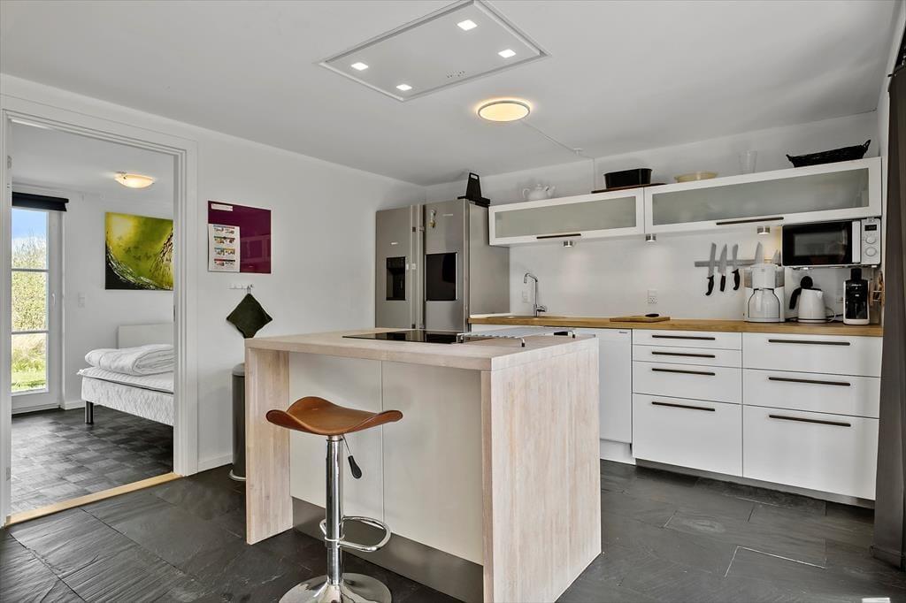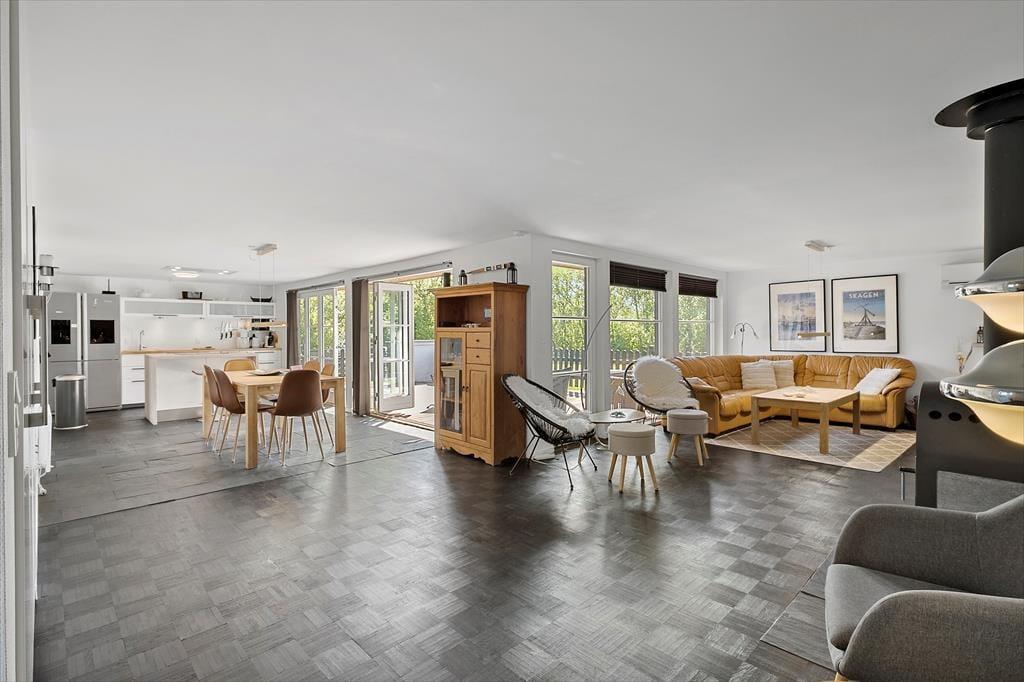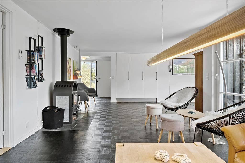 Husets 124 m2 byder på mange gode løsninger og er ideelt til børnefamilien eller to par som ønsker lidt kvalitetstid sammen. Samlingspunktet er det åbne køkken med spisestue og her kan de store vinduespartier, åbnes helt op til terrassen, så den danske sommer kan nydes i fulde drag. Køkkenet er veludstyret og har bl.a. amerikansk køleskab og fra kogeøen kan man samtidigt med madlavningen, følge med i familiens gøremål. De iøjnefaldende sorte gulve, som er henholdsvis skifer og sort lakerede trægulve, er gennemgående i hele huset og passer godt til møblerne og indretningen. Der er i alt tre soveværelser samt to badeværelser, og som ekstra luksus, er der desuden spabad og sauna som kan lade batterierne op efter en dejlig dag ved stranden, i naturen eller områdets mangle udendørs faciliteter.
