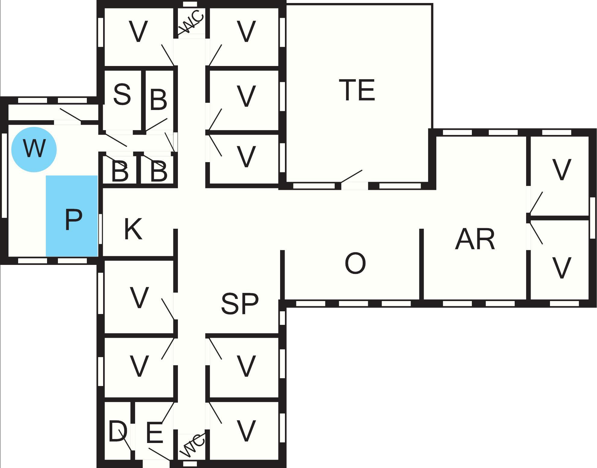 10 Soveværelser: (1DS)+(1DS)+(1DS)+(1DS)+(1DS)+(1DS)+(1DS)+(1DS)+(2K+1DO)+(2K+1DO), barneseng