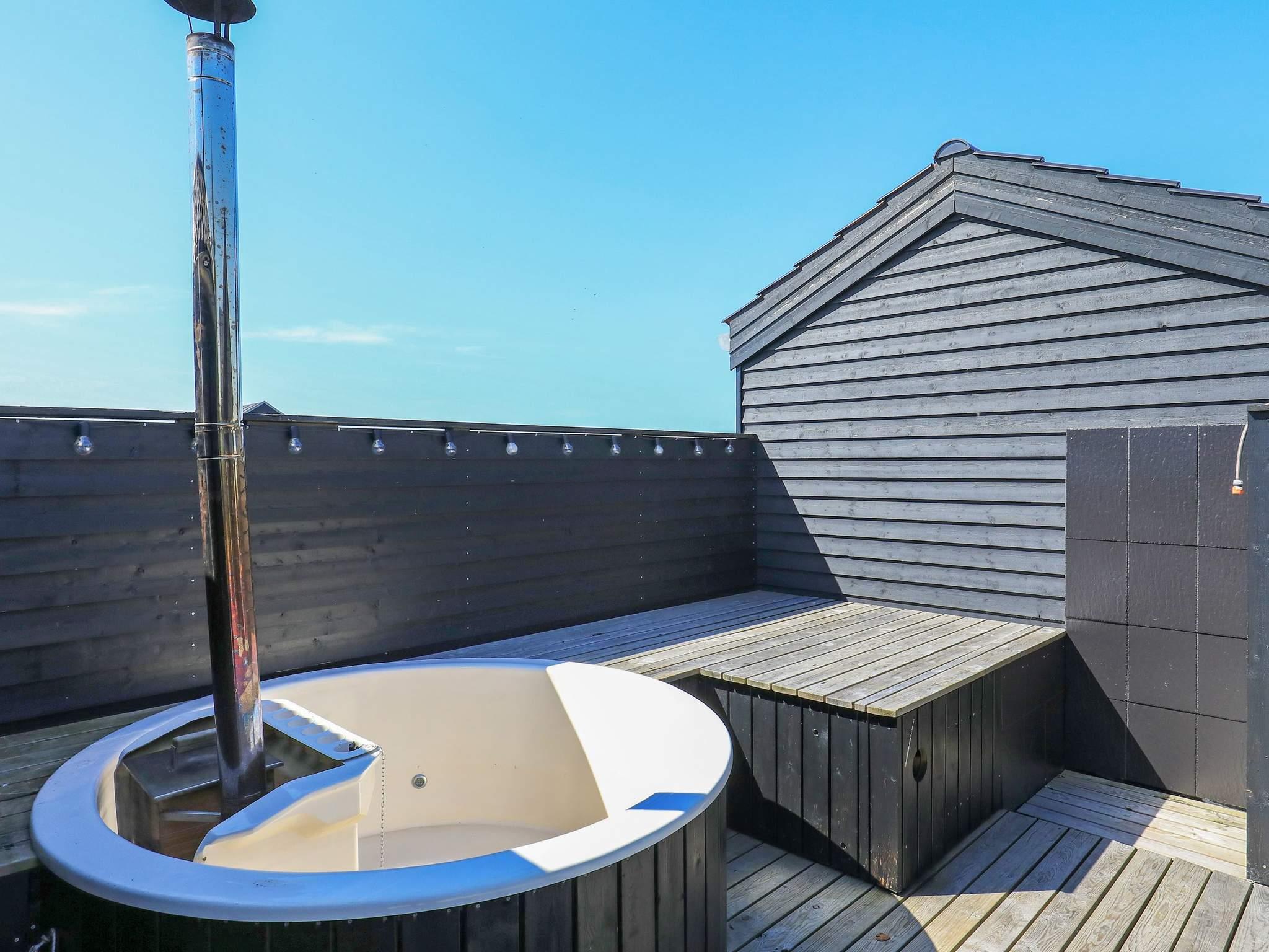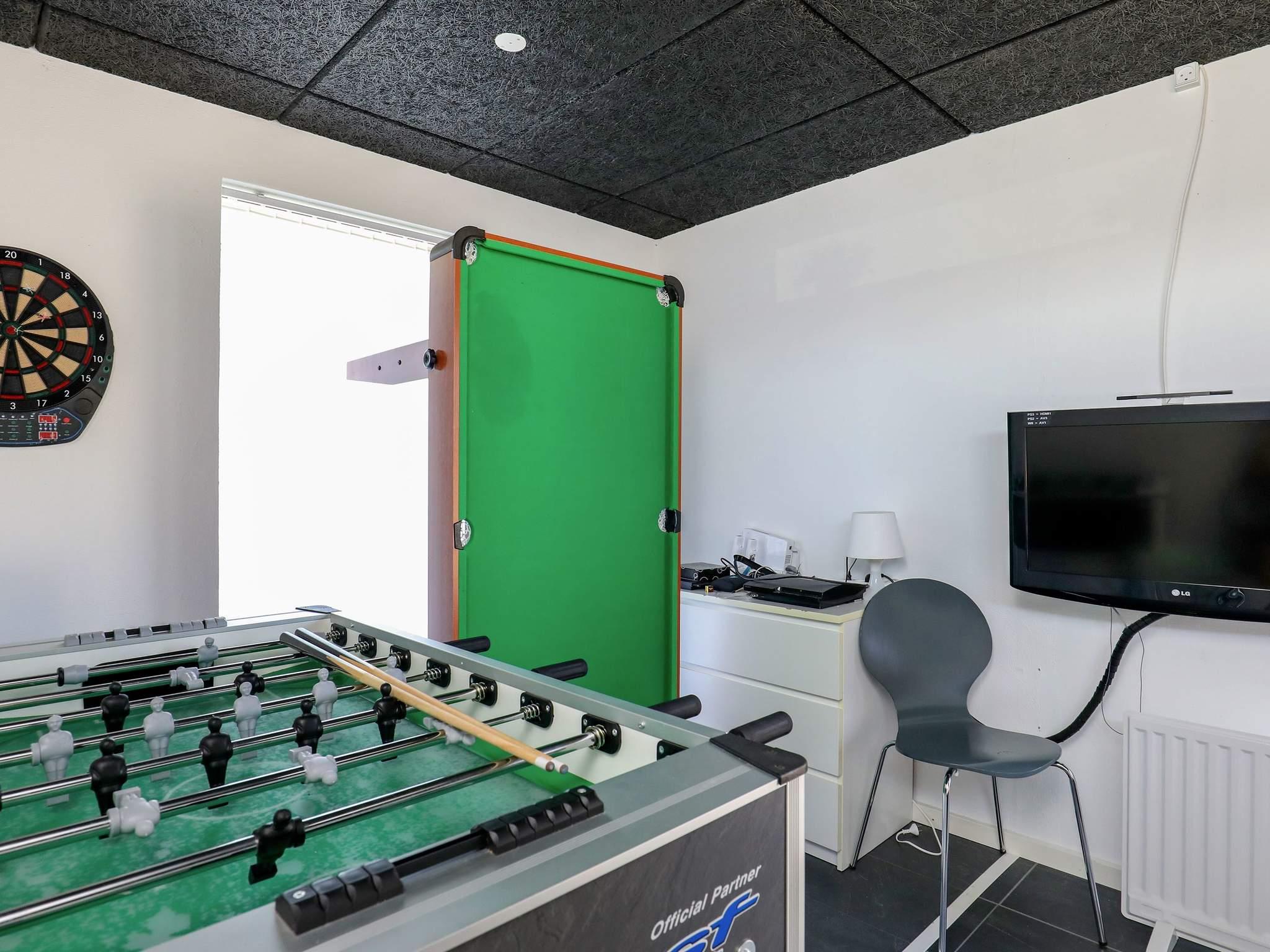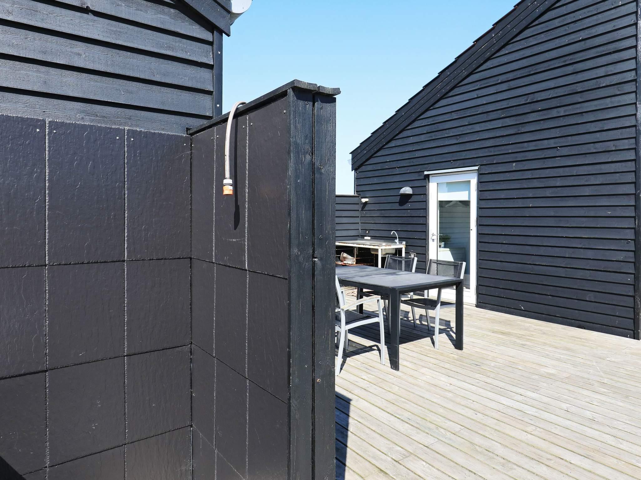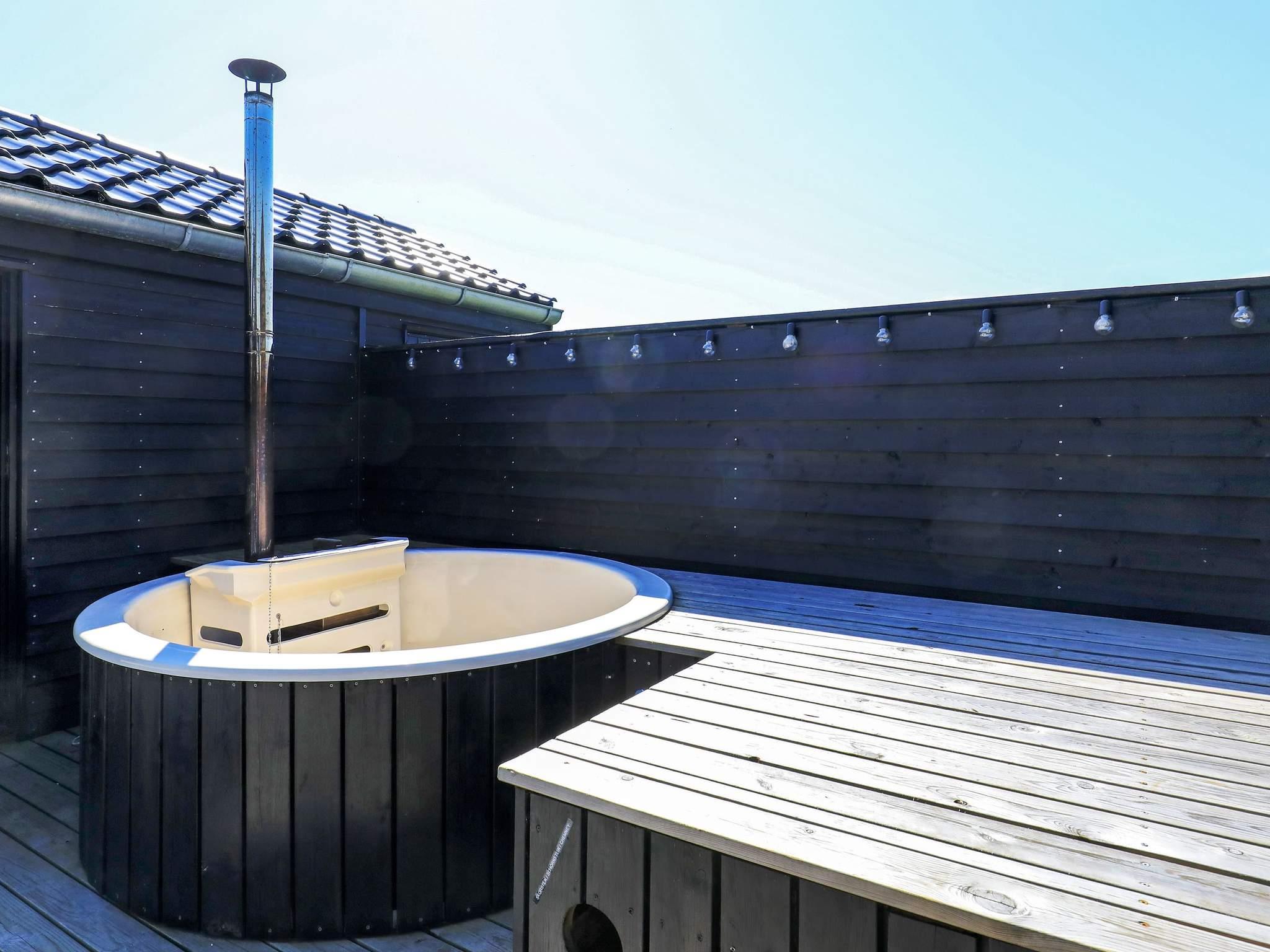 Mellem hovedhuset og to tilhørende annekser – forbundet via en stor terrasse – finder du et imponerende wellnessområde med brændefyret vildmarksbad, udebruser, indbyggede liggestole og terrassevarmer. Det ene anneks rummer aktivitetsrum og to opredninger, mens det andet huser en stor brændefyret svedehytte (sauna til 10 personer) samt depotrum. Den sydvendte terrasse har karakter af en solgård og inkluderer et overdækket område samt et fuldt udstyret udekøkken – perfekt til lange sommeraftener.