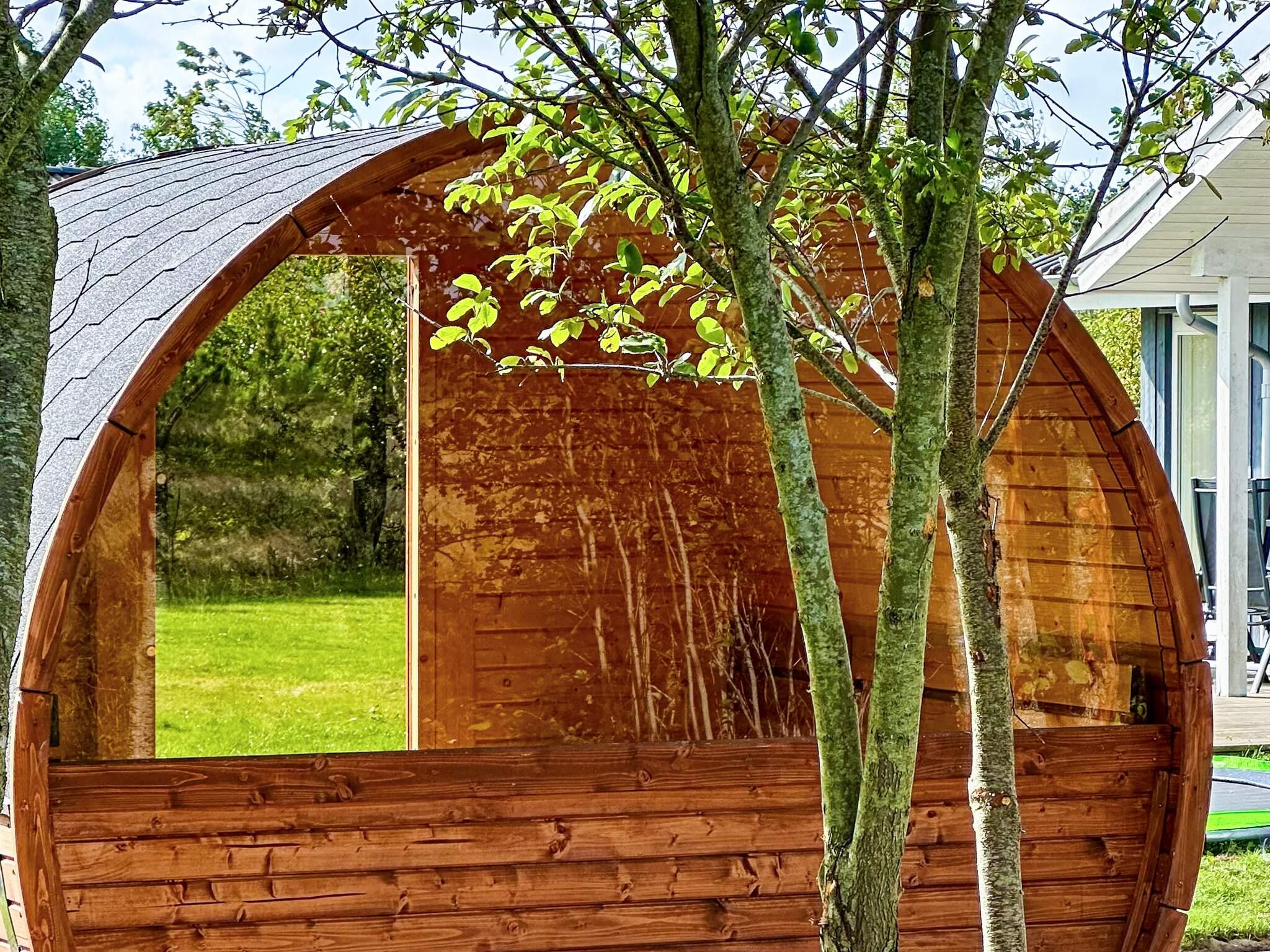 Wellness-område med vildmarksbad (på strøm,brugervejlednig i huset) til 8 personer med LED-lys og bobler. Derudover saunatønde med plads til 6-8 personer inkl. stort glasparti, hvor naturen kan opleves, mens man nyder varmen.
