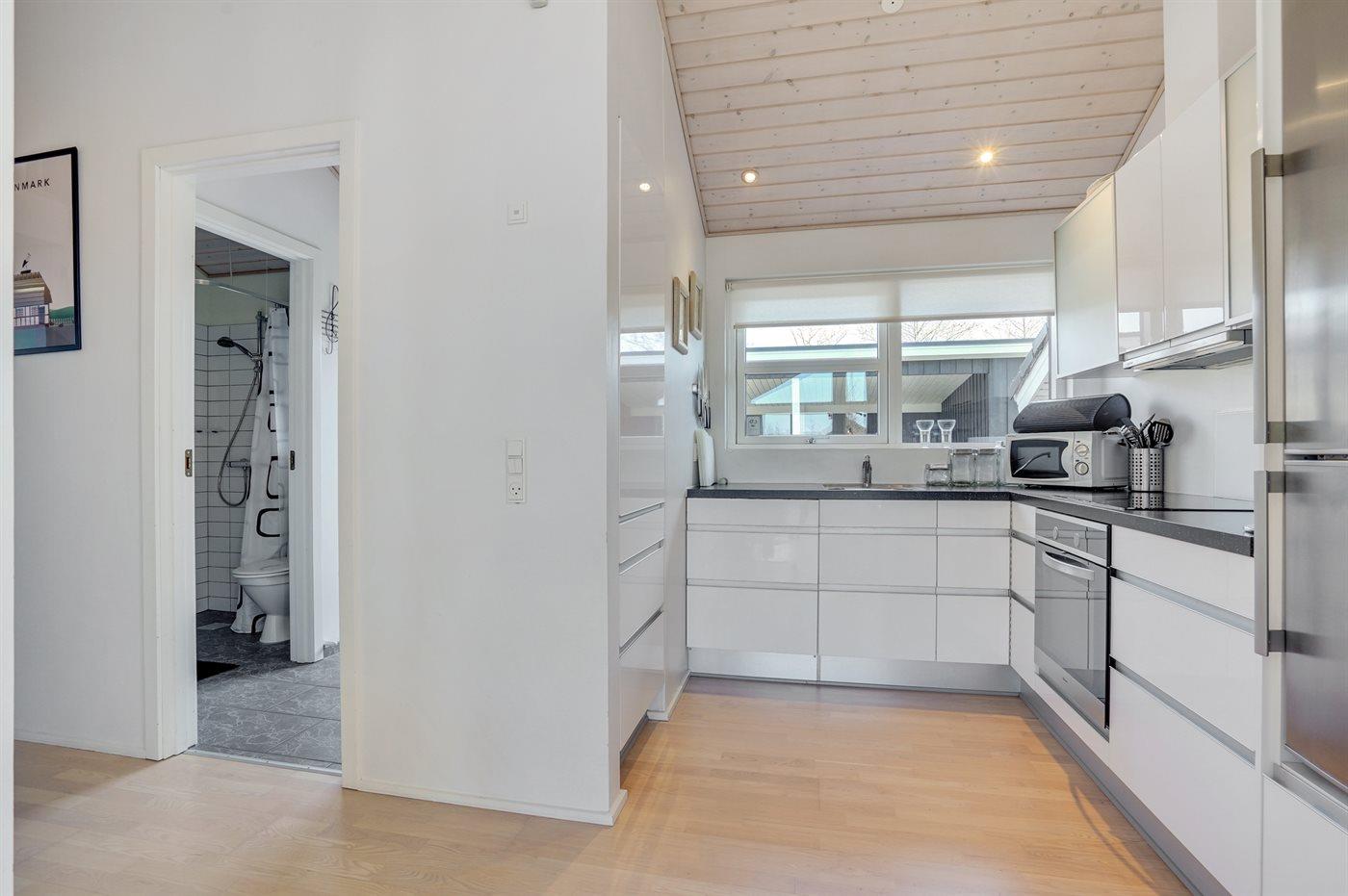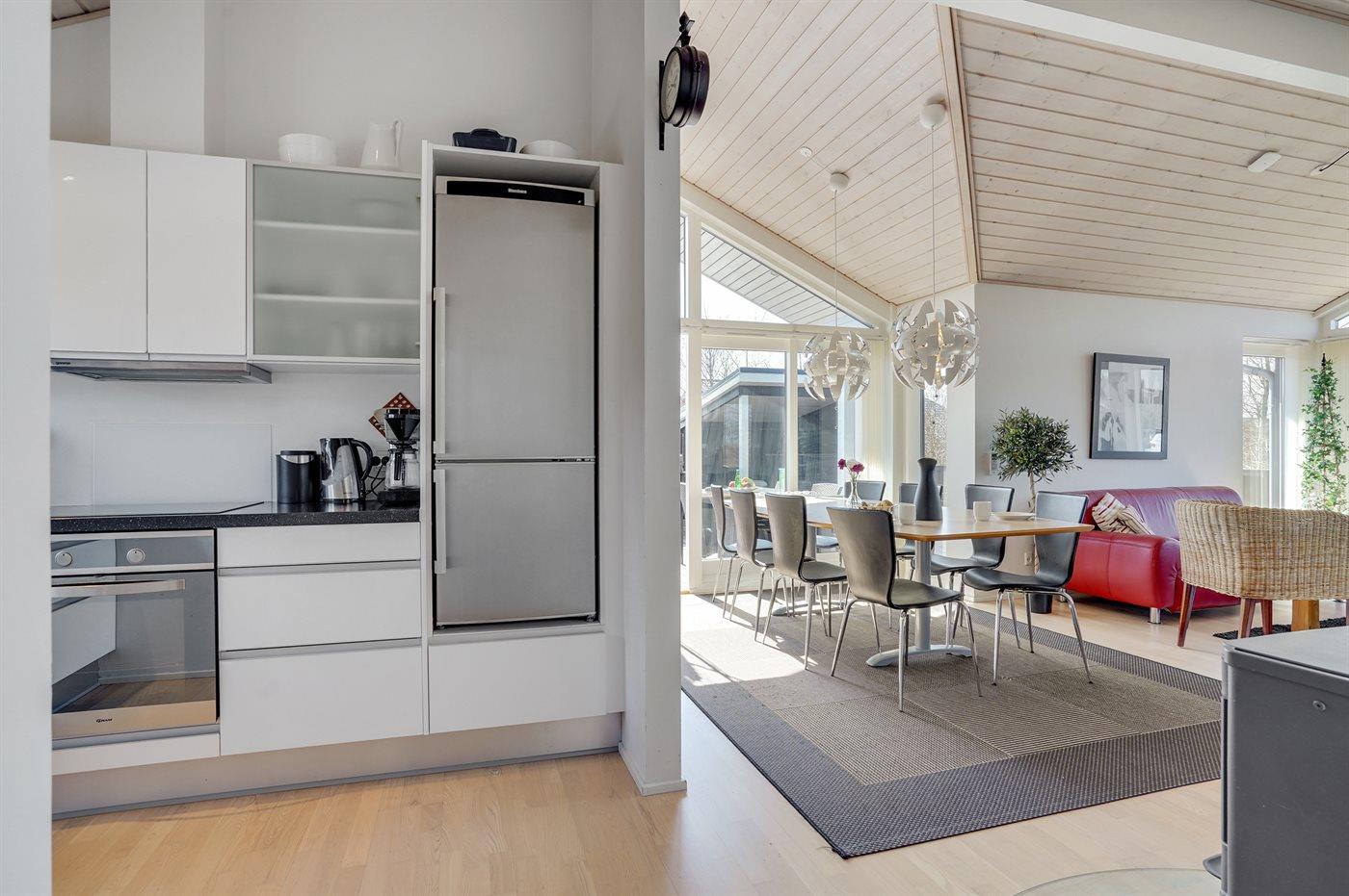 Køkkenet er udstyret med 1 køleskab. Der er 4 keramiske kogeplader, varmluftovn, mikrobølgeovn samt opvaskemaskine.
