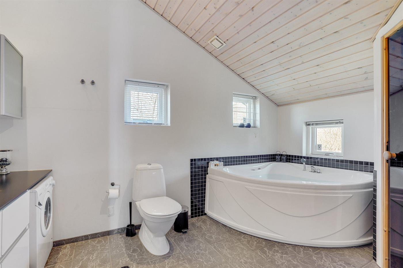 Der er 2 badeværelser med bruseniche og 2 toiletter. Der er gulvvarme på 2 badeværelser. I saunaen er der mulighed for afslapning.