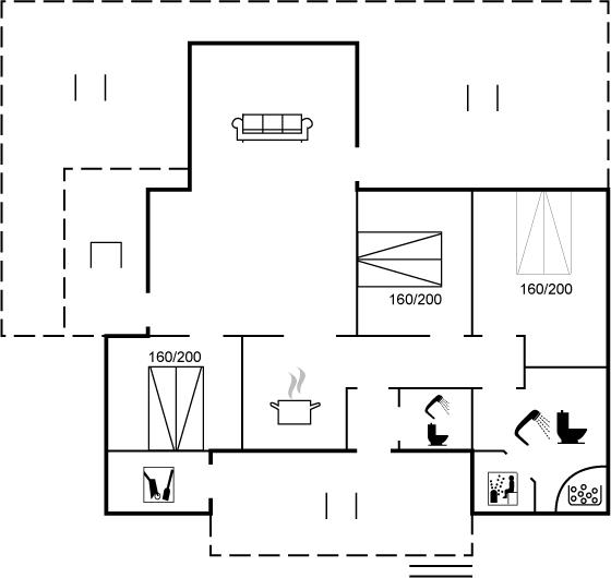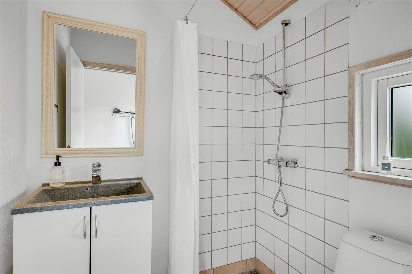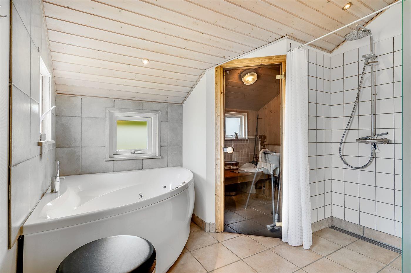 Der er 2 badeværelser med bruseniche og 2 toiletter. Der er gulvvarme på 2 badeværelser. I saunaen er der mulighed for afslapning.