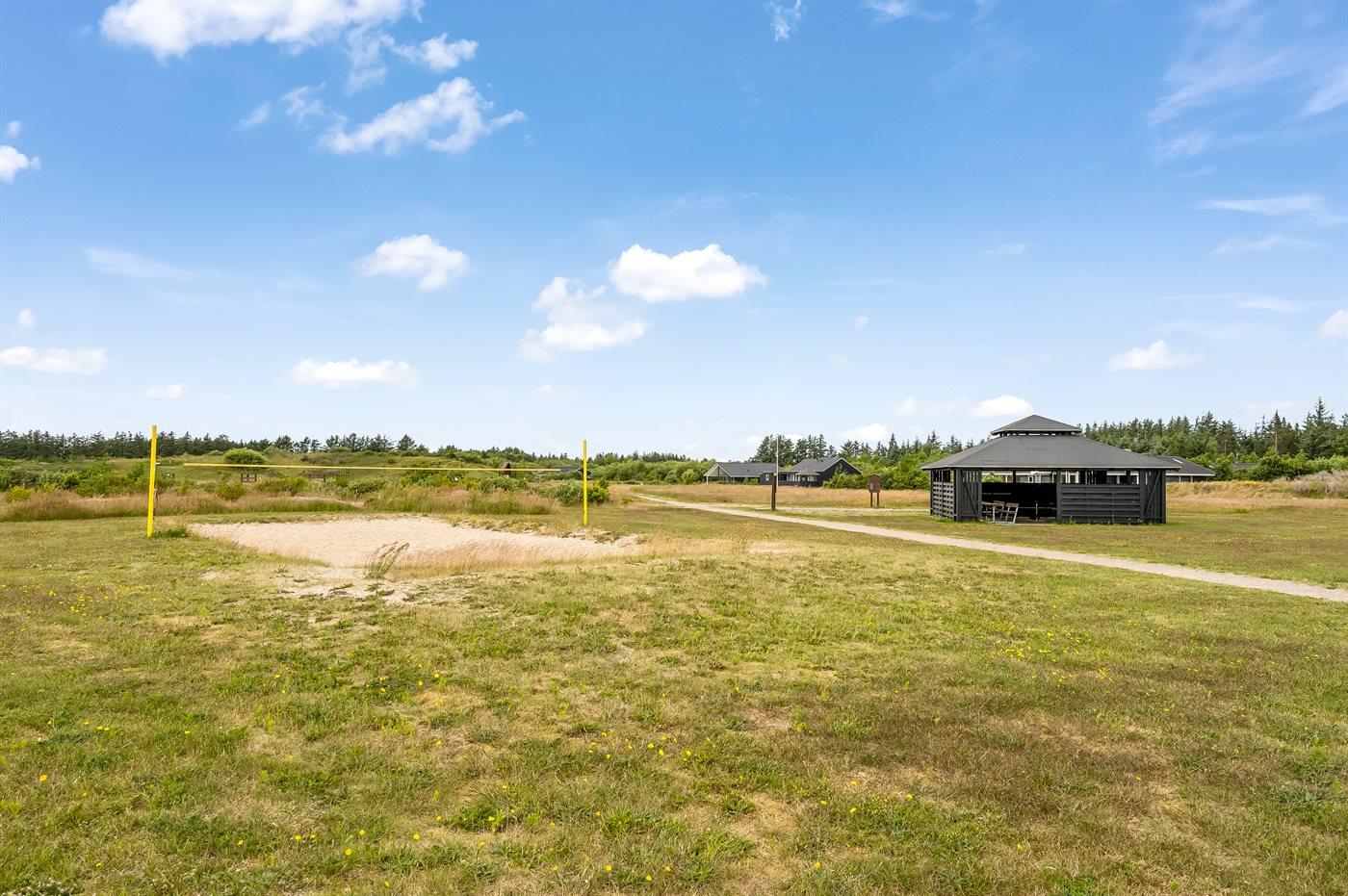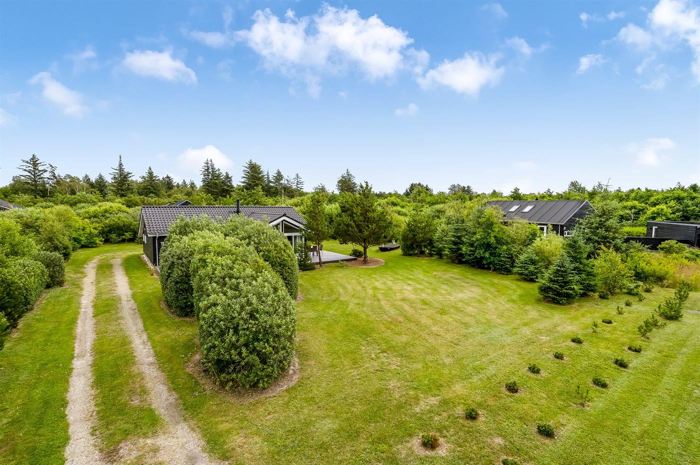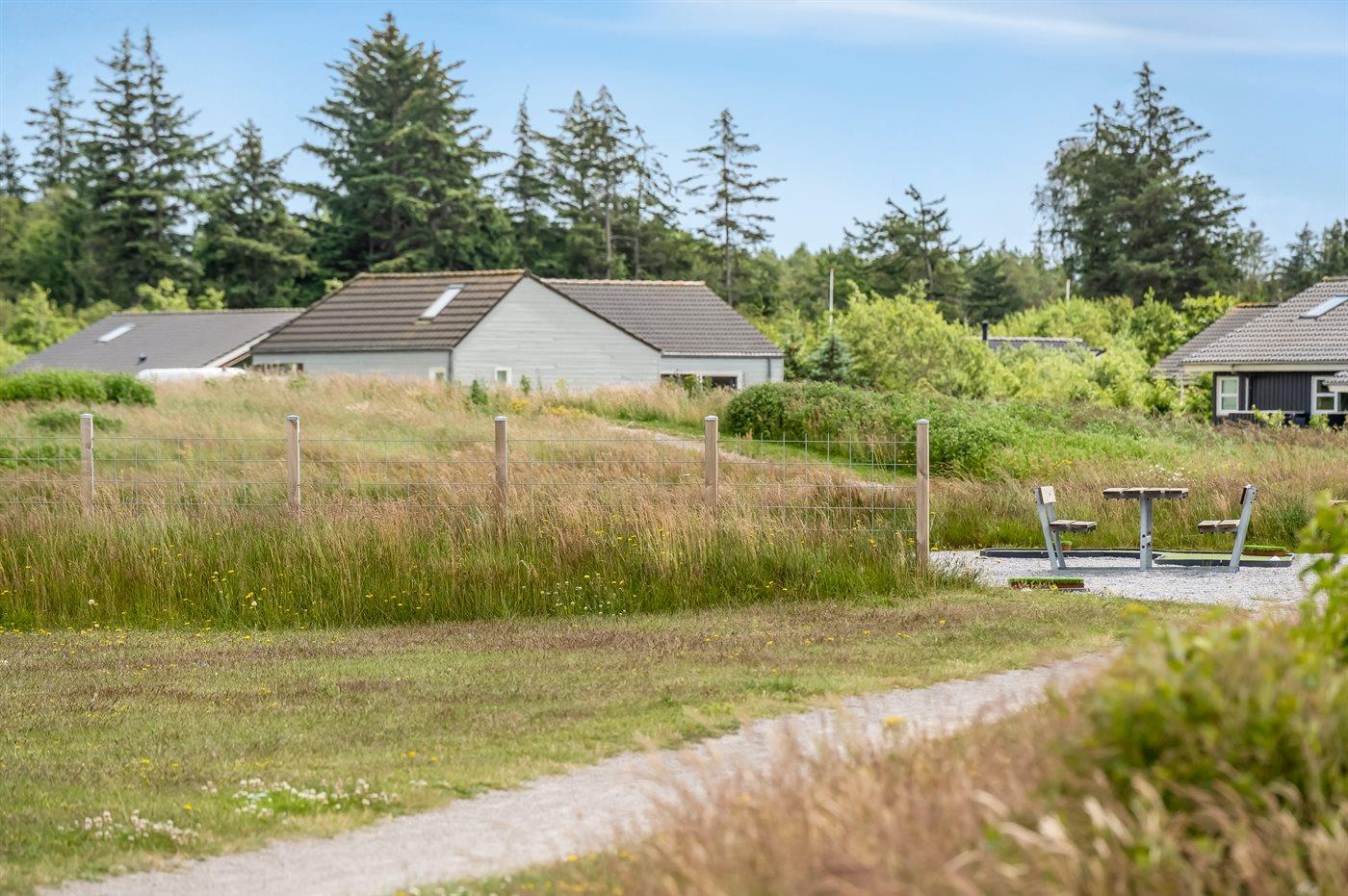Ferieboligen er beliggende på en 1450 m² stor naturgrund. Der er 3500 m til havet. Nærmeste forretning er beliggende i en afstand af 3000 m. Der er en golfbane i en afstand af 10000 m. Til ferieboligen hører 100 m² terrasseareal. Der er redskabsrum. Sandkasse. Shelter. Grill til rådighed. Der er installeret stik til opladning af elbil. Type 2 stik. Med 11 kW ladeeffekt. Parkering ved ferieboligen.