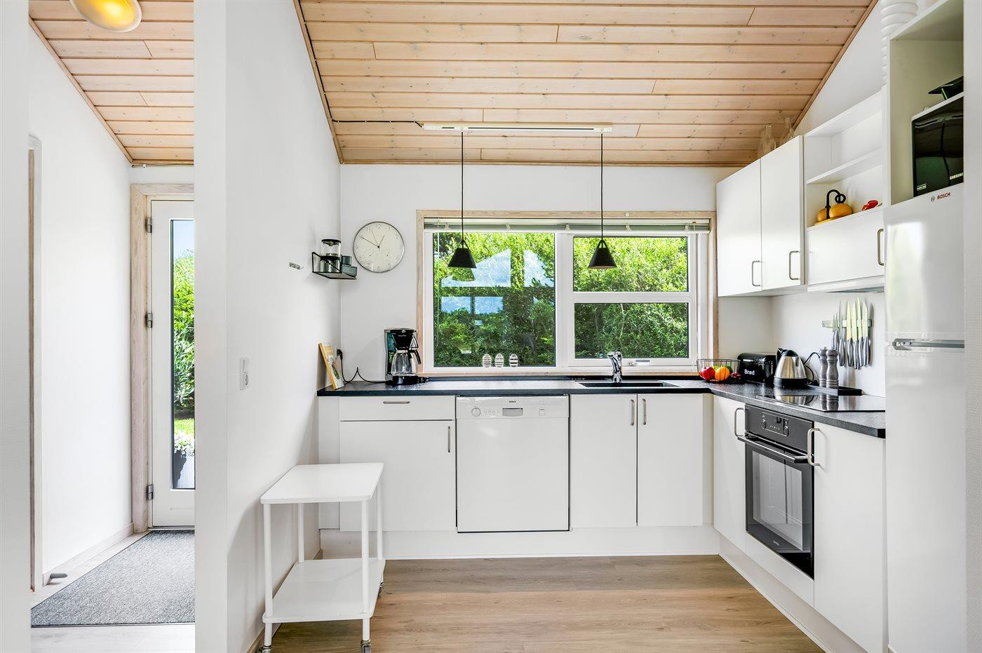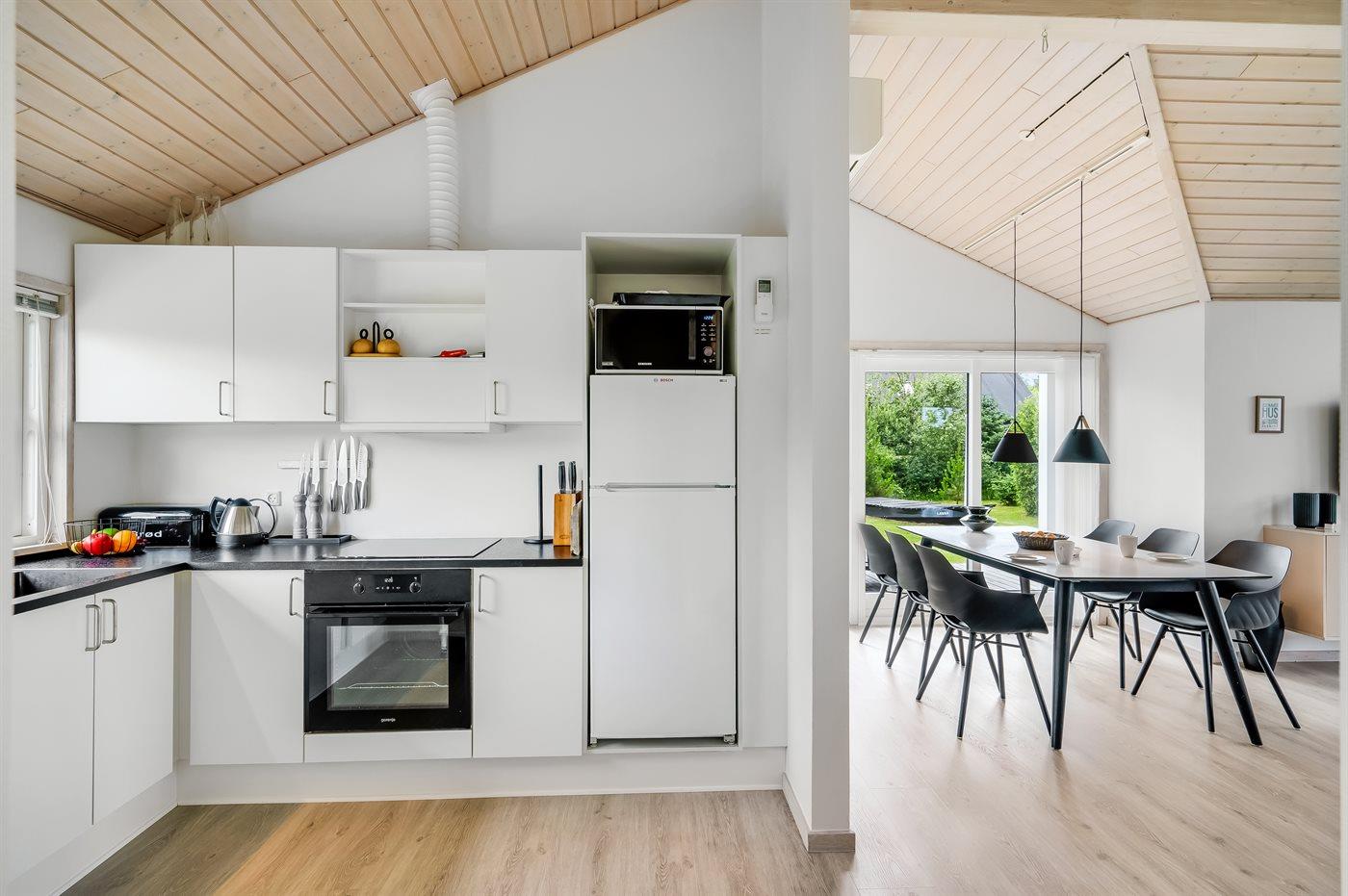Køkkenet er udstyret med 1 køleskab. Der er 4 keramiske kogeplader, varmluftovn, mikrobølgeovn samt opvaskemaskine.