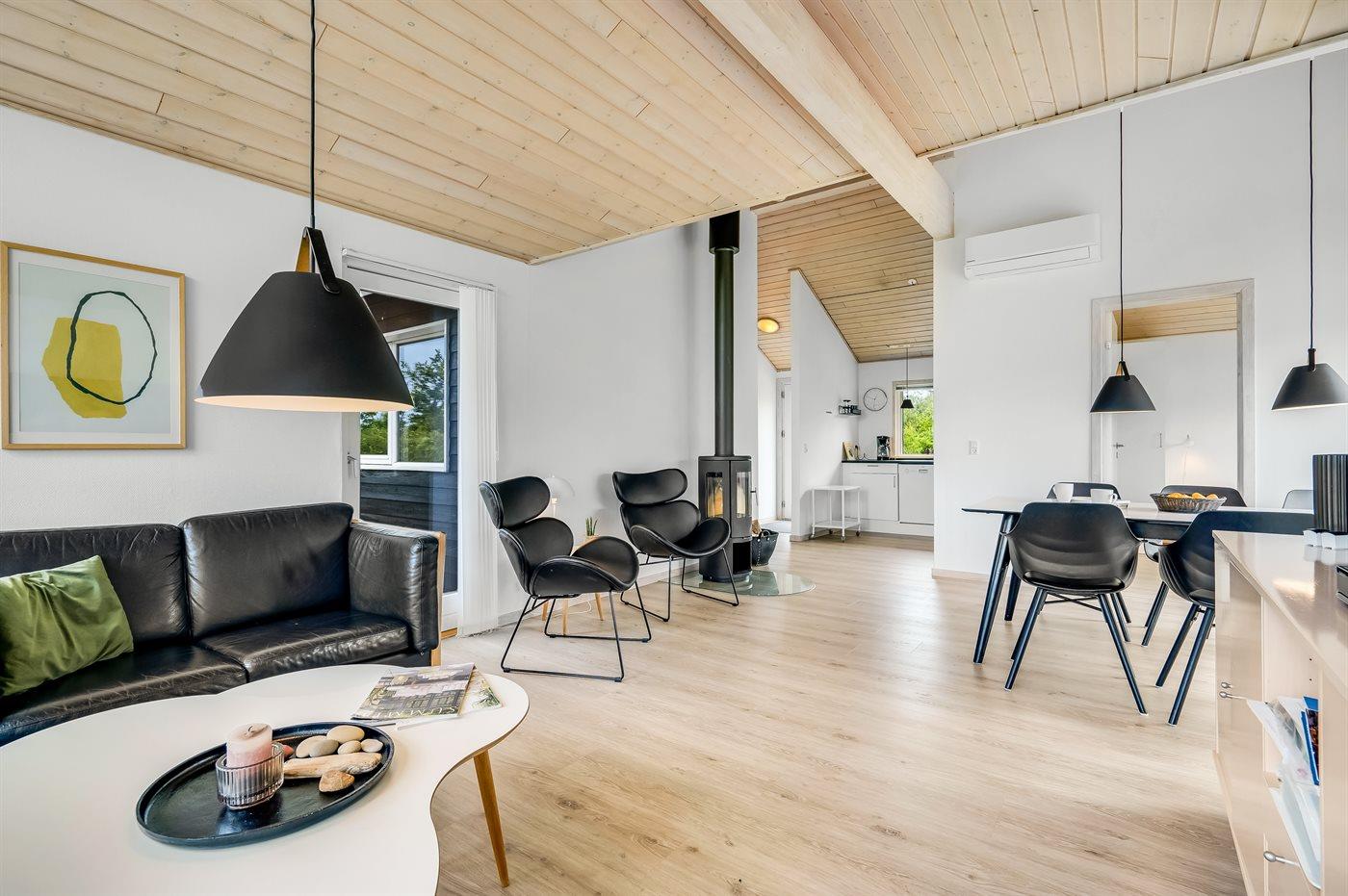 Sommerhus beliggende i et spændende ferieområde ved Tranum Strand på en stor, åben naturgrund. Indretningen er lys og moderne med køkken i åben forbindelse med opholdsstuen.