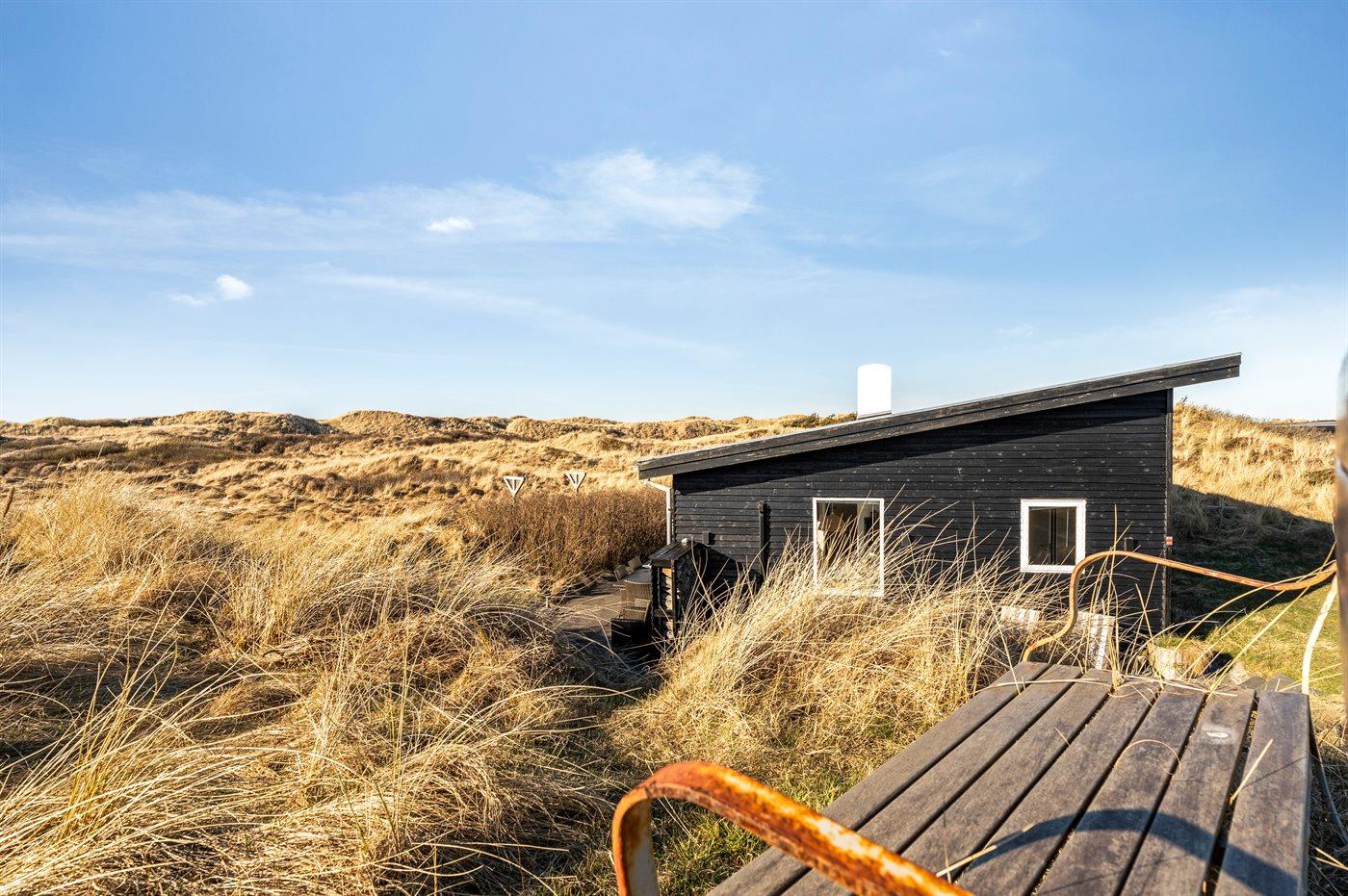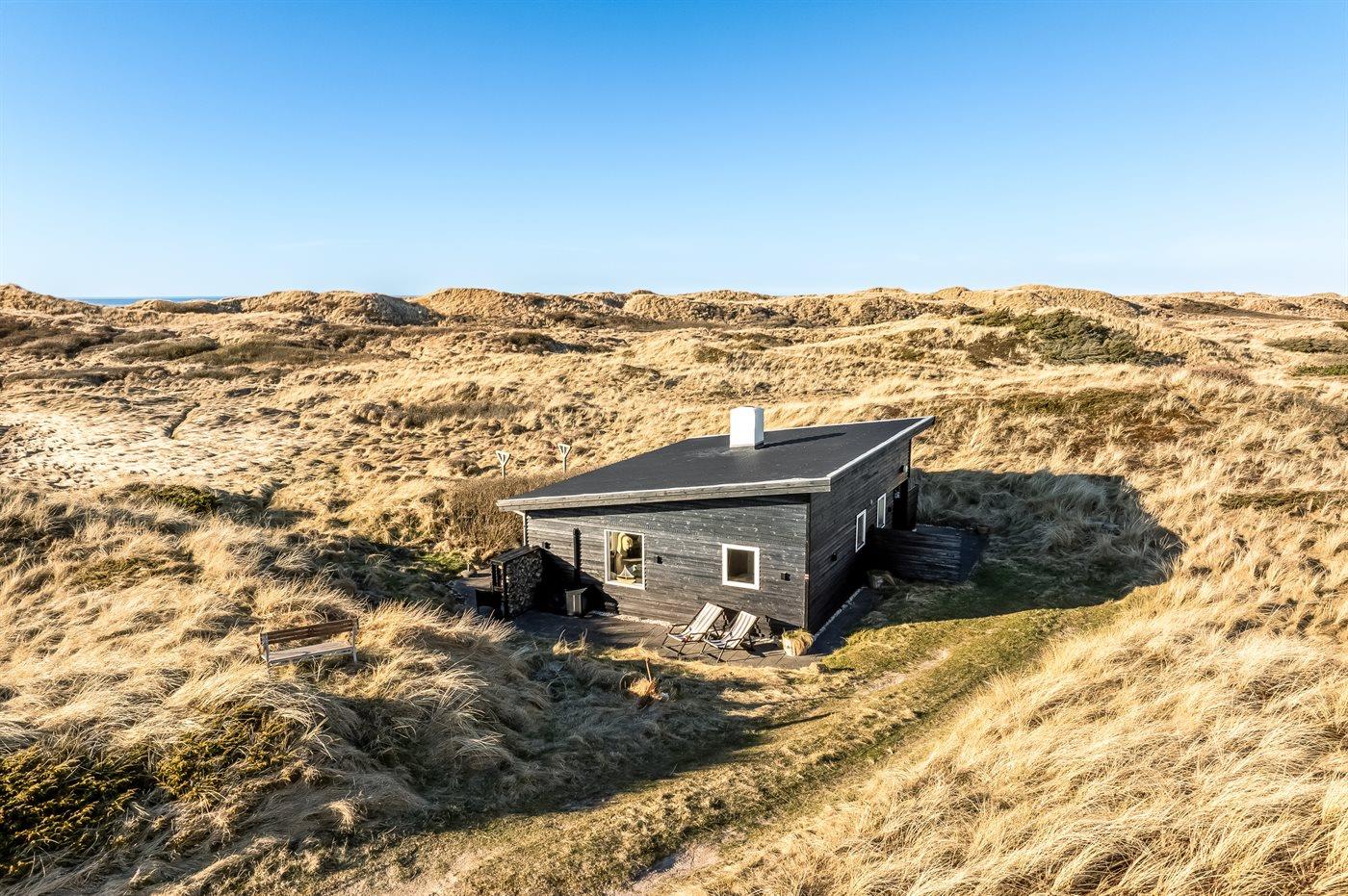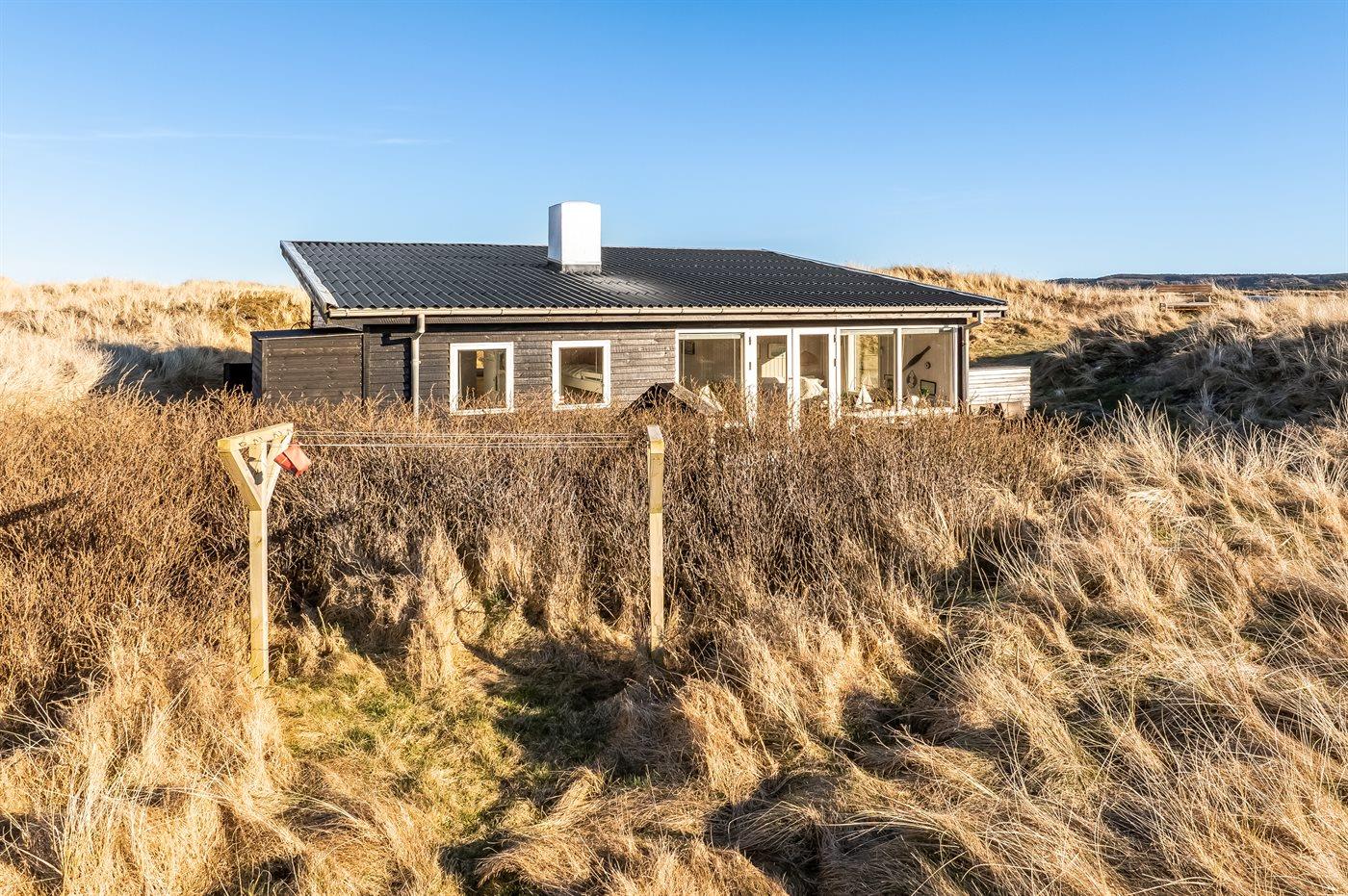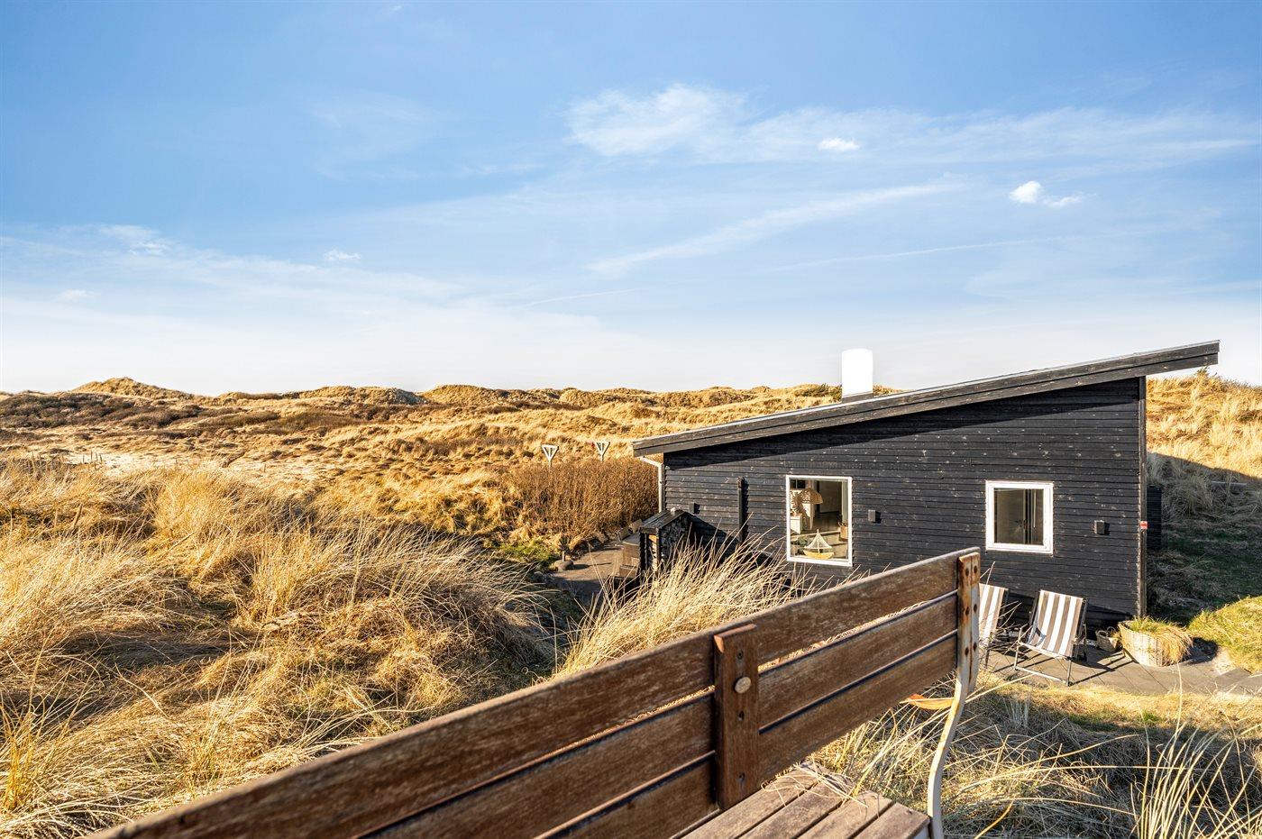 Charmerende sommerhus i første klitrække med udsigt over klitterne og havet i naturskønne Tranum.