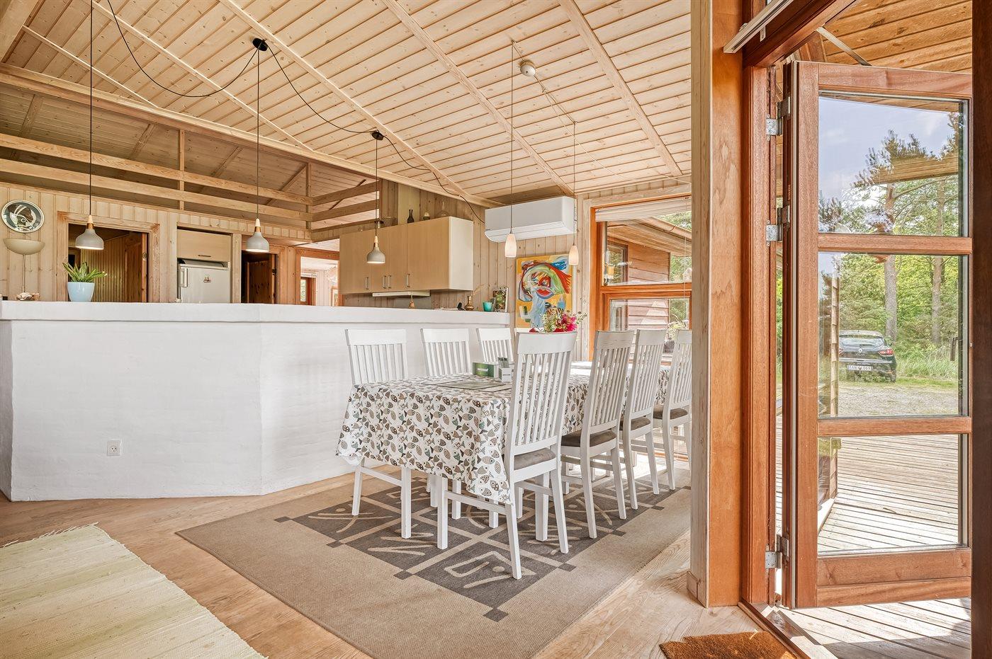 Sommerhuset er flot og velholdt med en indbydende indretning. Der er flere skønne terrasser – heraf én overdækket med direkte udgang fra køkkenet – så du kan nyde solen, grillmiddage eller en kop kaffe i læ og skygge, uanset vejret.