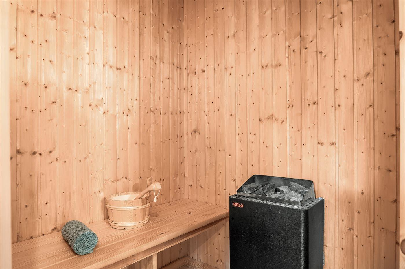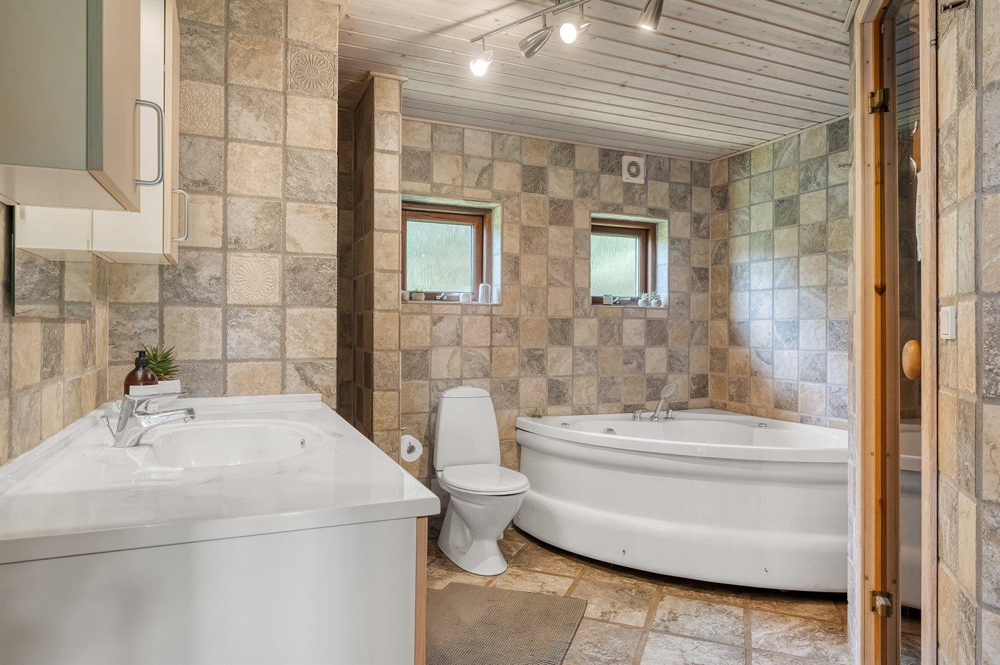 Der er 2 badeværelser med bruseniche og 2 toiletter. Der er gulvvarme på 2 badeværelser. I saunaen er der mulighed for afslapning.