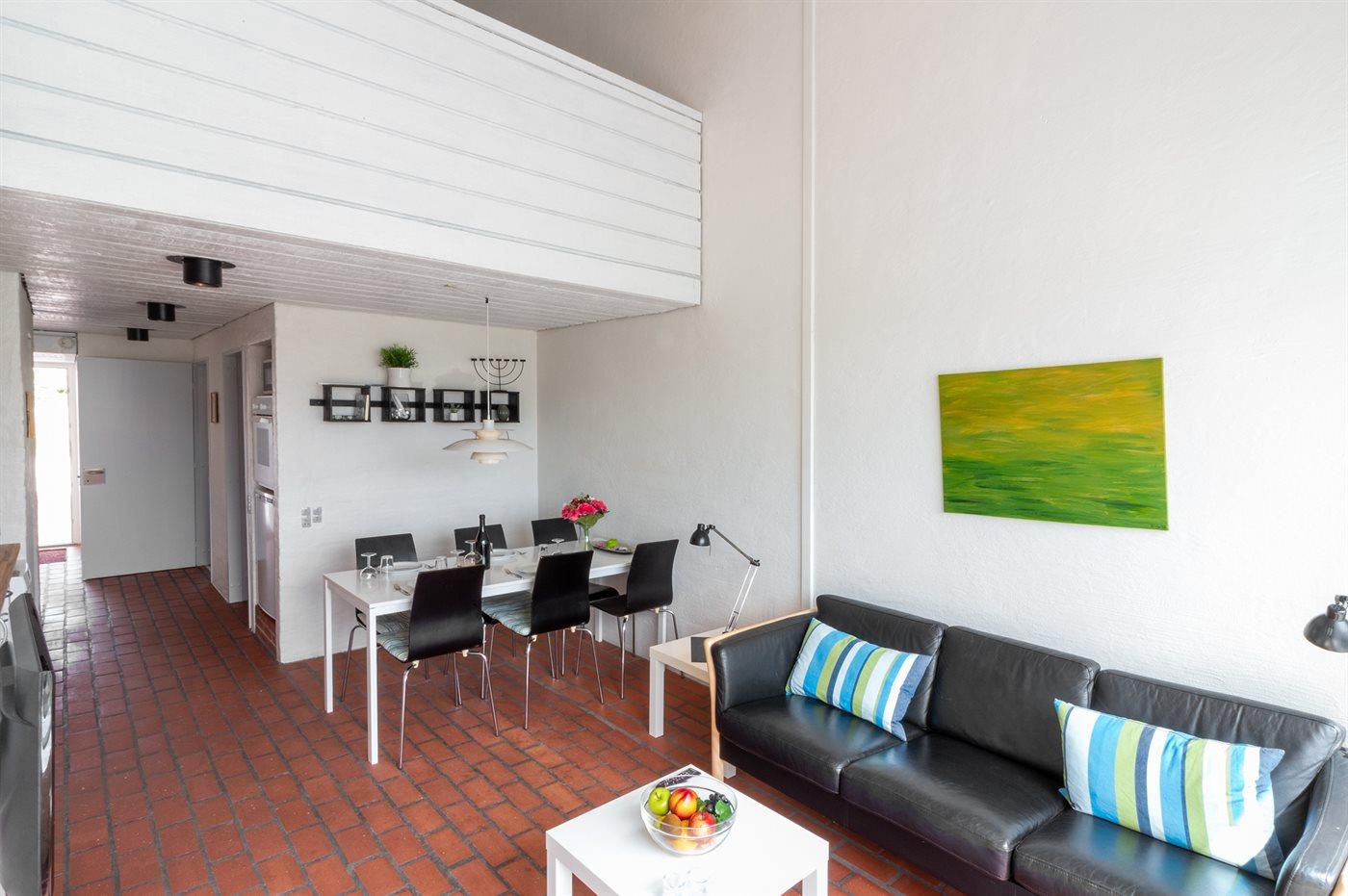 Denne ferielejlighed i rækkehusbebyggelse er en del af Tranum Klit Hotel beliggende i klitterne lige ved stranden og Vesterhavet i smuk og uforstyrret natur. Lejligheden er velholdt og indrettet enkelt i lyse og venlig omgivelser med udgang til egen lille terrasse med gode læforhold. Desuden er der via god trappe adgang til lejlighedens store og rummelige hems, hvor 2 af sovepladserne befinder sig. Af fællesfaciliteter kan nævnes indendørs swimmingpool med saltvand (til rådighed fra Påske til og med uge 42), udendørs swimmingpool med saltvand (til rådighed fra uge 26 til og med uge 31), sauna, udendørs legeplads, møntvaskeri samt aktivitetsområde ved receptionen med billard og bordtennis.