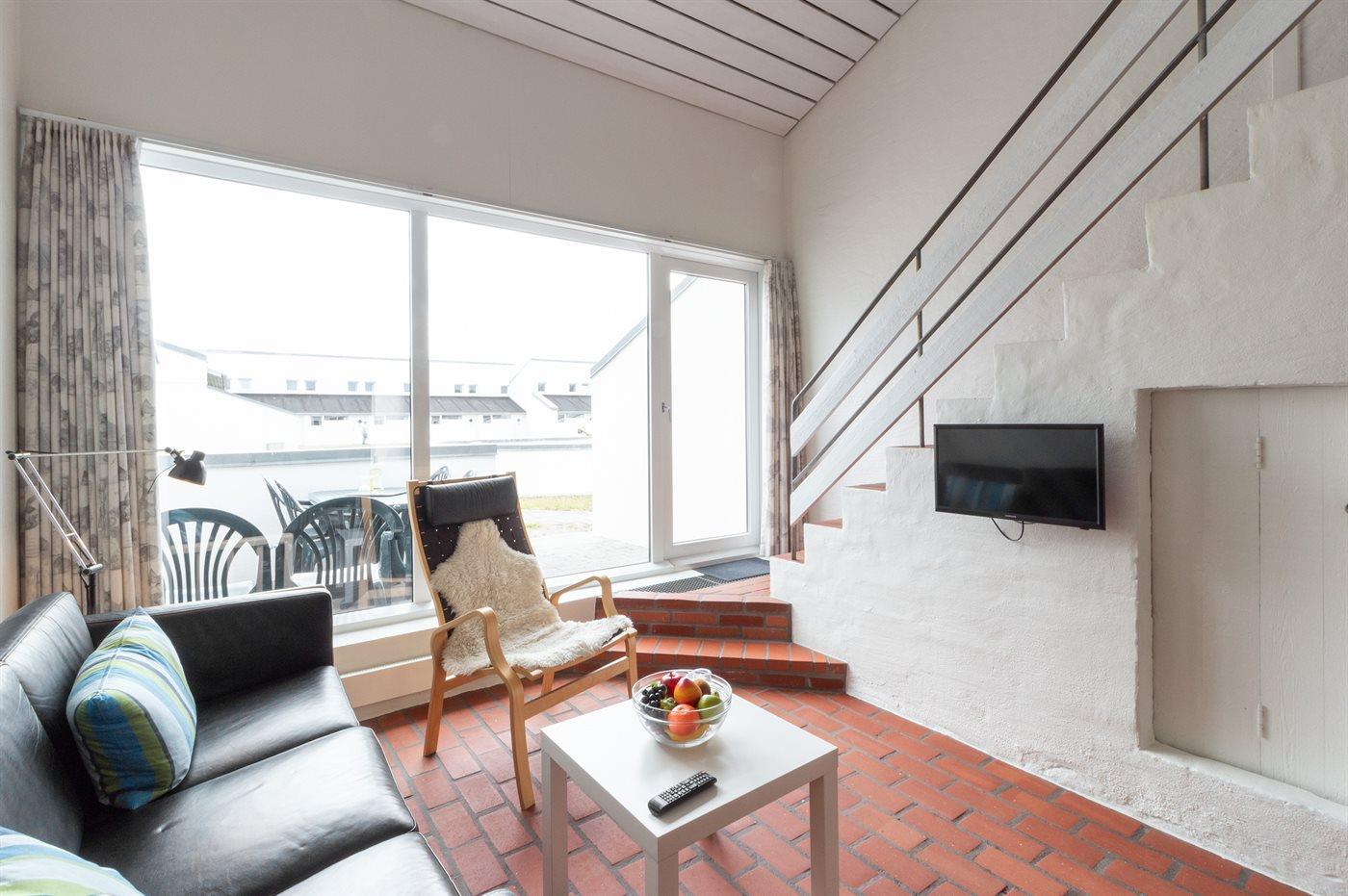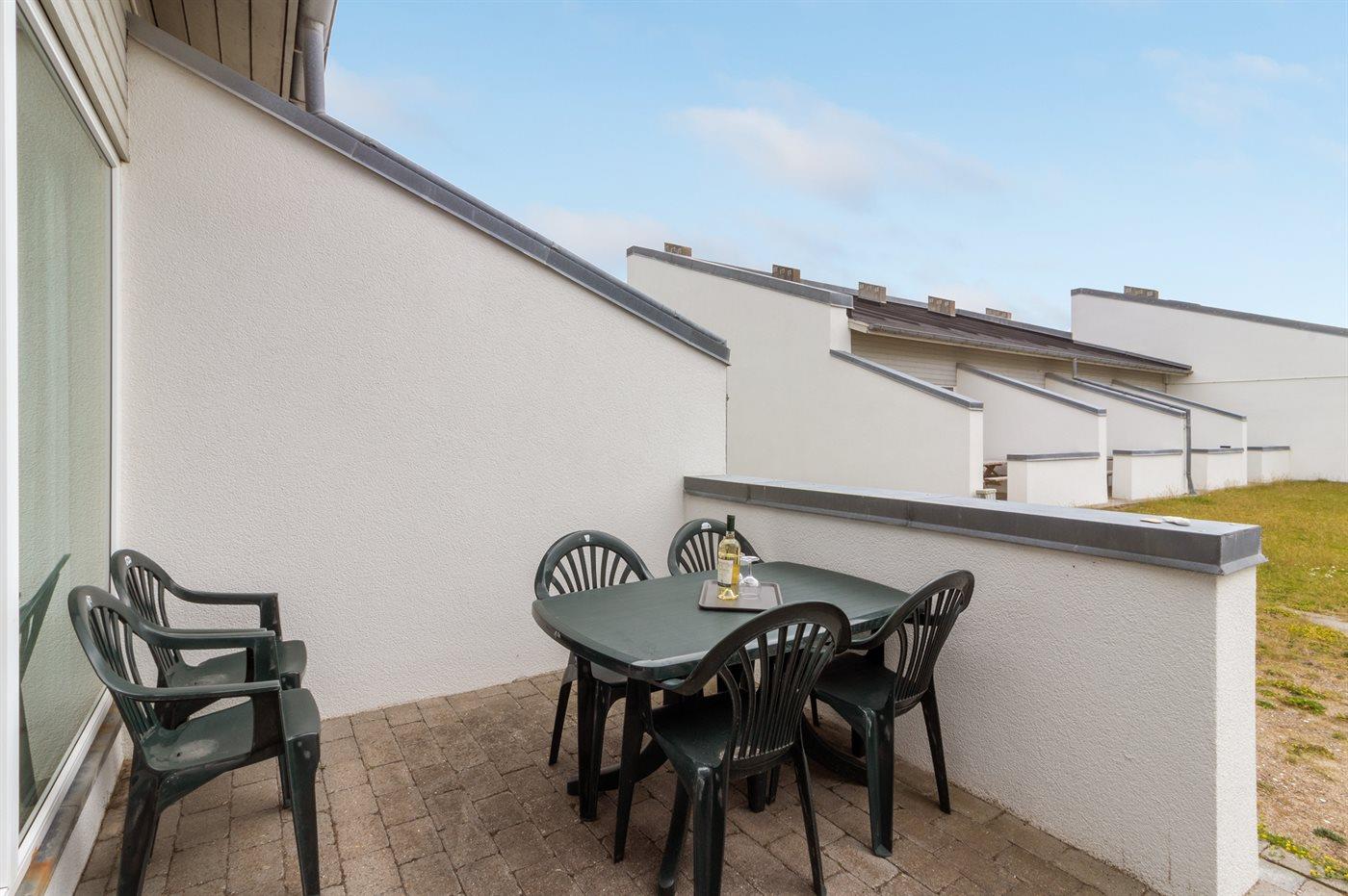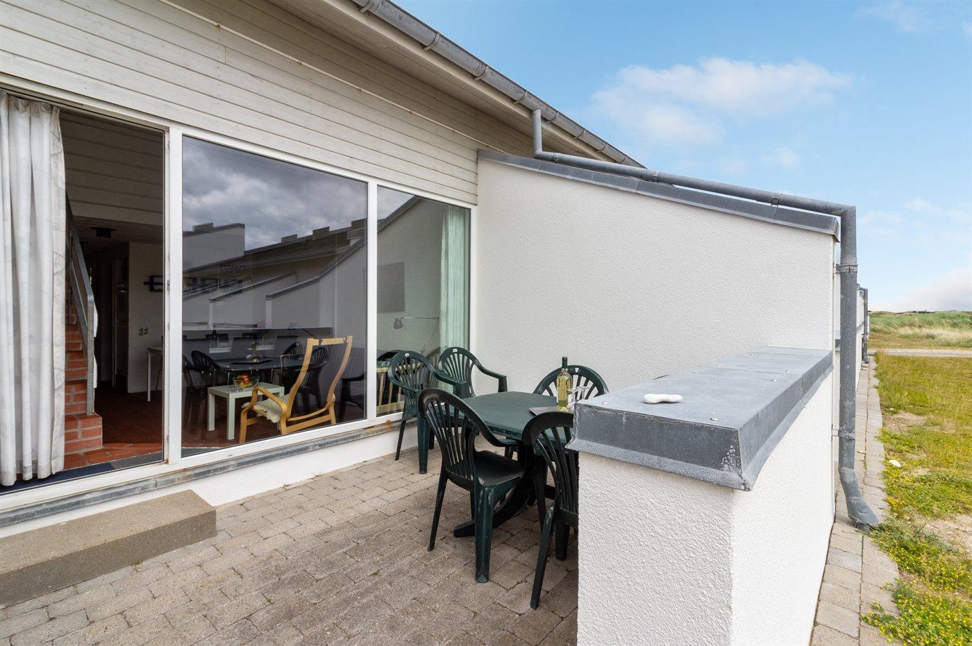 Hyggelig ferielejlighed ved Vesterhavet med terrasse, adgang til pool og sauna i naturskønne Tranum Klit Hotel.