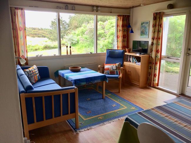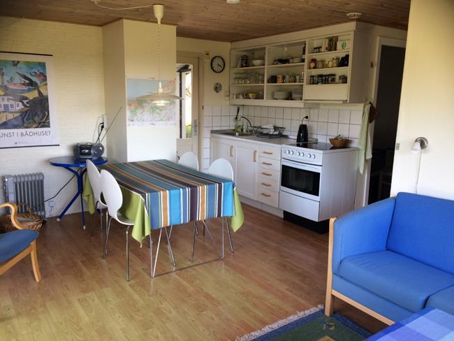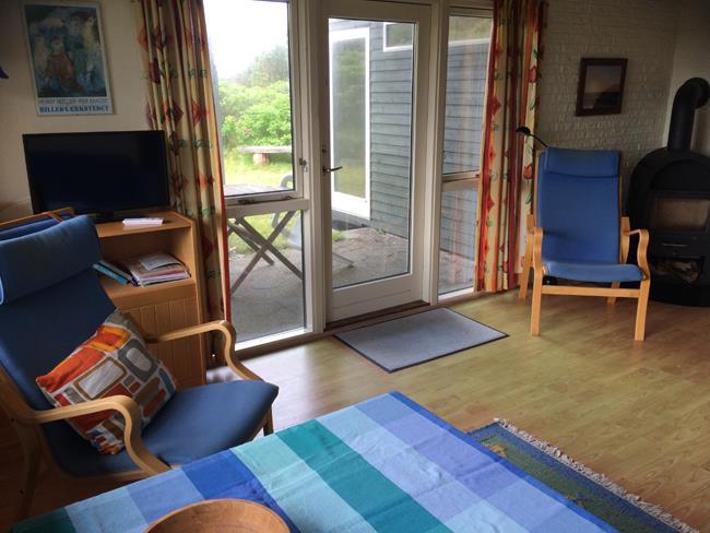 om eftermiddagen til langt ud på aftenen. Huset er på ca 60 m2. Entre med plads til overtøj, hyggelig stue med køkken og brændeovn, 1 rum med