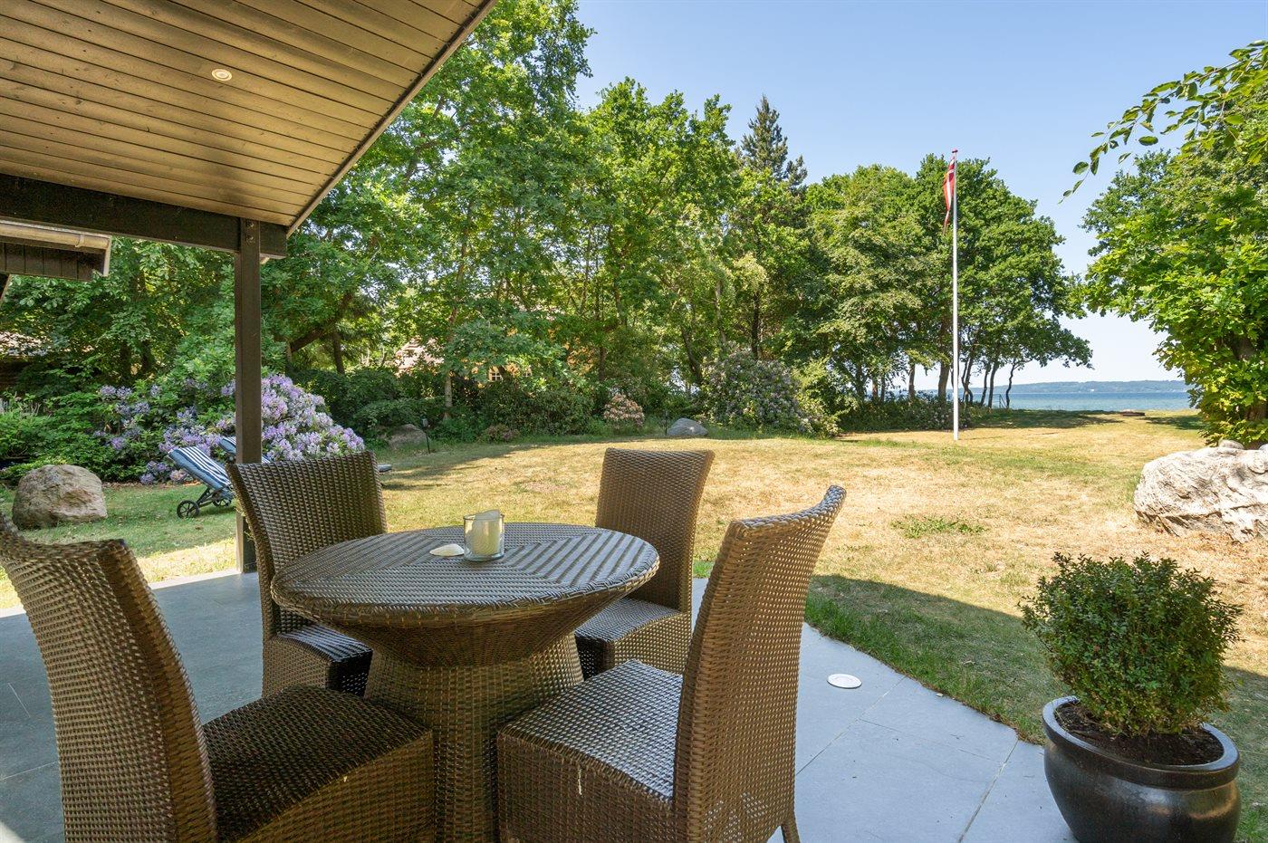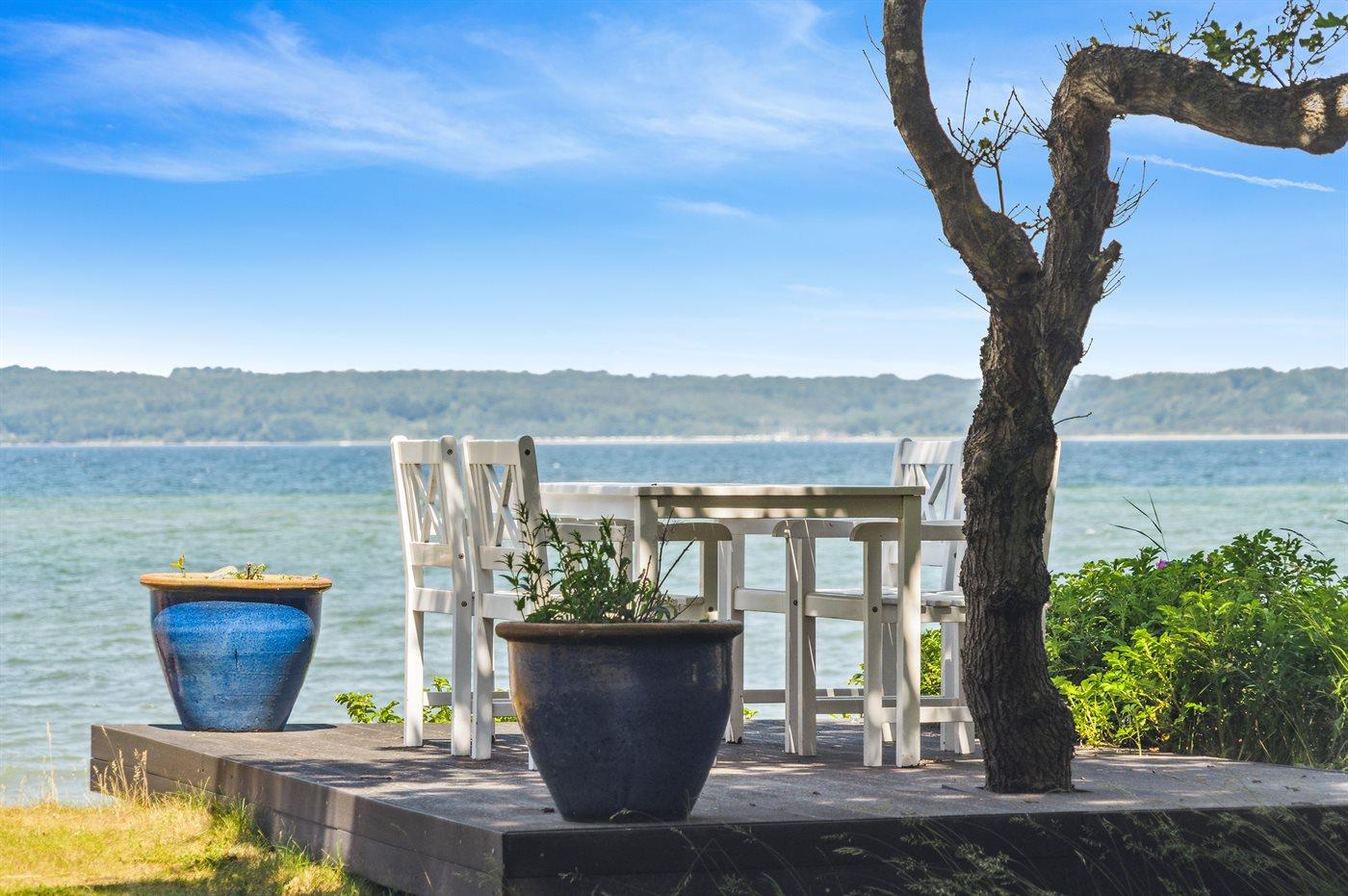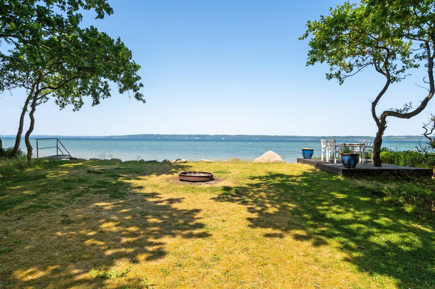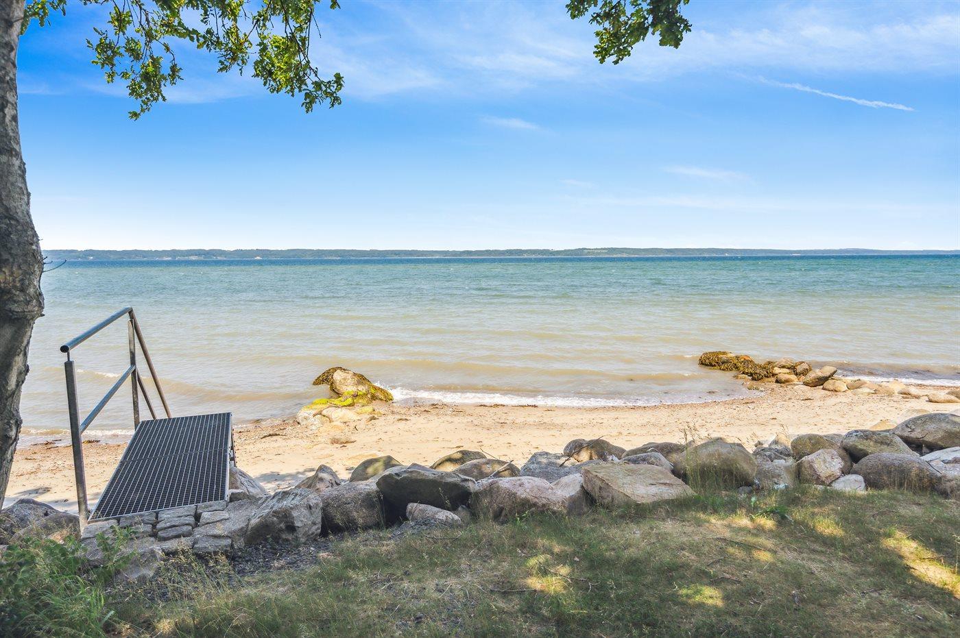 Dette særlige og utrolig flotte liebhaversommerhus har en beliggenhed, som er svær at beskrive med ord og ikke kan findes bedre. Sommerhuset ligger på en ca. 2700m2 stor grund omgivet af høje smukke træer på hver side af huset og fortsætter på hver side af den store græsplæne og dermed sikrer den helt perfekte ugenerte beliggenhed. Endnu mere unikt ligger smukke Vejle fjord lige for enden af græsplænen - udsigten herfra er bjergtagende lige gyldig hvilken retning blikket vandrer. Det er en unik kombination af fjorden og det smukke landskab, hvor Hvidbjerg klit kan ses på venstre side og spidsen af Juelsminde ses også. Man kan sidde i havemøblerne for enden af grunden med et glas vin eller en kop kaffe og tage ganske få skridt for så at hoppe i fjorden, som har en fin sandbund.