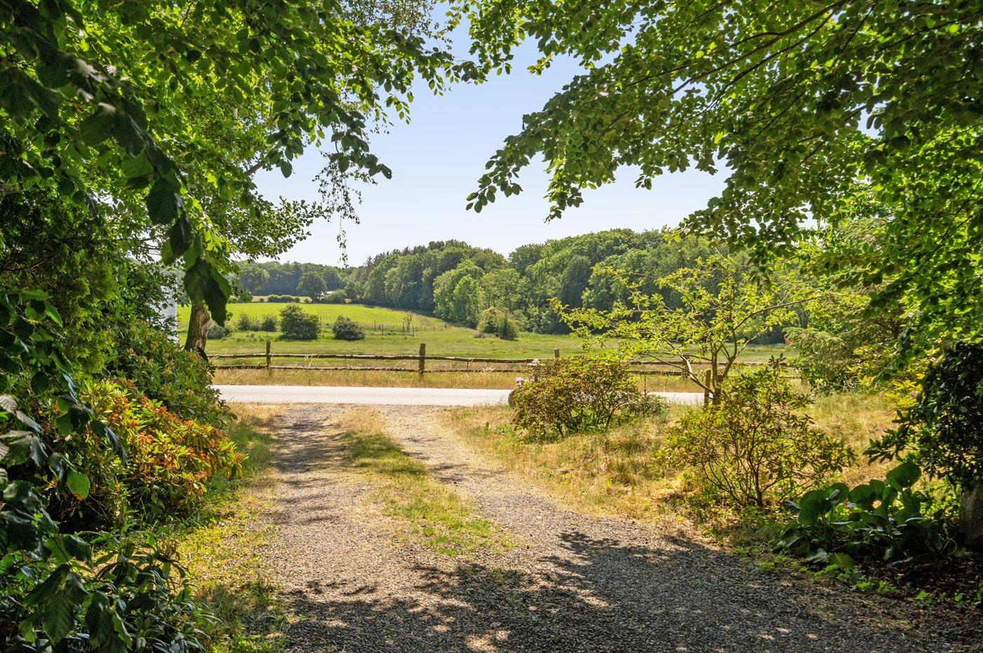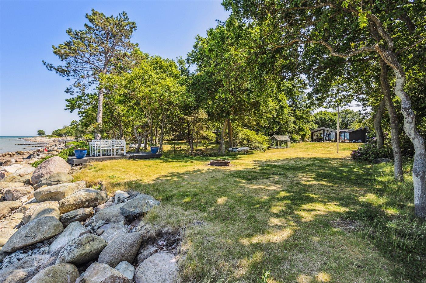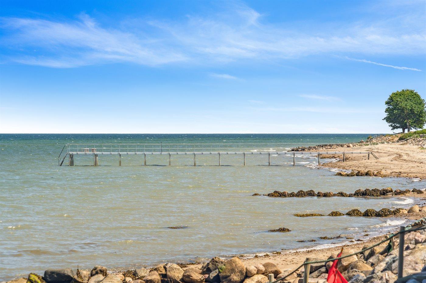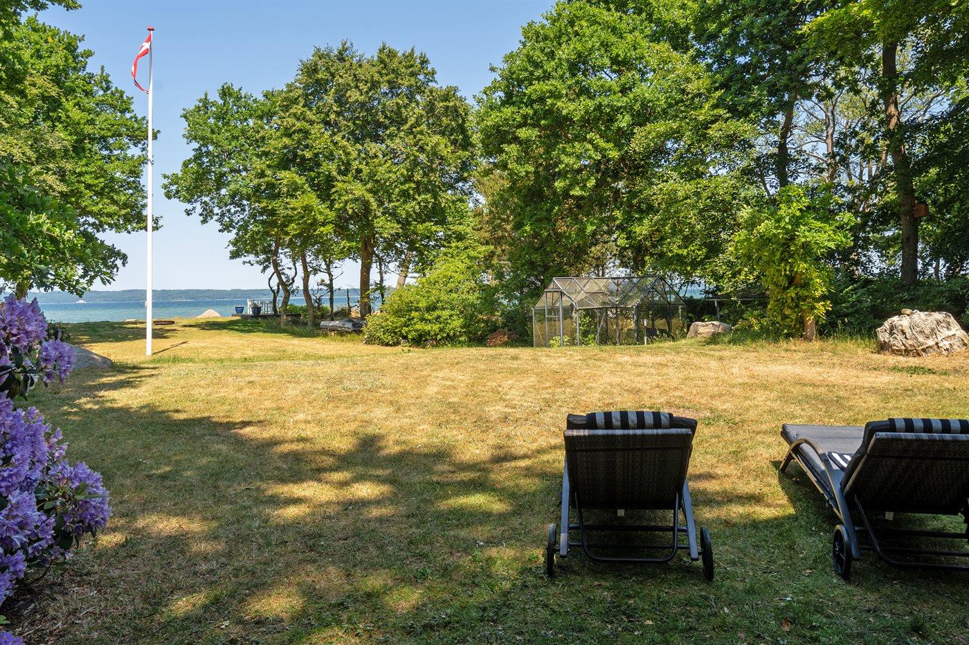 Dette særlige og utrolig flotte liebhaversommerhus har en beliggenhed, som er svær at beskrive med ord og ikke kan findes bedre. Sommerhuset ligger på en ca. 2700m2 stor grund omgivet af høje smukke træer på hver side af huset og fortsætter på hver side af den store græsplæne og dermed sikrer den helt perfekte ugenerte beliggenhed. Endnu mere unikt ligger smukke Vejle fjord lige for enden af græsplænen - udsigten herfra er bjergtagende lige gyldig hvilken retning blikket vandrer. Det er en unik kombination af fjorden og det smukke landskab, hvor Hvidbjerg klit kan ses på venstre side og spidsen af Juelsminde ses også. Man kan sidde i havemøblerne for enden af grunden med et glas vin eller en kop kaffe og tage ganske få skridt for så at hoppe i fjorden, som har en fin sandbund.
