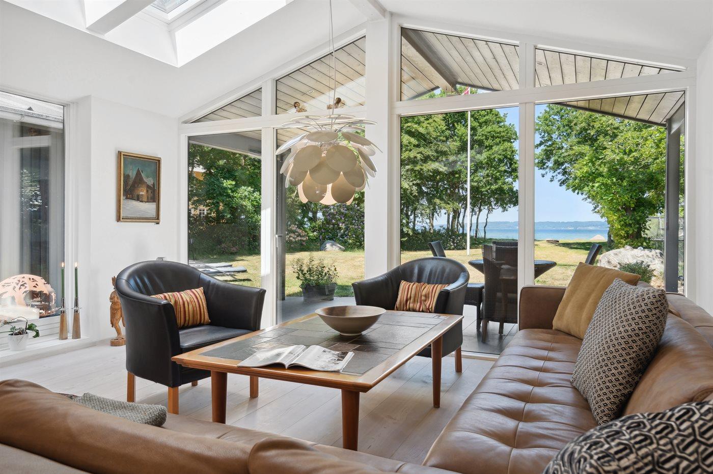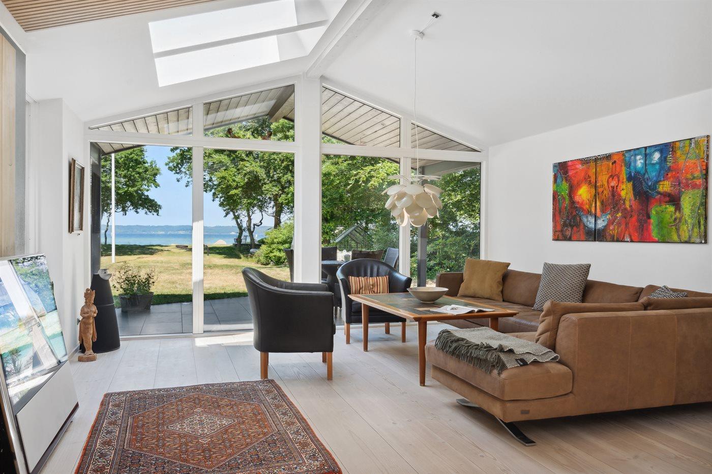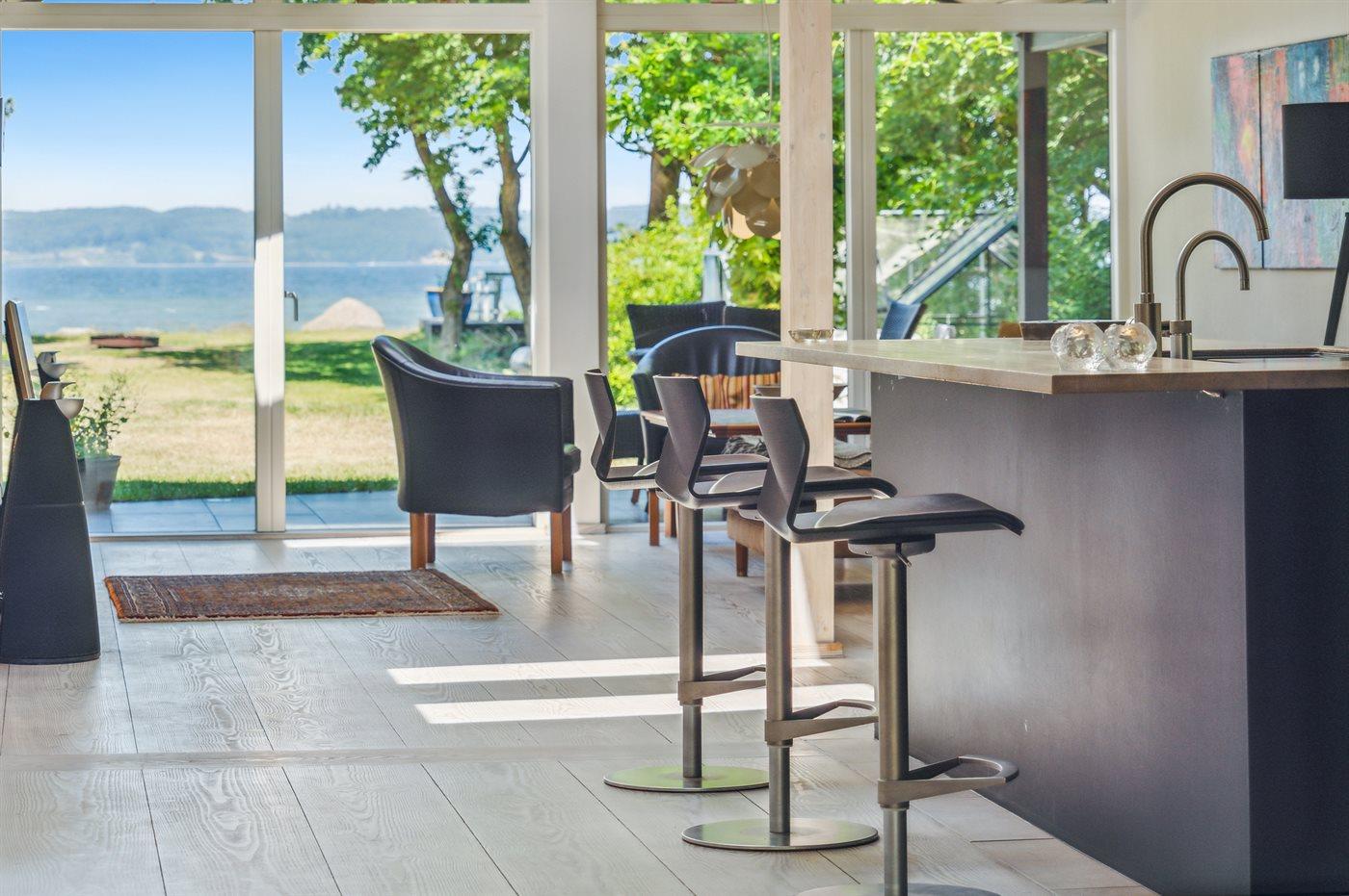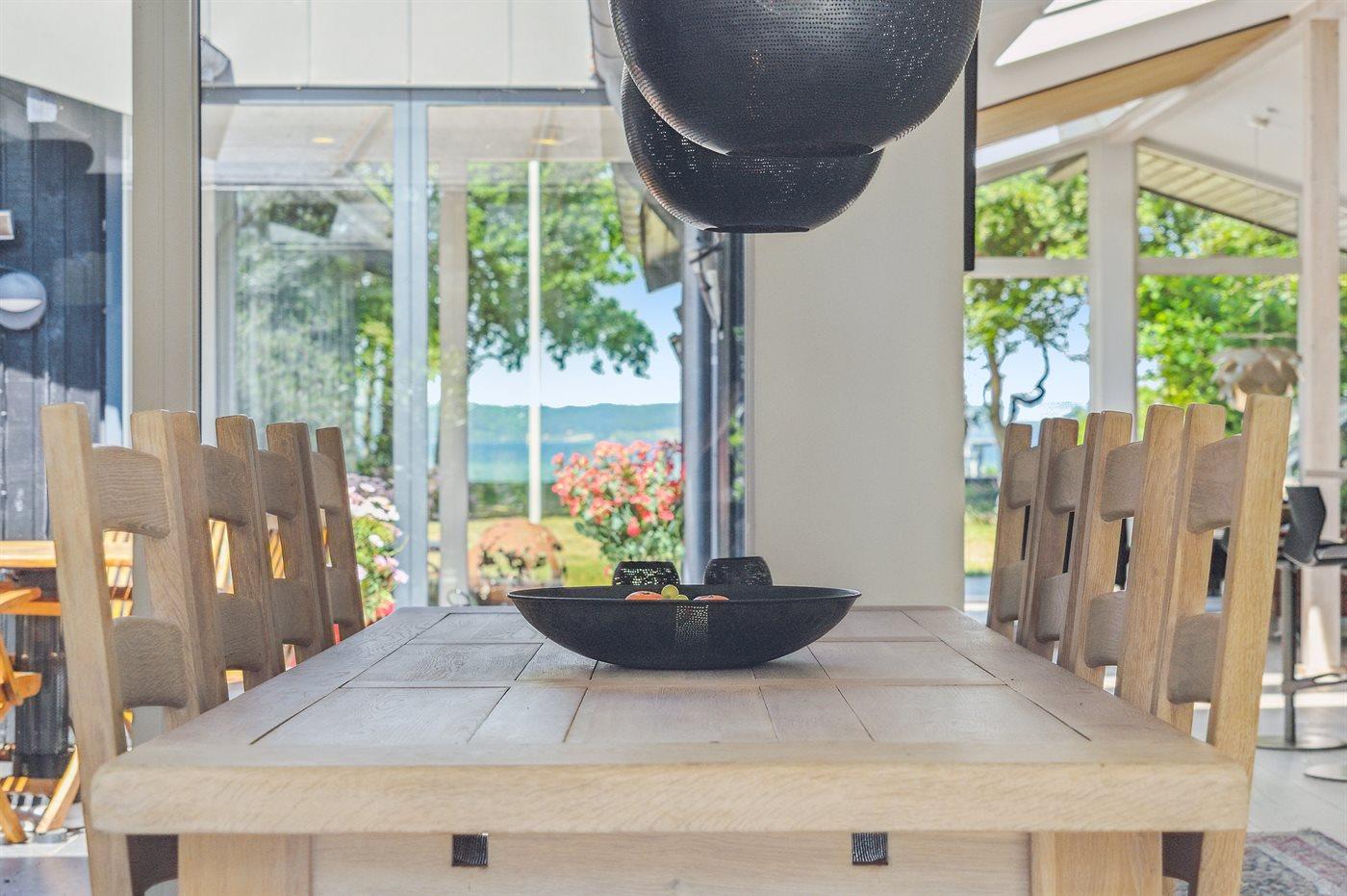 Ligesom beliggenheden er sommerhuset også noget ganske særligt - den unikke udsigt går igen fra de fleste rum - lige fra det smukke og store køkken/alrum, hvor stuen kommer i forlængelse af og med et stort glasparti rettet imod fjorden, til det smukke soveværelse, hvor udsigten igen er unik. Sommerhuset er løbende vedligeholdt og fremstår i utrolig god stand. Fra den store terrasse kan der bruges timevis på at nyde disse helt særlige omgivelser og tag en spadseretur på ca. 30 meter henover græsplænen og man står igen i vandkanten. Her findes flere fantastiske terrasse på nærmest alle sider af huset, så der altid er mulighed for at nyde solen og sidde fuldstændig ugeneret. Terrassen på venstre side af huset findes der tilmed en stor jacuzzi, som hele familien kan sidde i eller blot forældre, der ønsker at nyde et glas vin på dette helt unikke sted for bagefter at tage en tur under den udendørs bruser eller tage en svømmetur i fjorden.